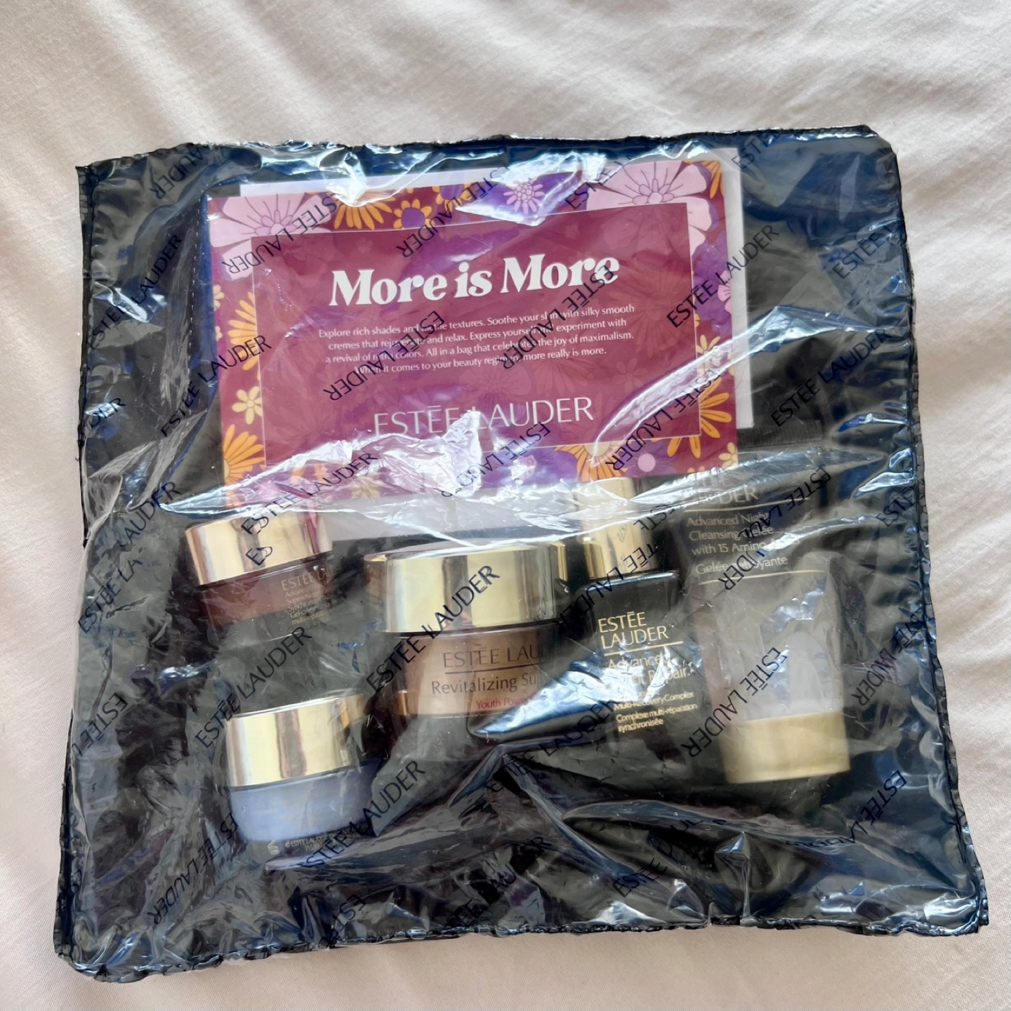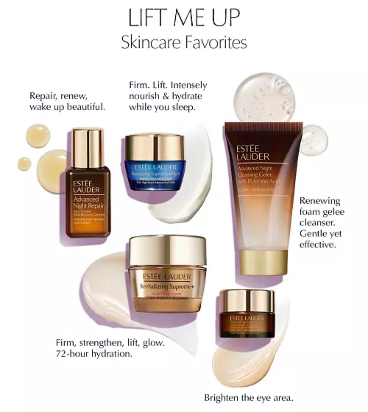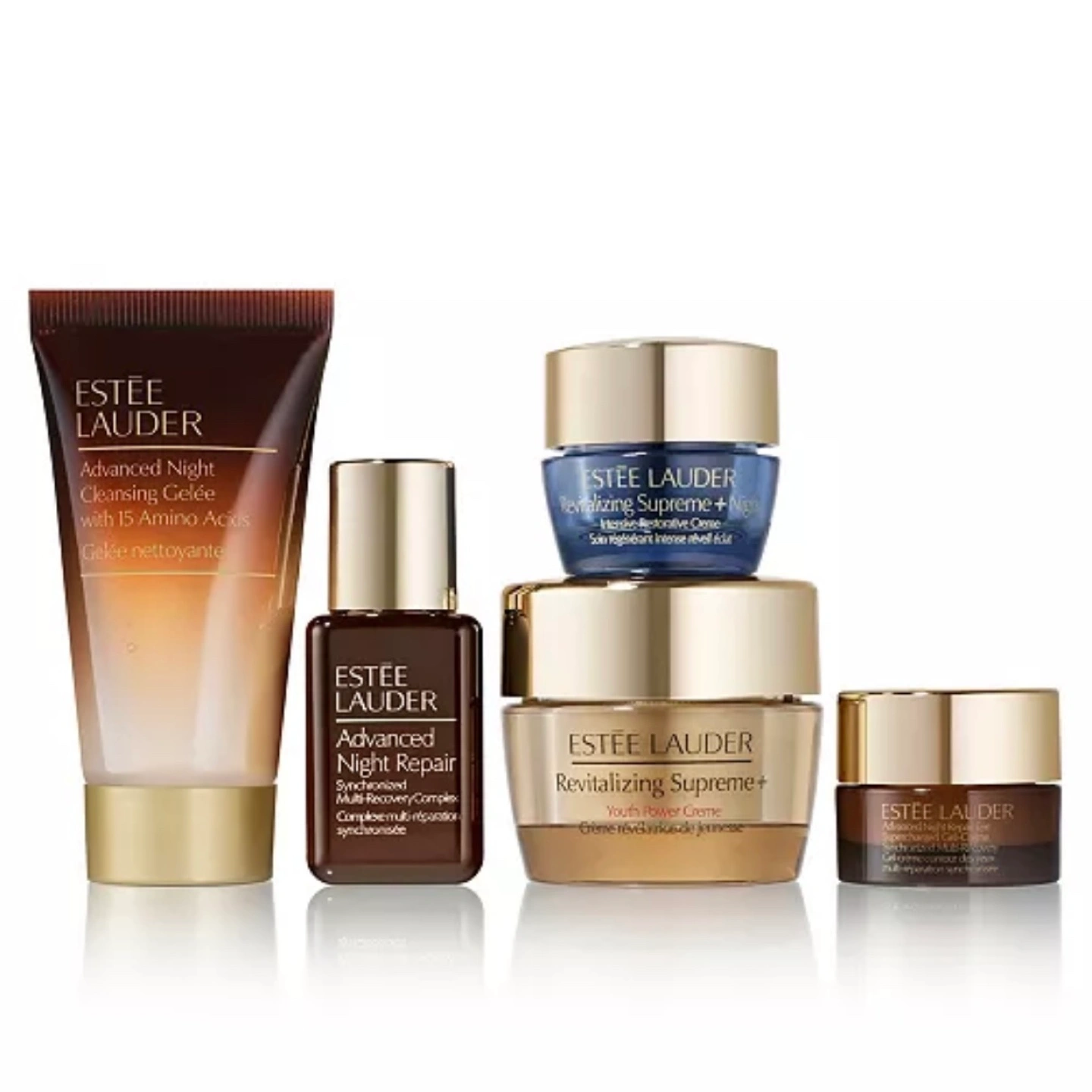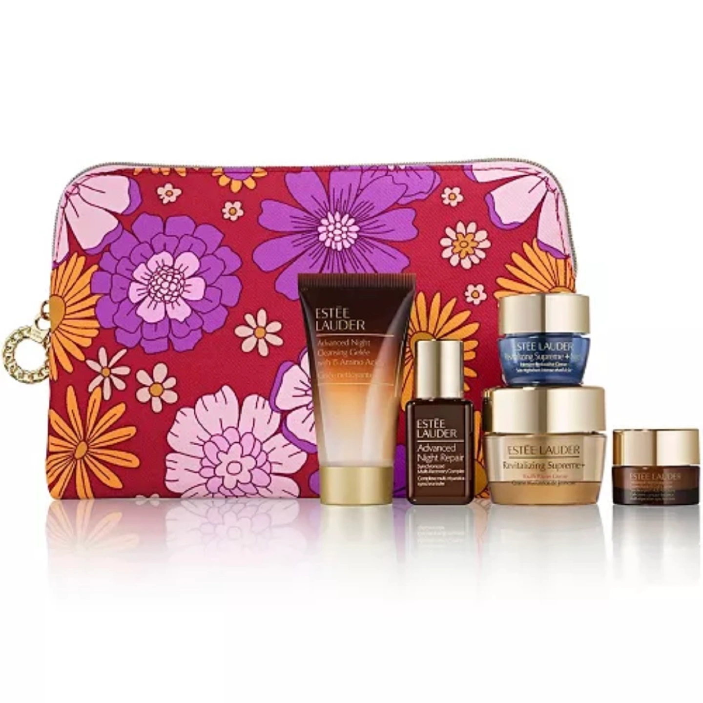 Estée Lauder skincare gift set. Includes cosmetic bag. Five skincare products. Perfect gift. * Advanced Night Cleansing Gelée, 1oz/30 ml * Advanced Night Repair Face Serum, 0.5oz/15 ml * Advanced Night Repair Eye Supercharged Gel-Crème, 0.17oz/5 ml * Revitalizing Supreme+ Youth Power Crème, 0.5oz/15 ml * Revitalizing Supreme+ Night Moisturizer, 0.24oz/7 ml