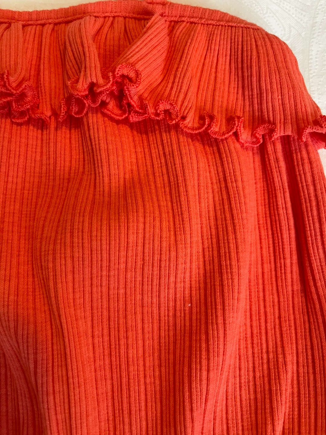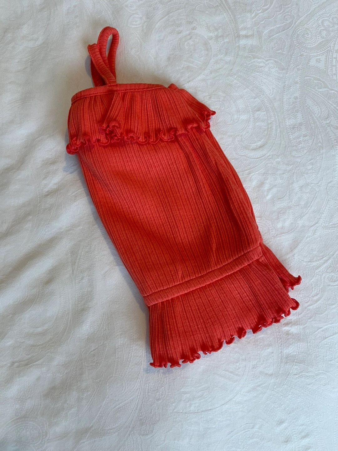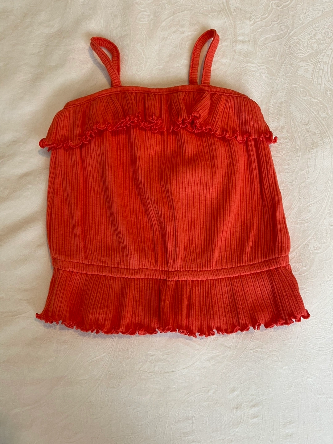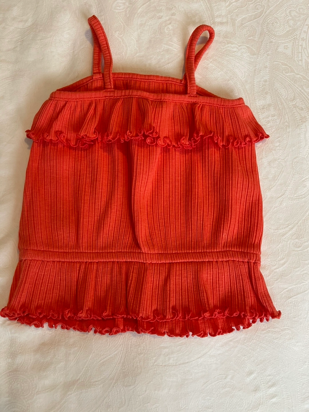 NWOT- Adorable girls' tank top. Features a ribbed fabric, coral colour, and ruffles at the neckline and hem. Perfect for summer.
