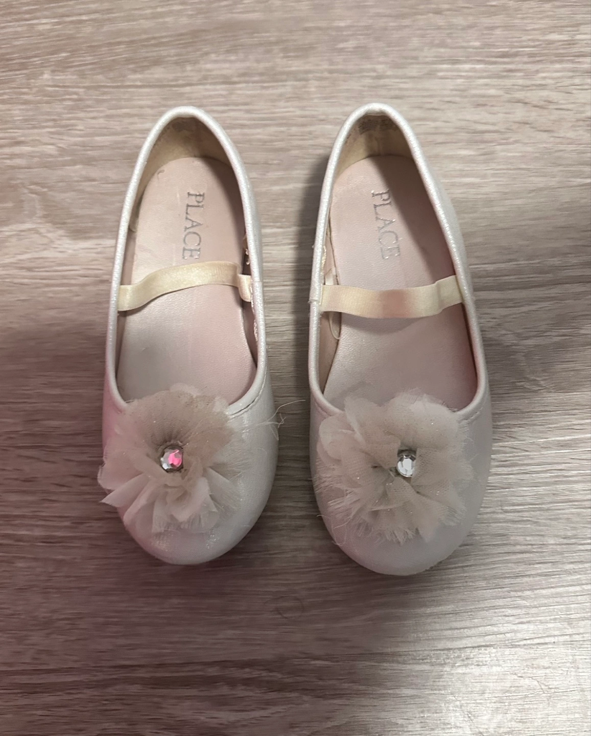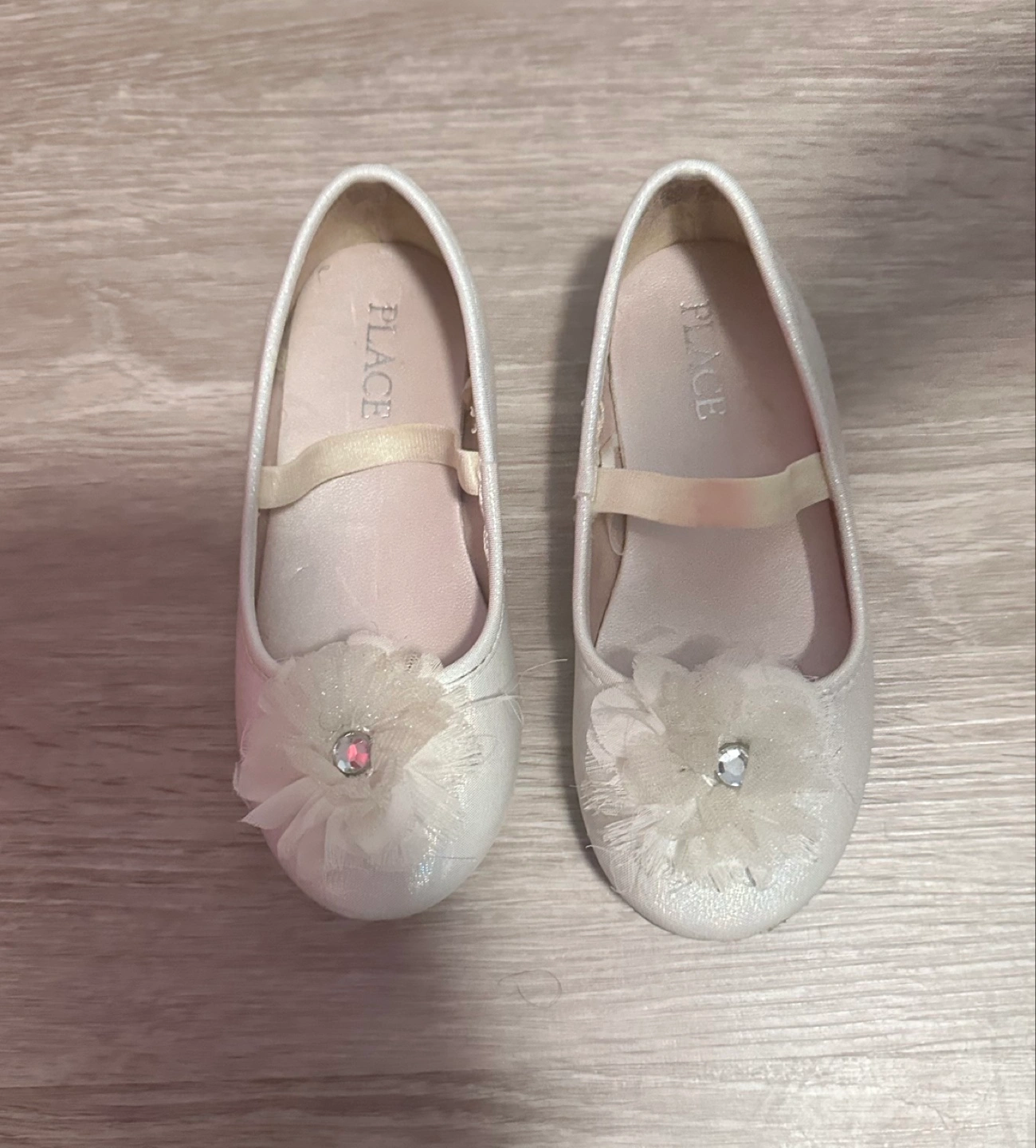 Adorable girls' flats. White sparkly fabric. Pretty flower embellishment. Perfect for special occasions.