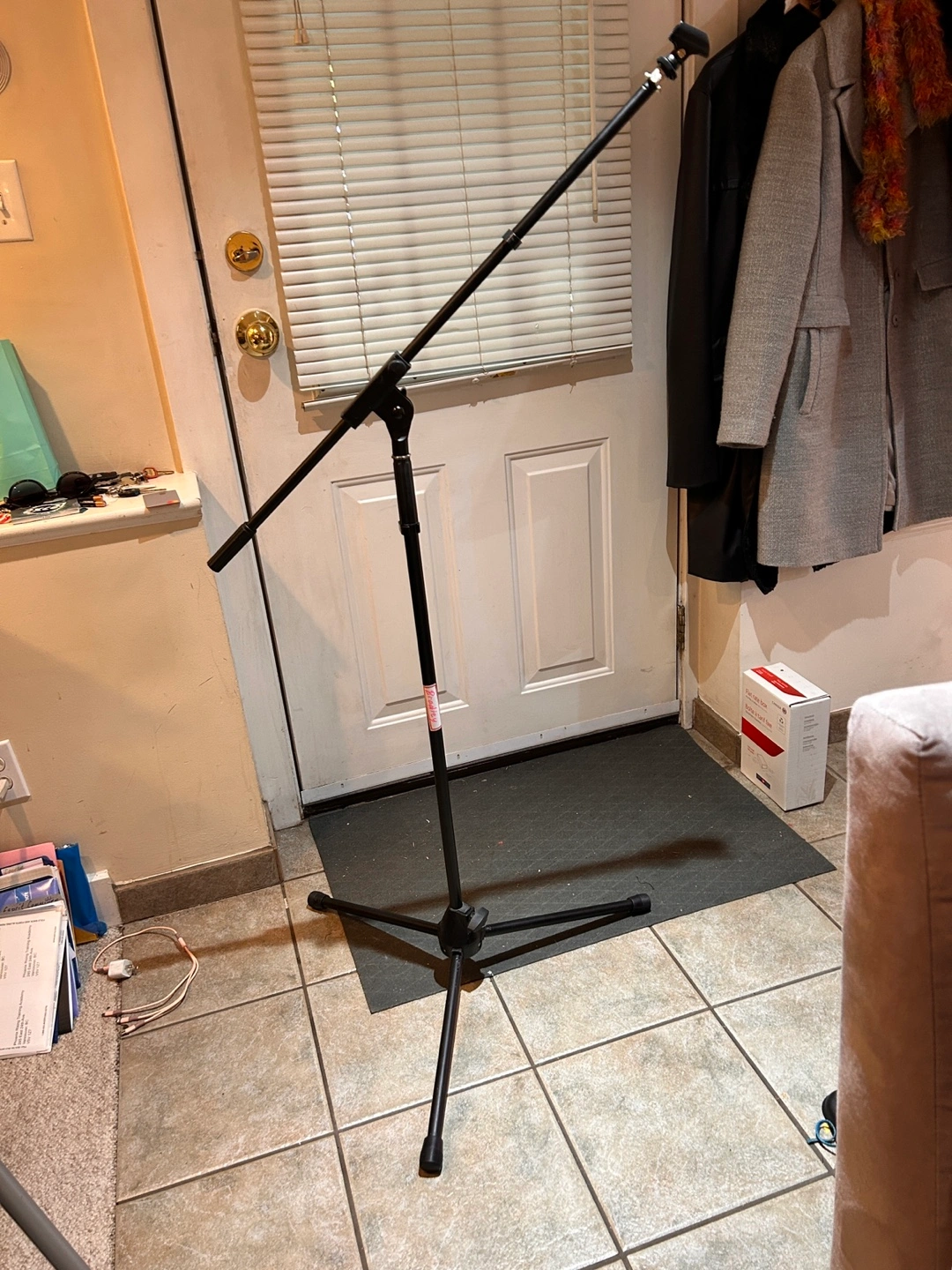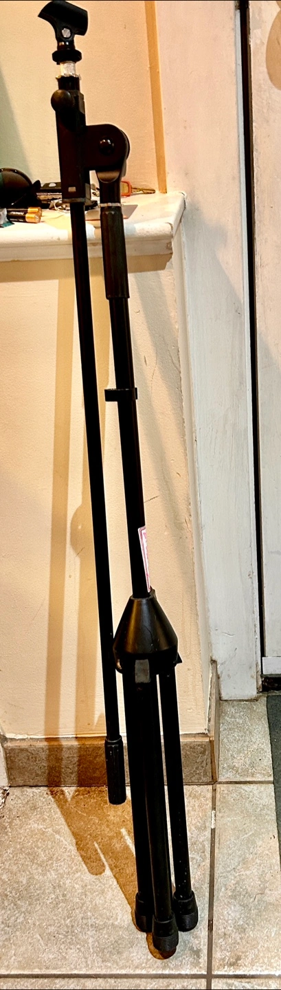 Good quality heavy duty boom microphone stand with mic holder. Solid construction and locks all working. Folds into small size for carrying or storage.