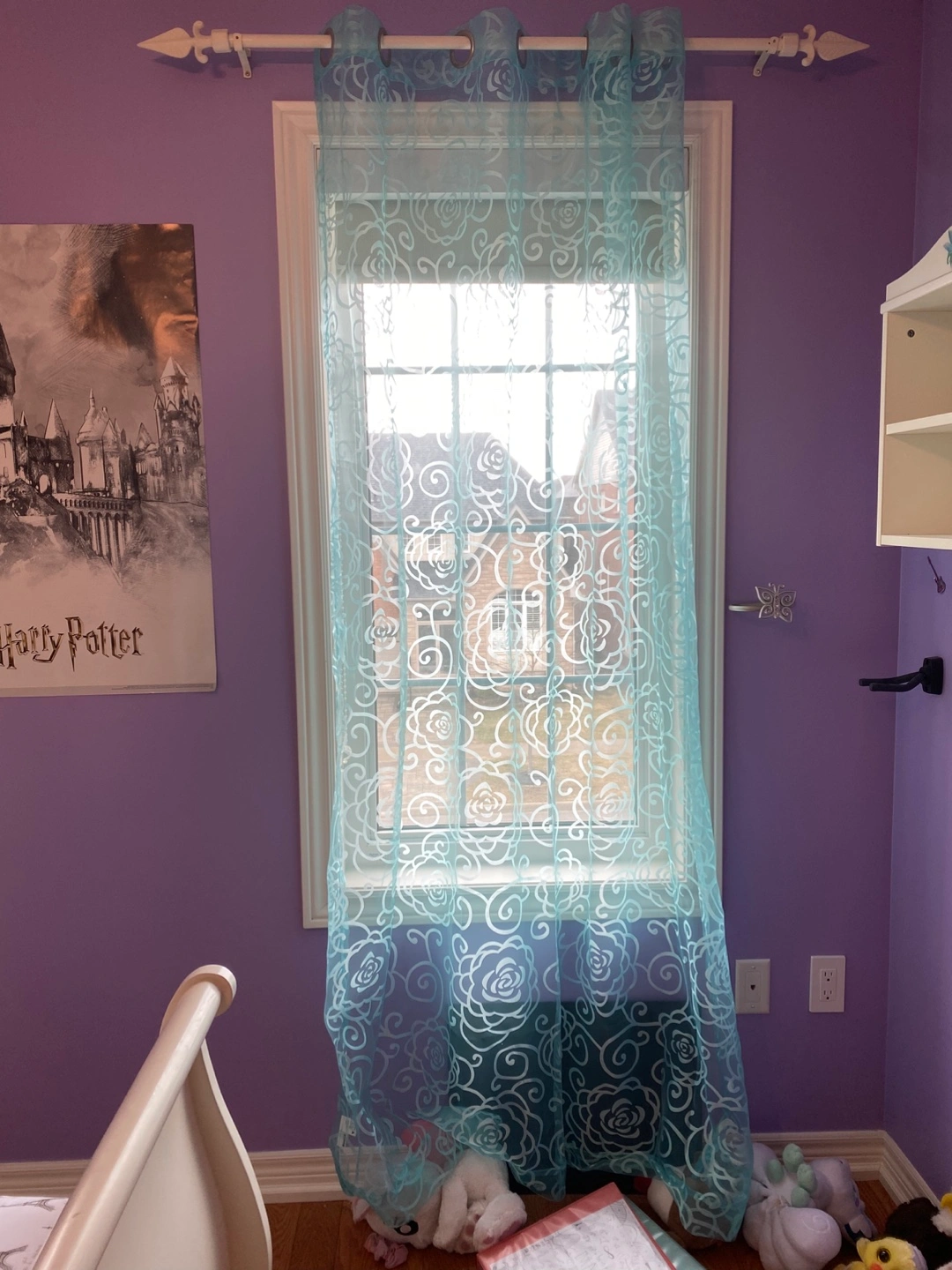 Light teal sheer curtains. 3 panels available. Suitable for a child's room. $5 per panel