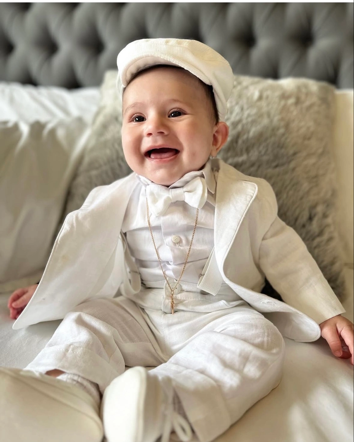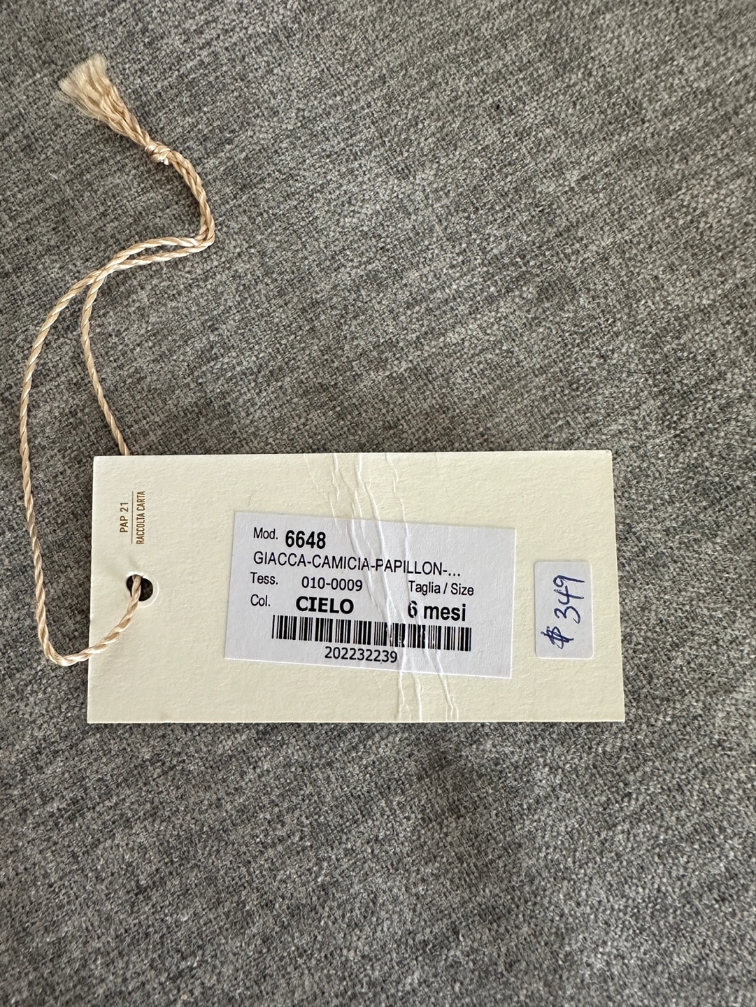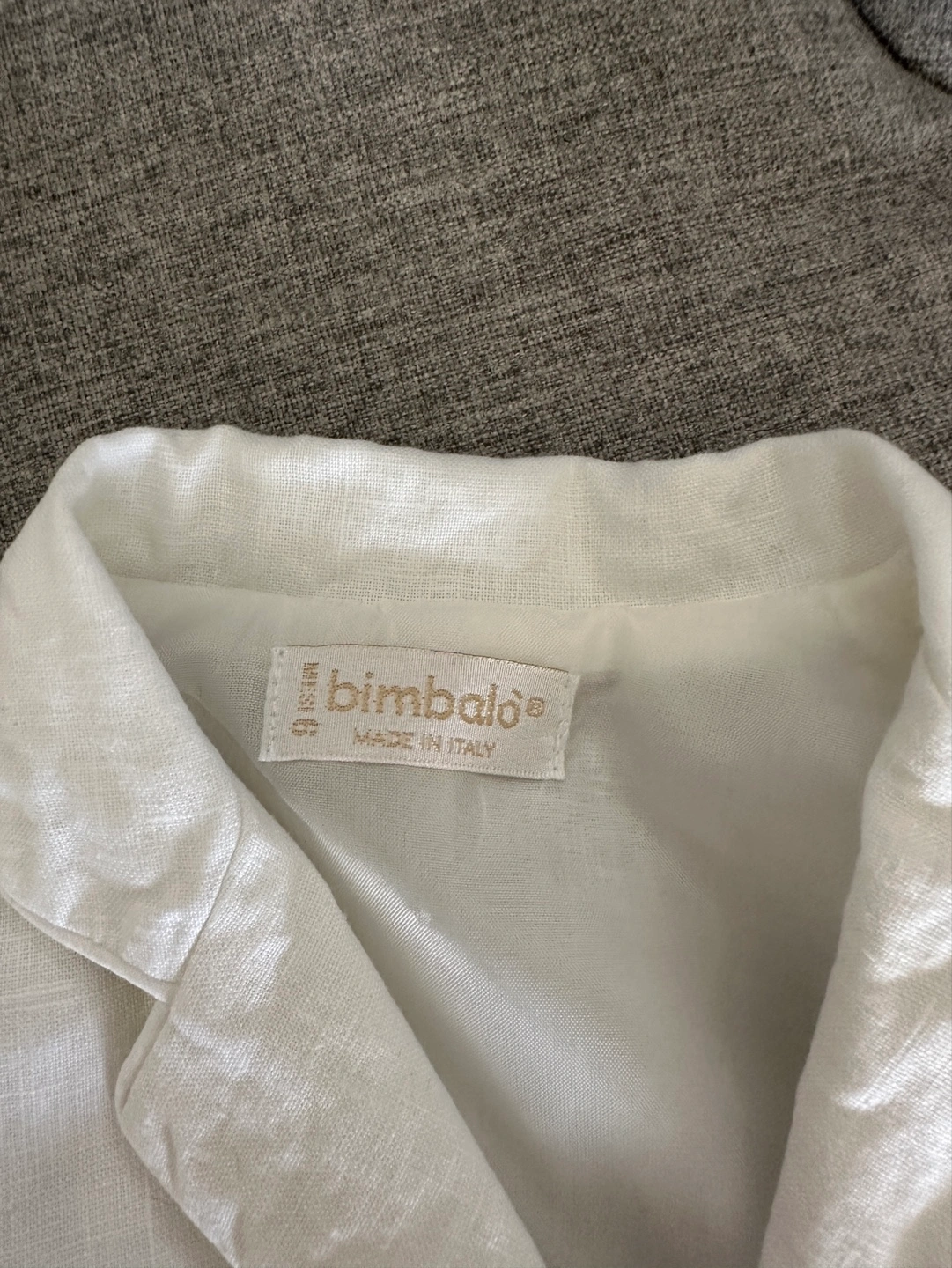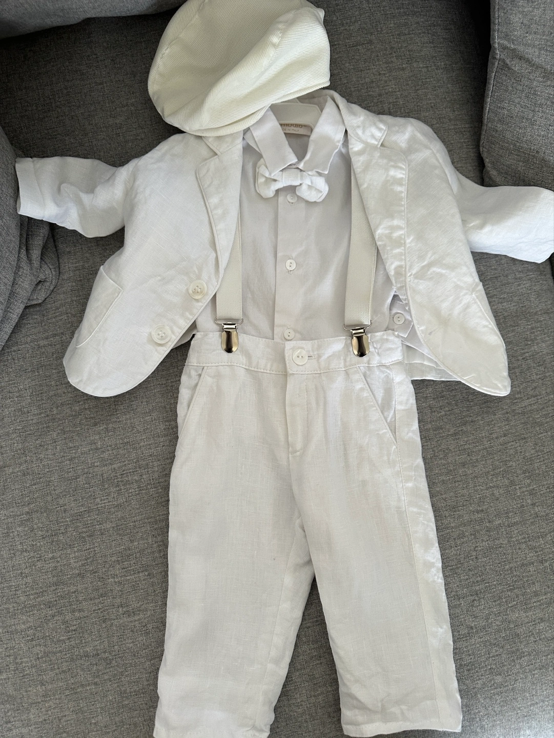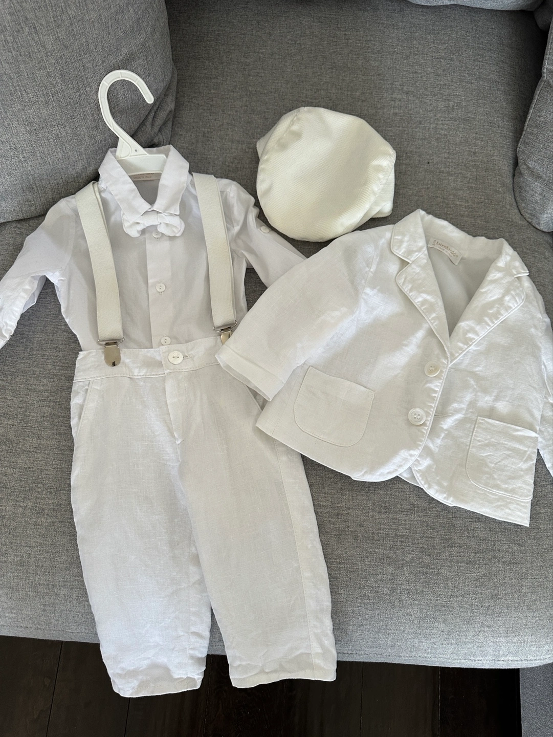 Excellent condition used once. Baby boy size 6 months (6-9) Comes with linen pants, dress shirt, blazer, suspenders, bow tie. Also including the hat. Selling the bib and loafers seperately. Made in italy.