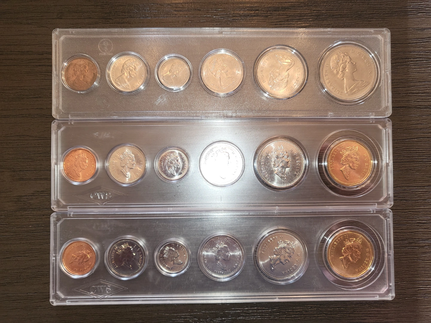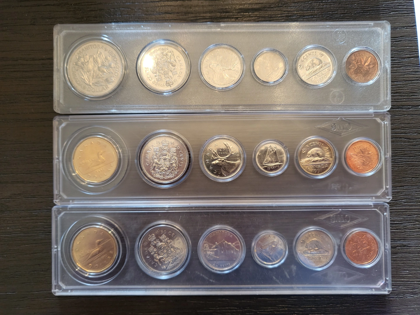 Three sets of Canadian proof coins in snap lock cases. Each set includes a penny, nickel, dime, quarter, 50 cent piece and Dollar.. Great for collectors. The years are 1970, 1992 1991 HAS SOLD. $25 EACH obo.
