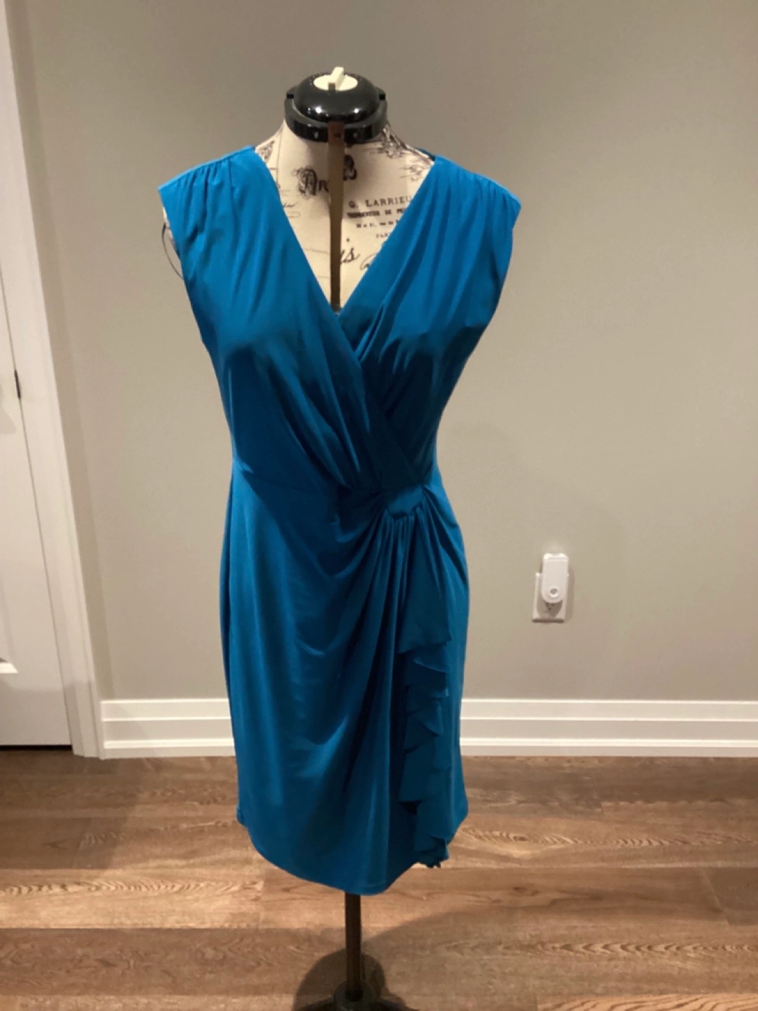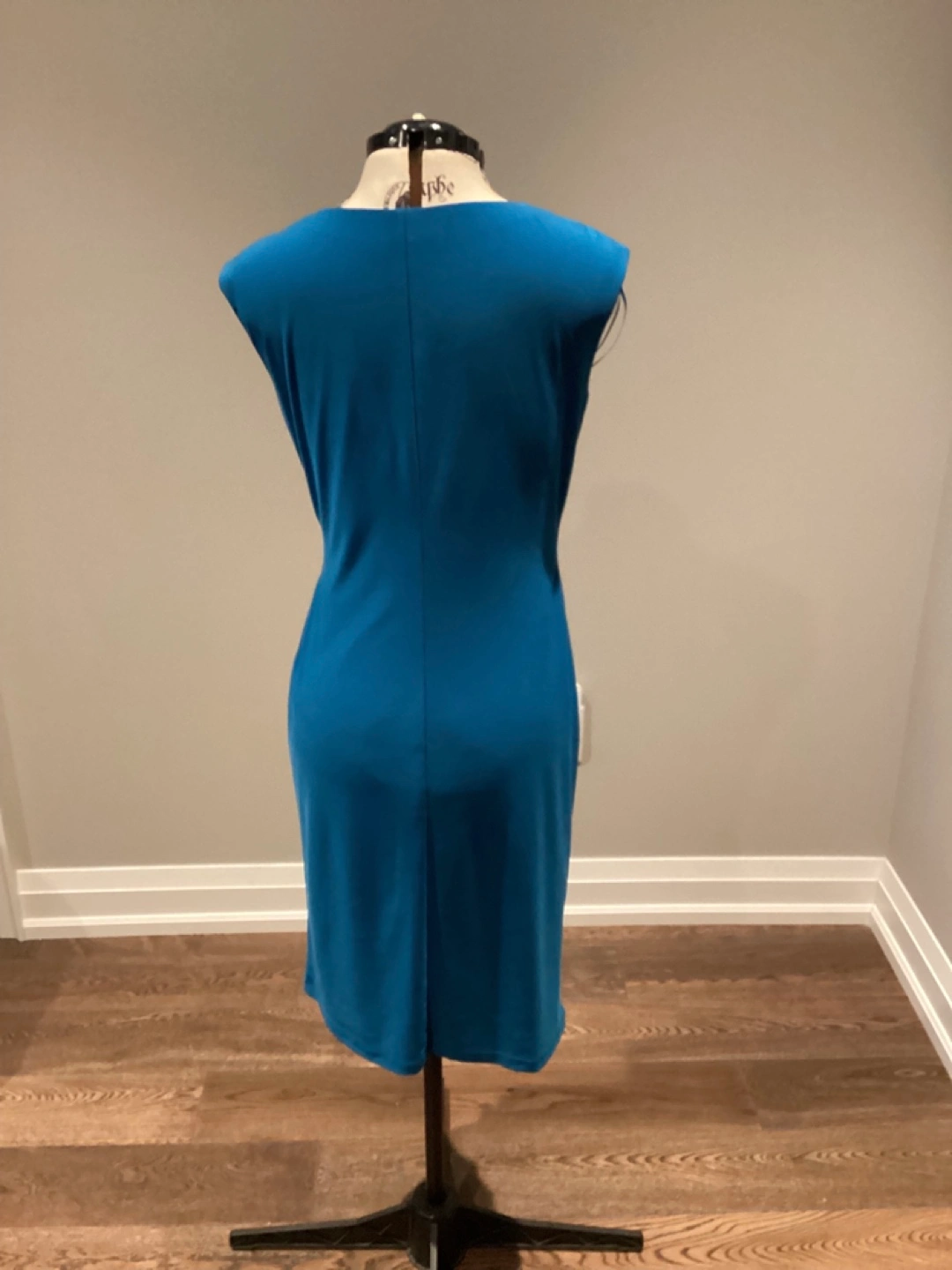 Cleo Turquoise Jersey Dress, fully lined, slips over the head, 95% Polyester 5% Spandex, linin 100% Polyester, Size 6, $12 or best offer. Chest 35” Waist 30” Centre back 38”