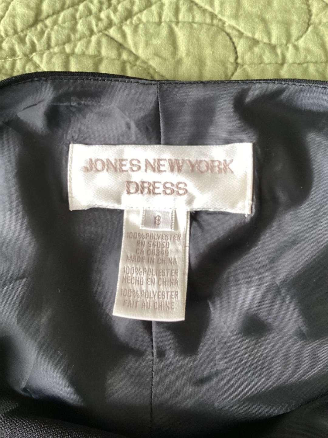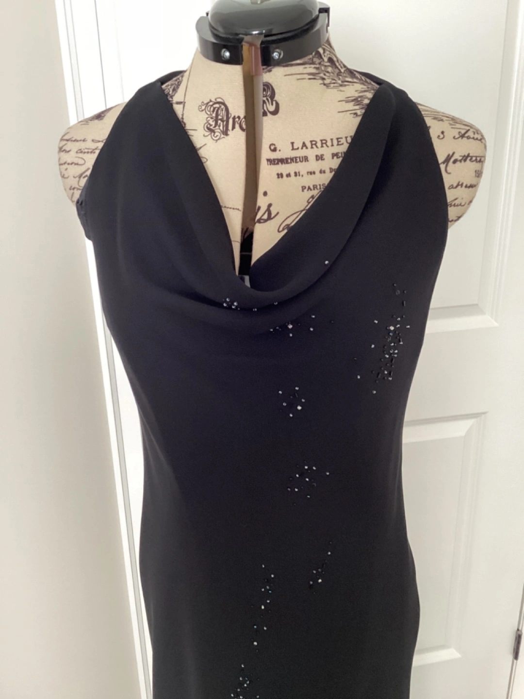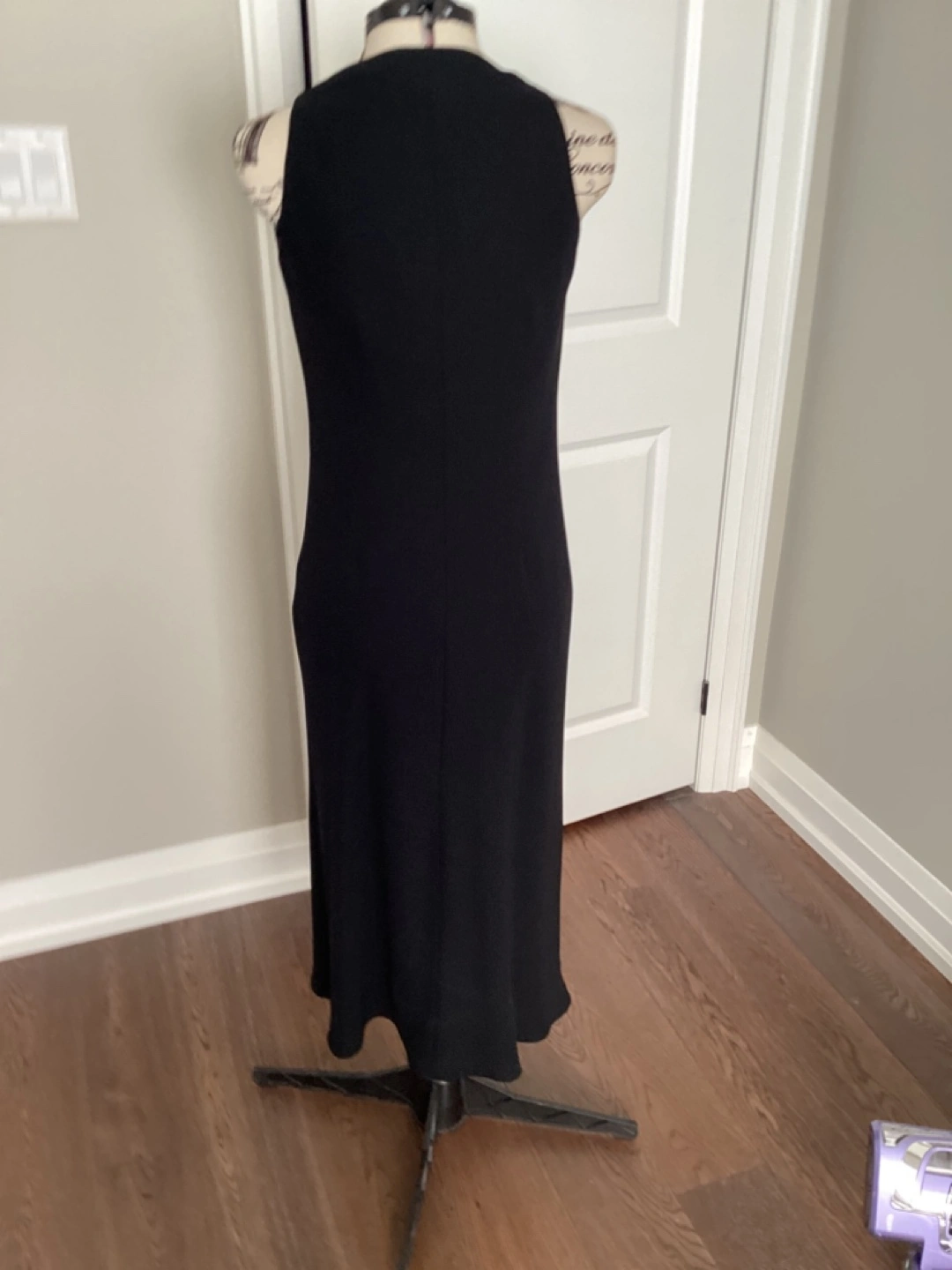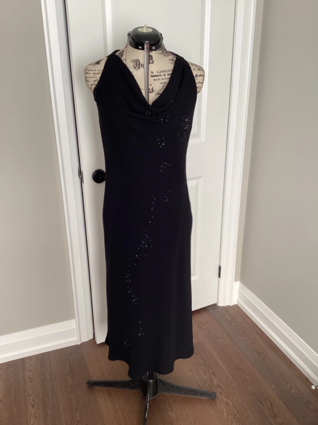 Jones New York Black Midi Dress, excellent condition, bead embellishments, fully lined, sleeveless, draped neckline, there is also a lingerie strap holder attached to the shoulder seam, bias cut which is very flattering on the body, Size 8, $20 or best offer. Chest 40” - this is large due to draped neckline Waist 38” Centre back length 48”