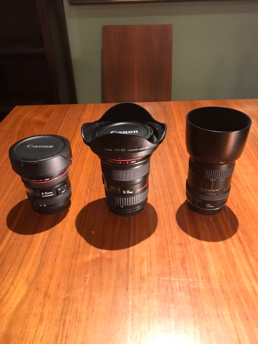 —————————————————————- (New open box) Canon lenses for professionals *Canon Fisheye Zoom Lens EF 8-15 mm 1:4L USM…. Paid $1700+tax=$1921 & Lens Hood $80+tax=$90.40 ——Total $2011.14 Sale price - $1290 ——————————————— *Canon Zoom Lens EF 16-35 mm 1:2.8 L ll USM …… Paid $2800+tax=$3164 Sale price - $1590 ——————————————— Canon Lens EF 135 mm 1:2.8…..paid $695+tax=$785.35 Sale price - $385 ——————————————— If you purchase all 3 lenses for your professional needs…. purchased (Brand New) price was $2011.14 + $3164 + $785.35 = $5960.49 *Sale price (New open box) is $1290 + $1590 + $95 = $3265 & Package Price is ——- $2999.00 ——————————————————- *Cash & Pick up only. ———————————————————‘