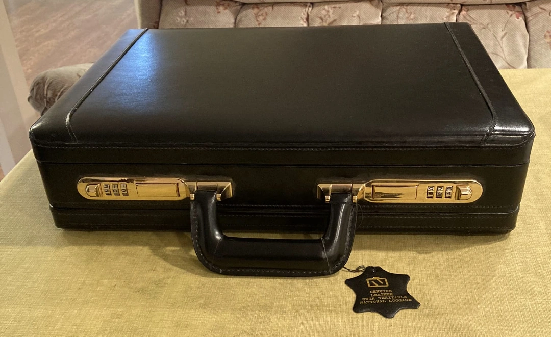 Black leather briefcase. Gold-toned hardware. Combination locks. Interior pockets and compartments. Great vintage condition. Ideal for lawyers, business professionals, or collectors.