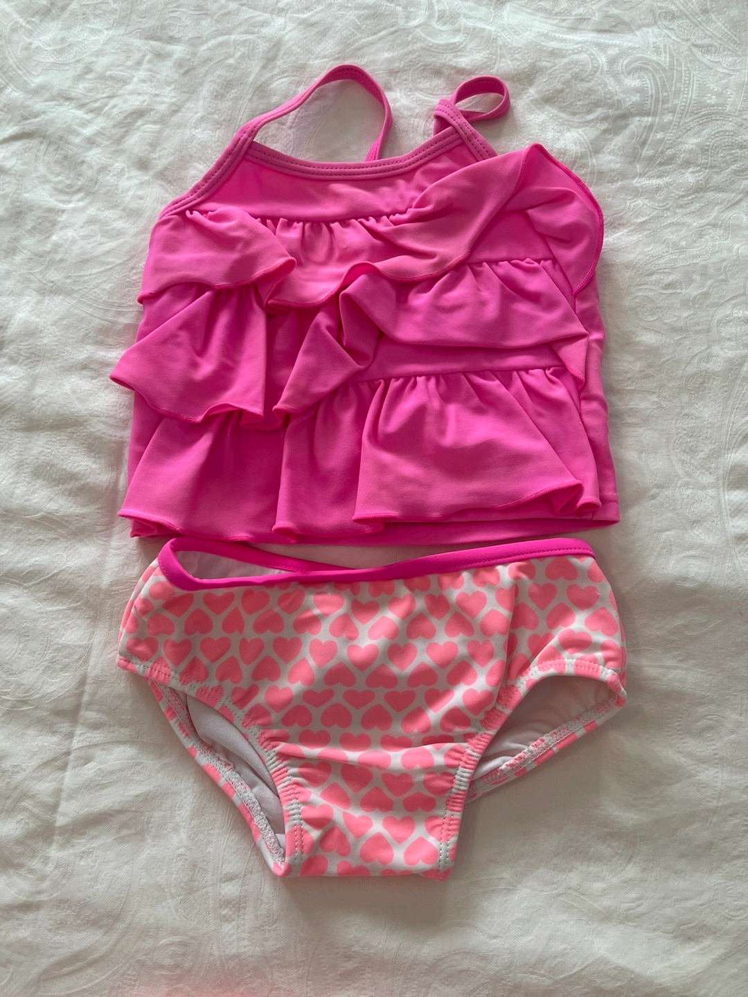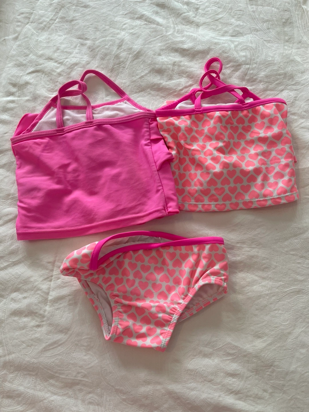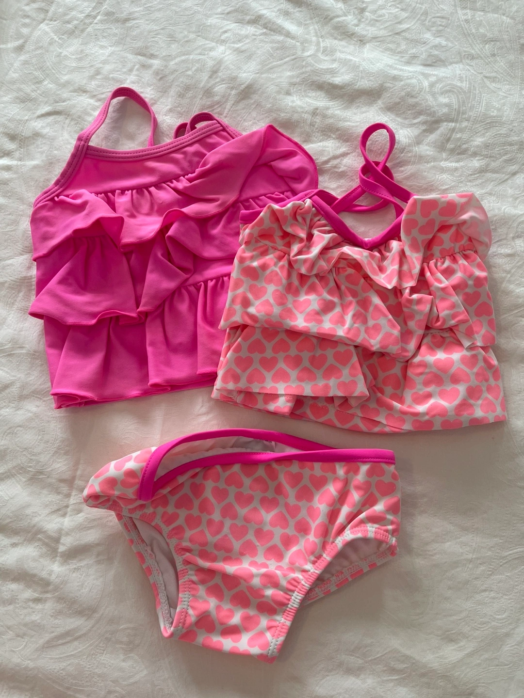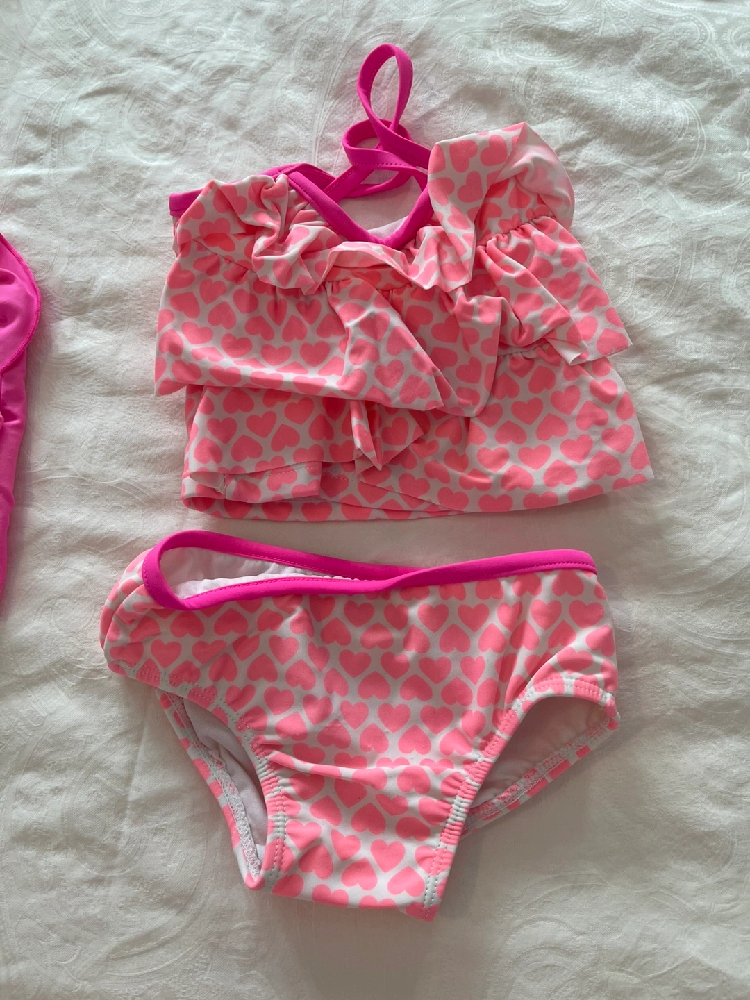 All are in good condition. No stretch or pulling. Adorable bundle includes two adorable girls' two-piece swimsuits. One solid pink and one with a pink heart pattern. Perfect for summer fun!
