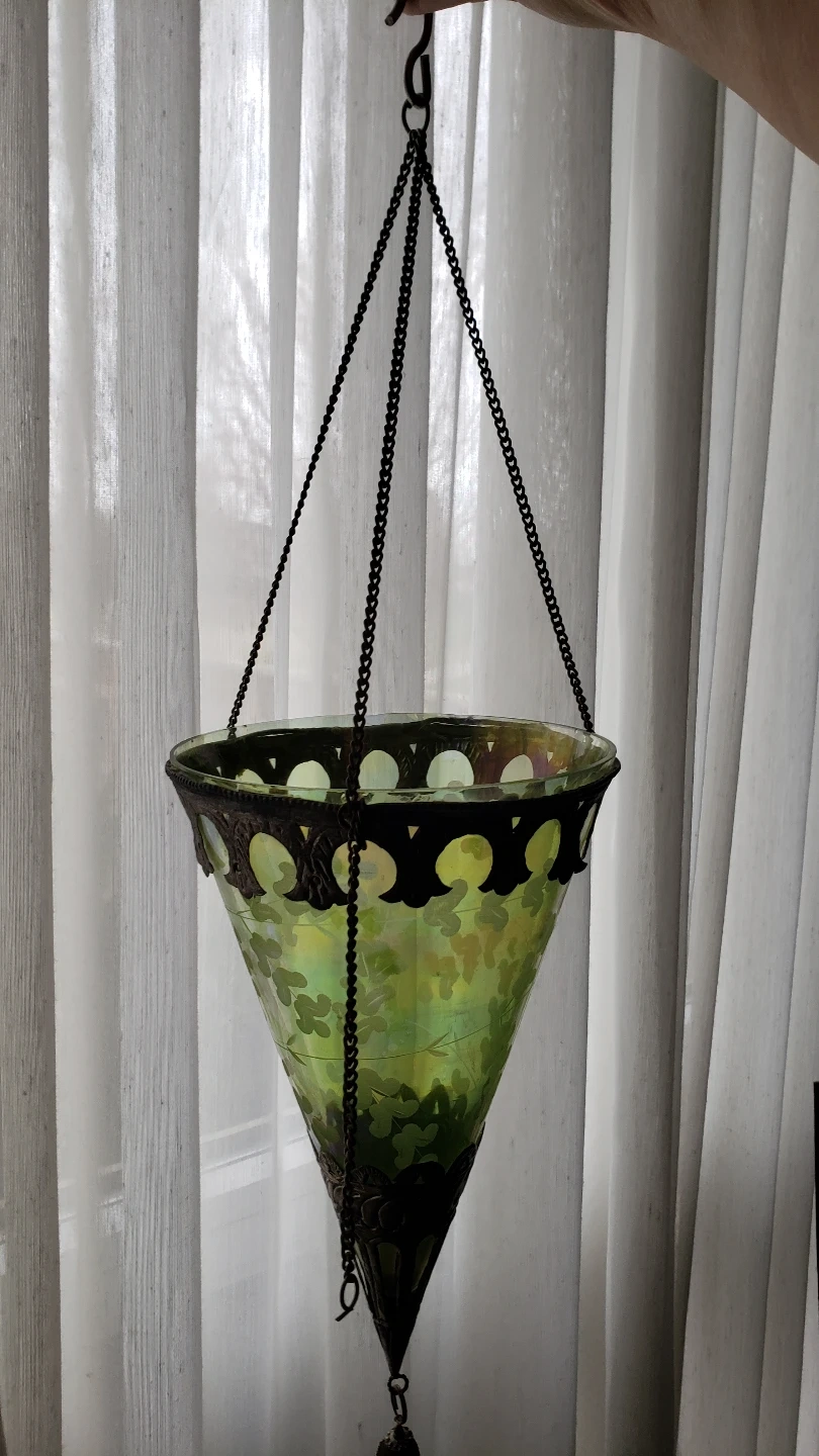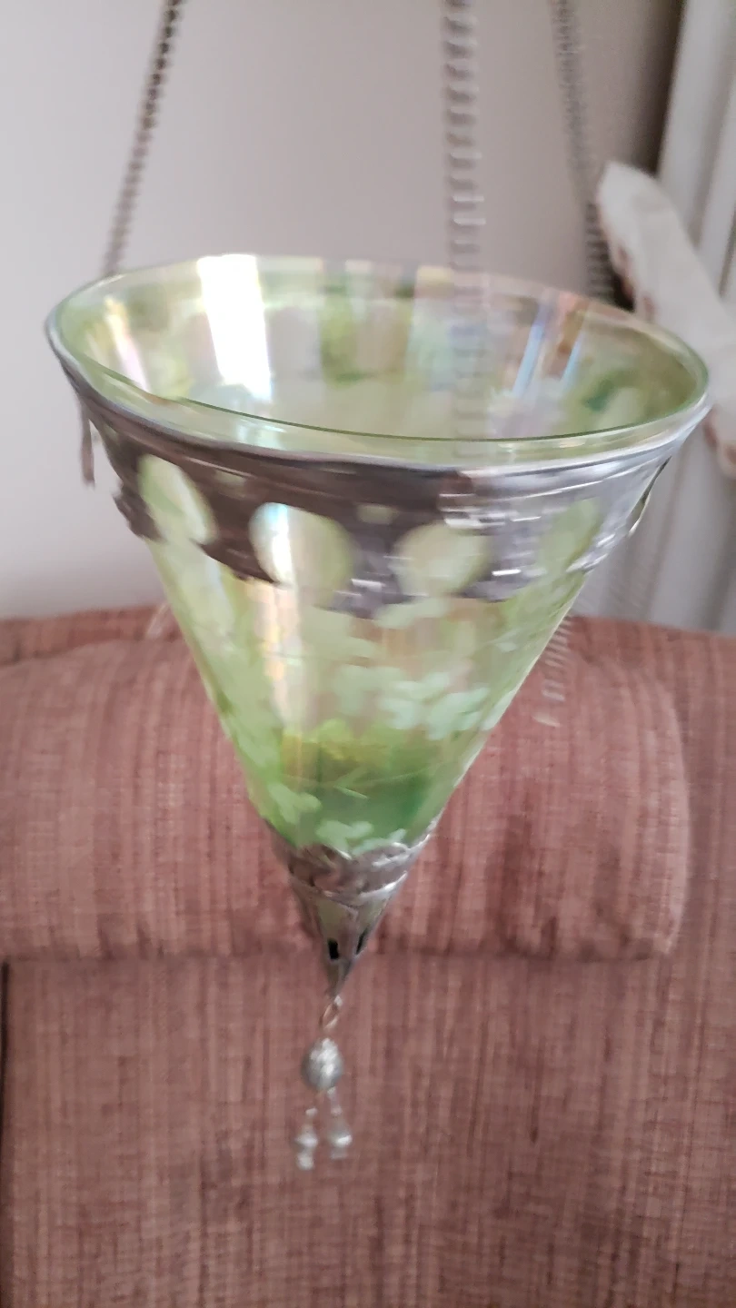 Beautiful vintage hanging decor. Light green glass with metallic accents. Floral design. Chain for hanging. Unique piece for home décor. you will see a chain hanging on its own not sure what thats about but overall looks hangs well and price is reflective and firm. ty