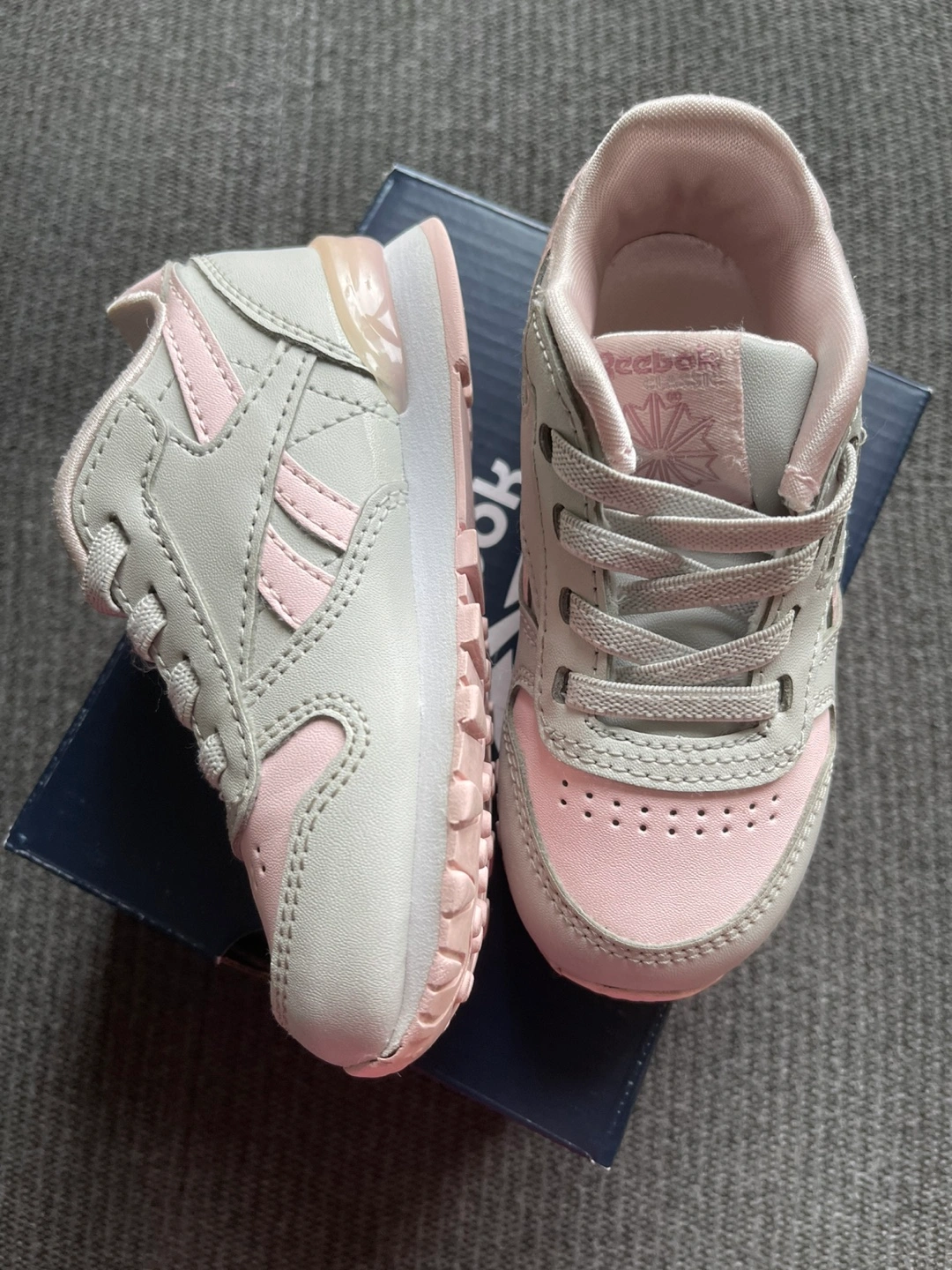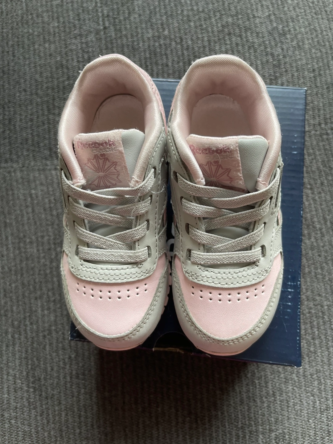 Adorable grey and pink Reebok Classic Leather sneakers. Infant size. Excellent used condition, used only indoor but expected some dirts. For only few weeks . She has tons of shoes to choose from lolz . Pick up in Whitby .Comes in original box.