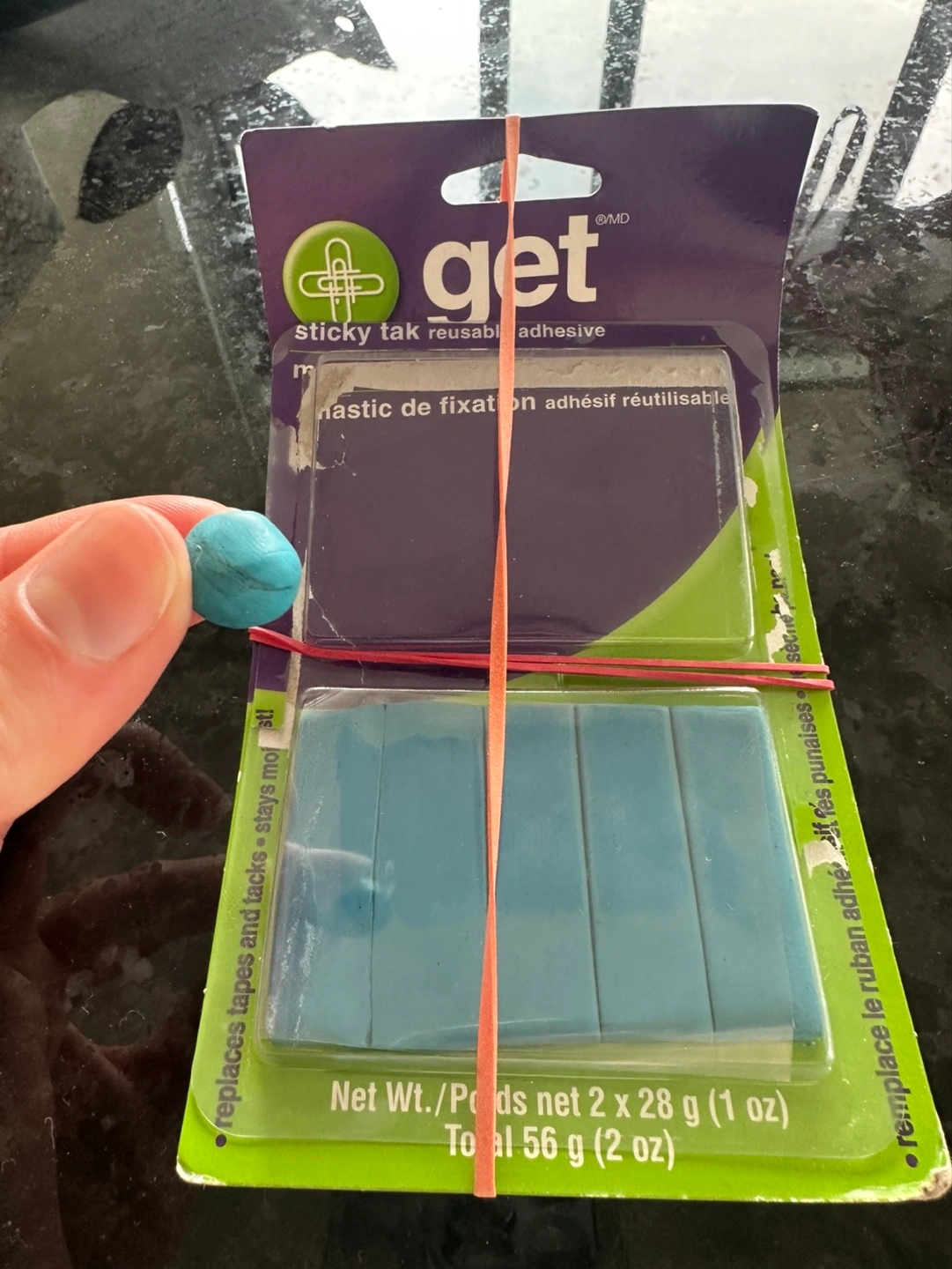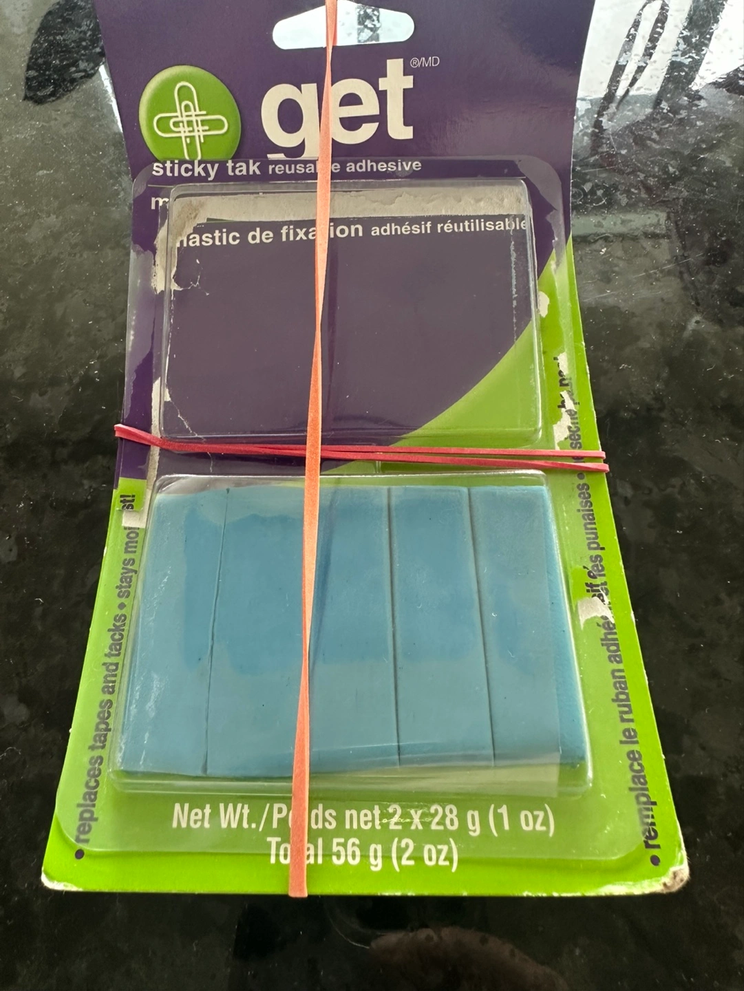 Half of a new and unused package of Get Sticky Tak reusable adhesive.