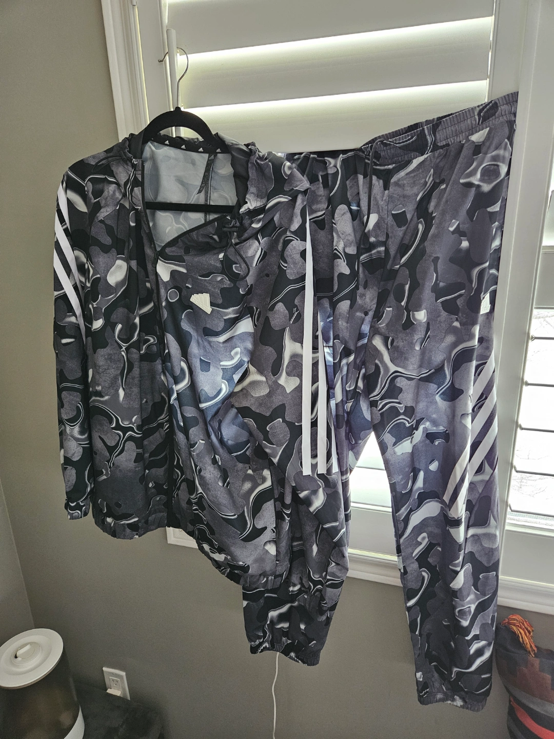 Adidas tracksuit, size medium. Grey camouflage print with white stripes. Jacket and pants included. Lightweight material, perfect for layering.