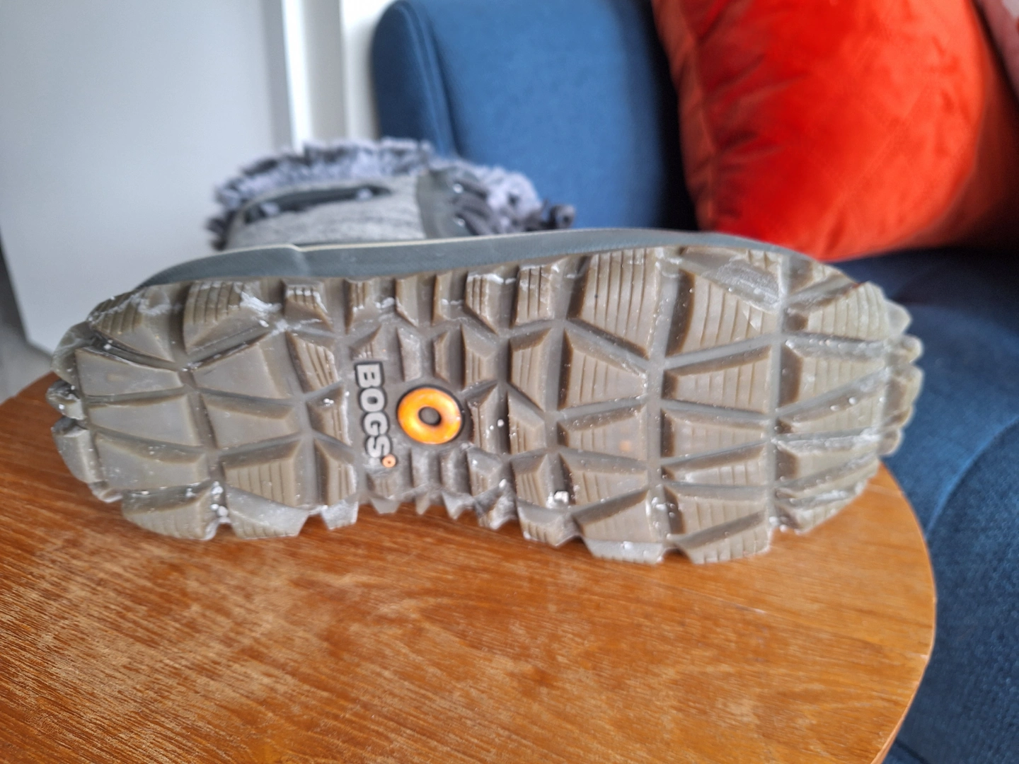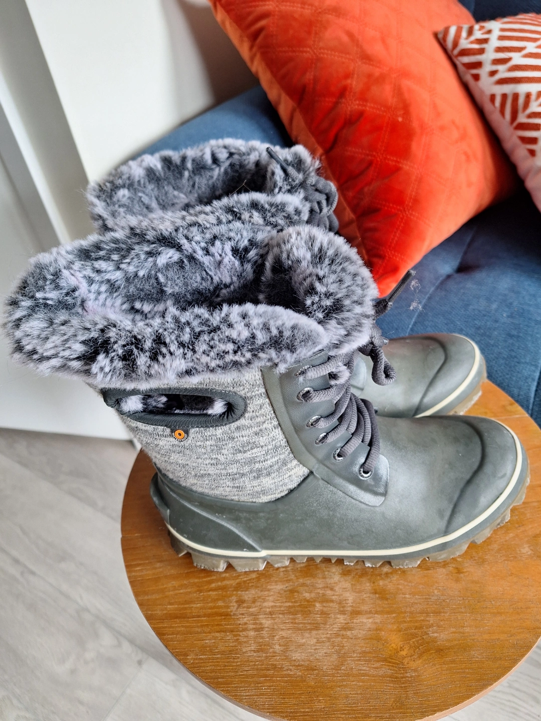 Women's BOGS winter arcata boots. Grey and black. Faux fur lining. Lace-up style. Good tread. Includes new Santigett insoles.