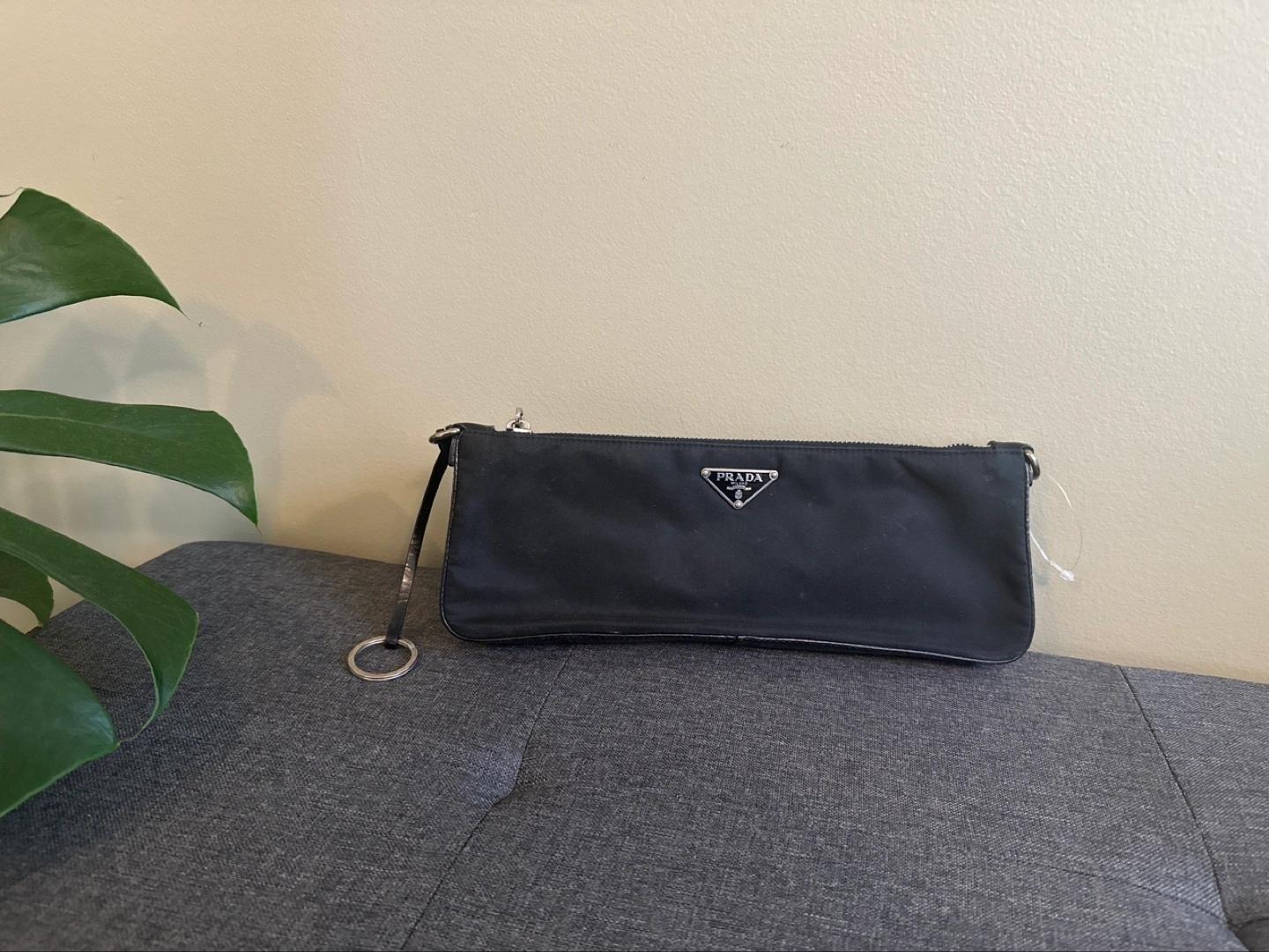 Small vintage black nylon clutch. Features a zip closure and silver-toned hardware. Includes a detachable strap.