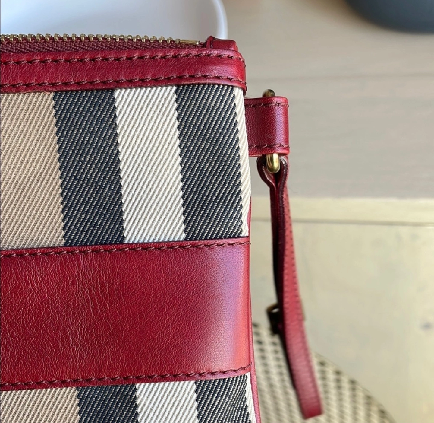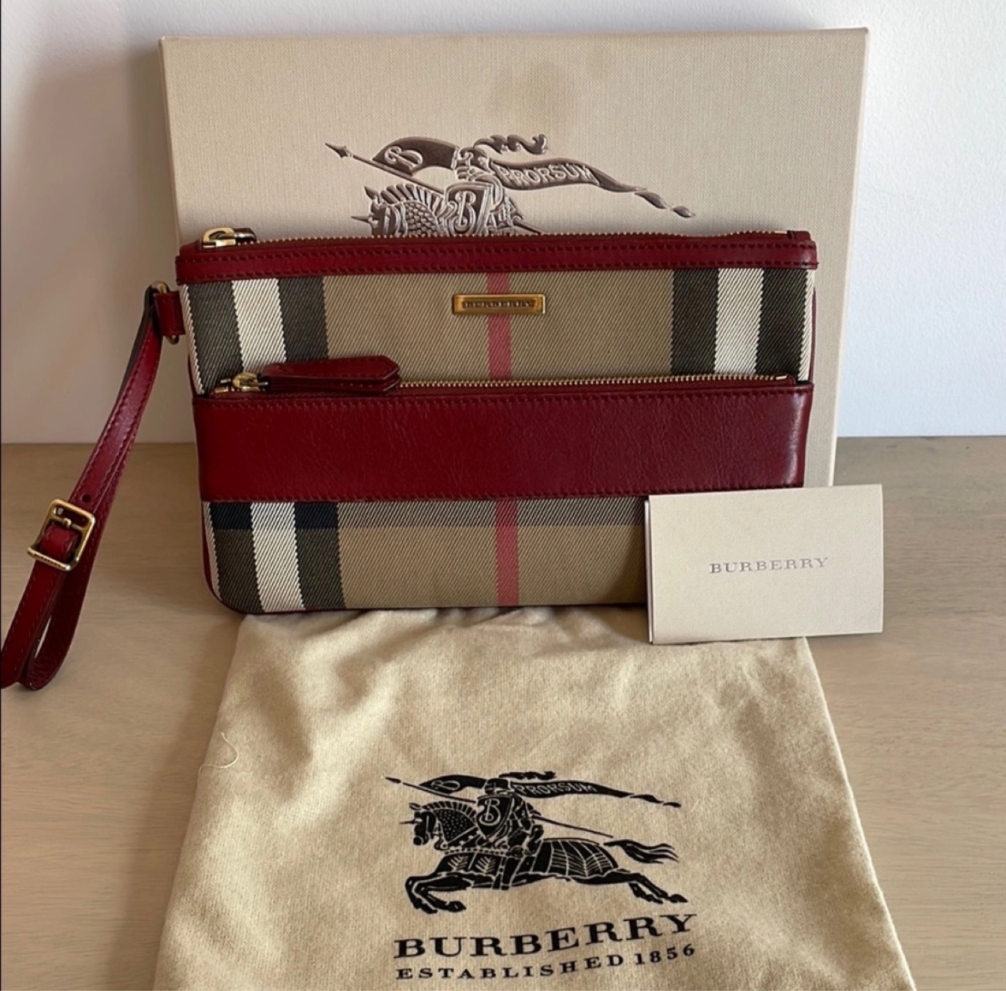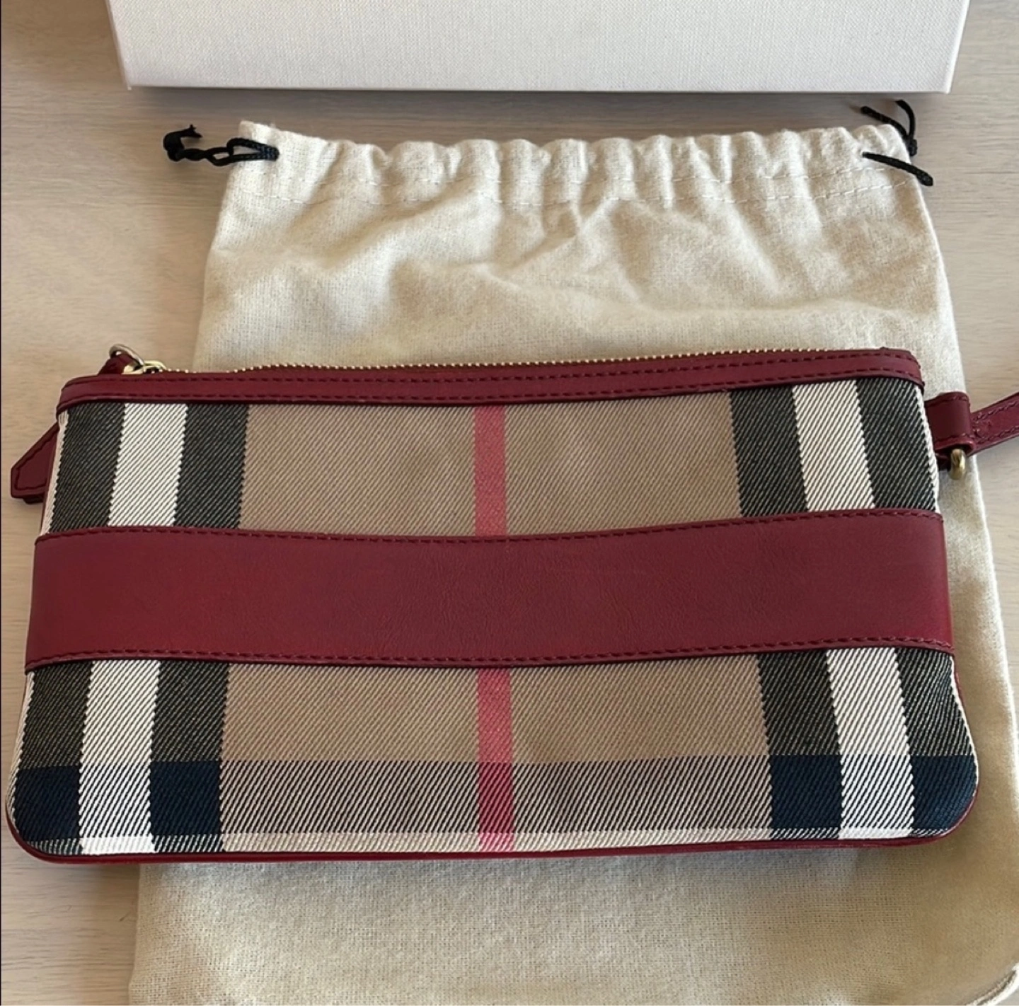 Elegant Burberry wallet/clutch with classic check pattern. Features red leather accents. Like new 9x5.5x1 Leather and fabric Come with box and dust bag