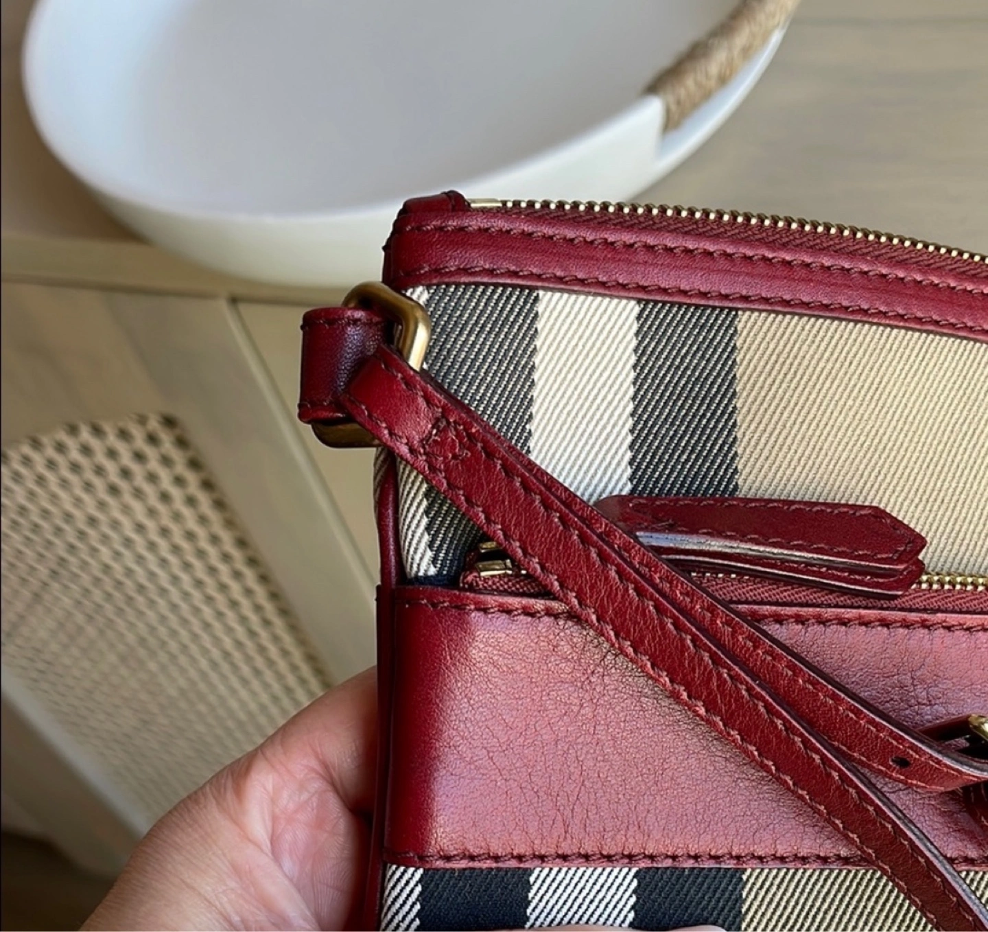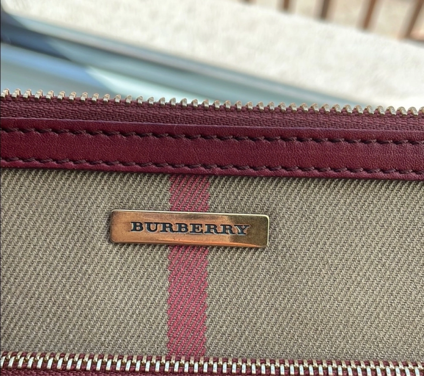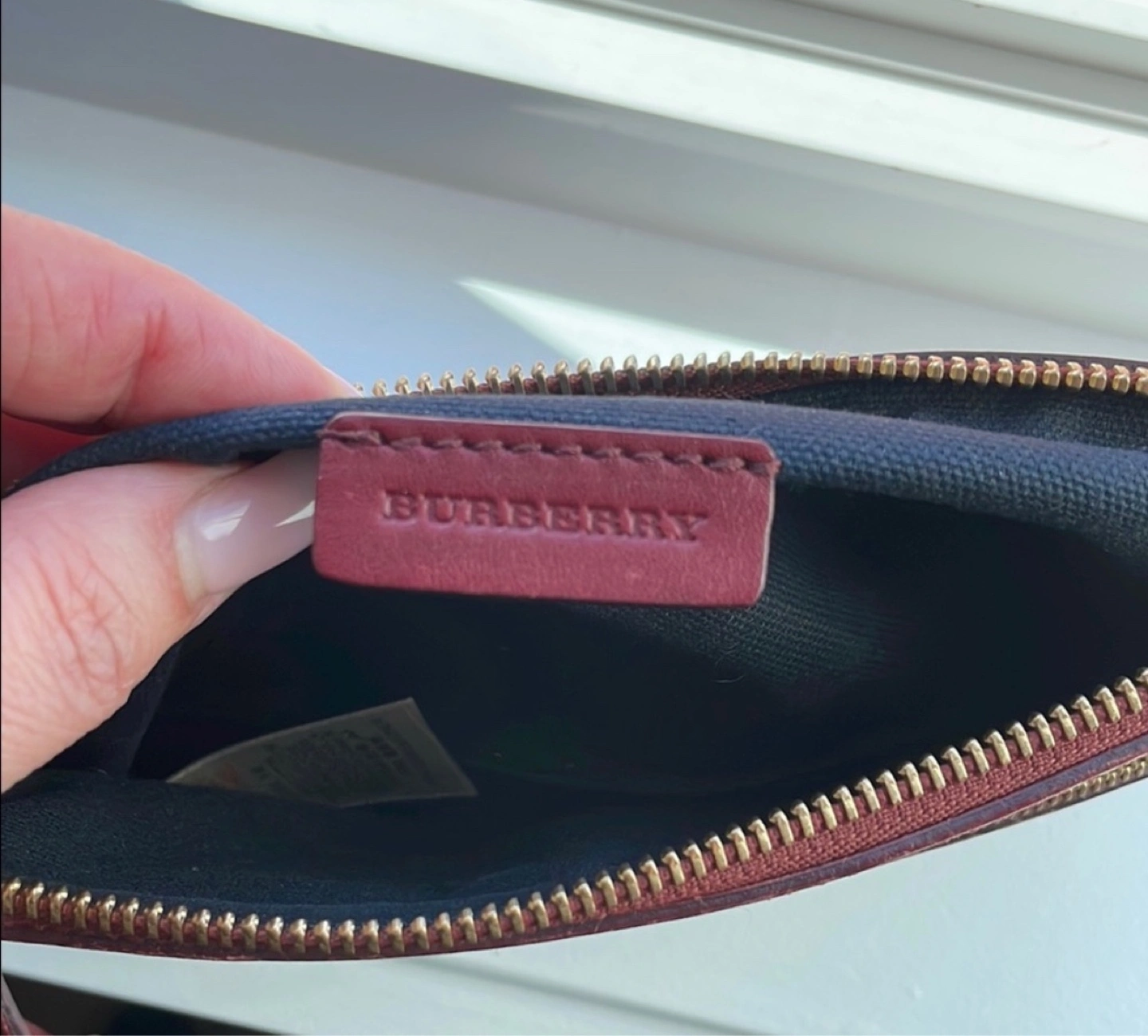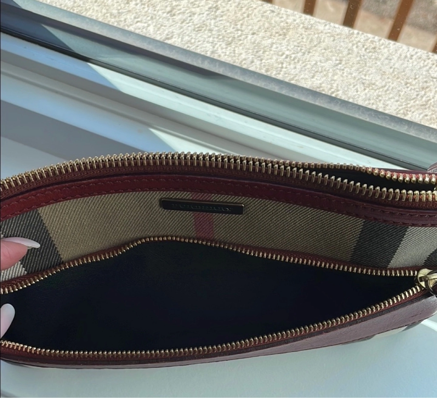 Elegant Burberry wallet/clutch with classic check pattern. Features red leather accents. Like new 9x5.5x1 Leather and fabric Come with box and dust bag