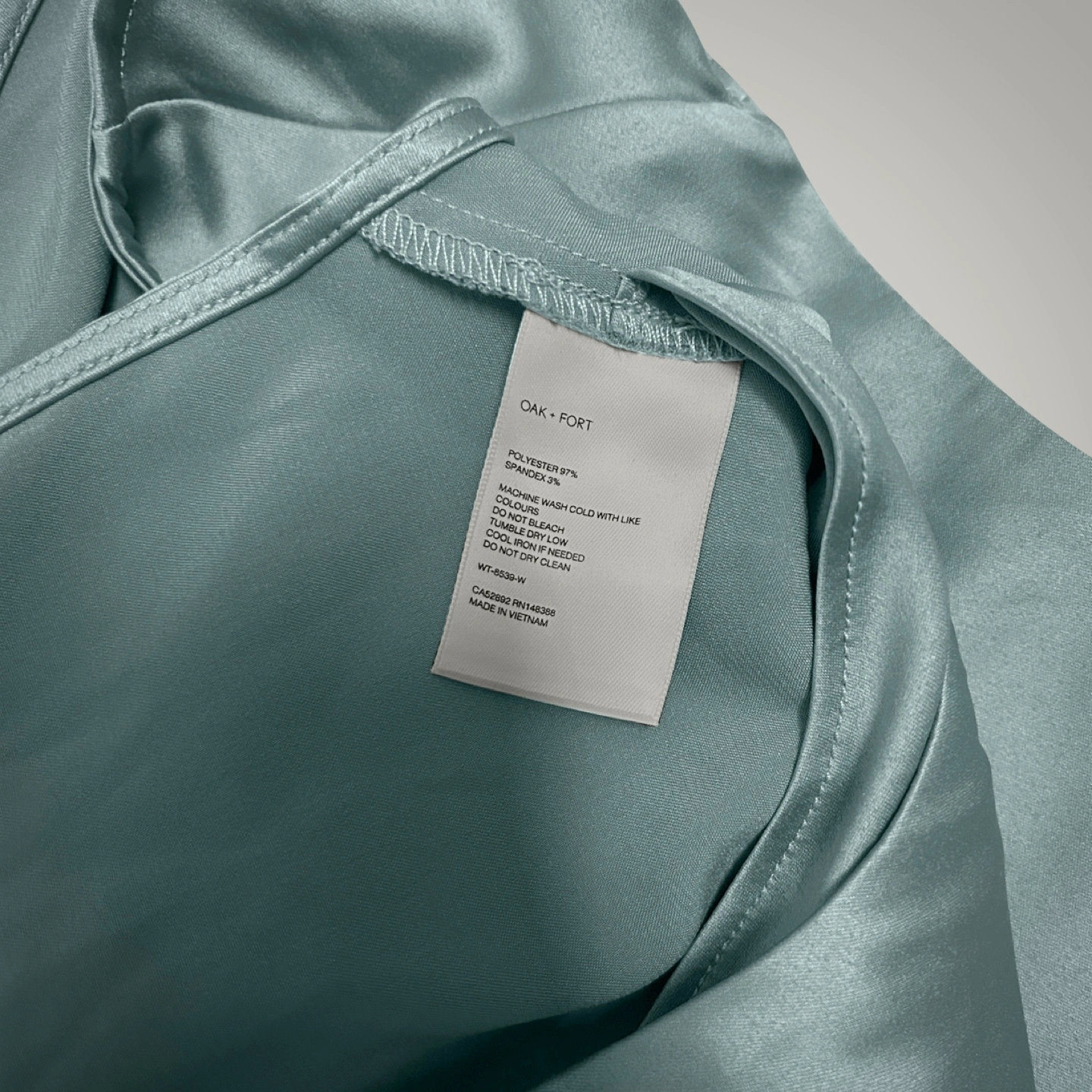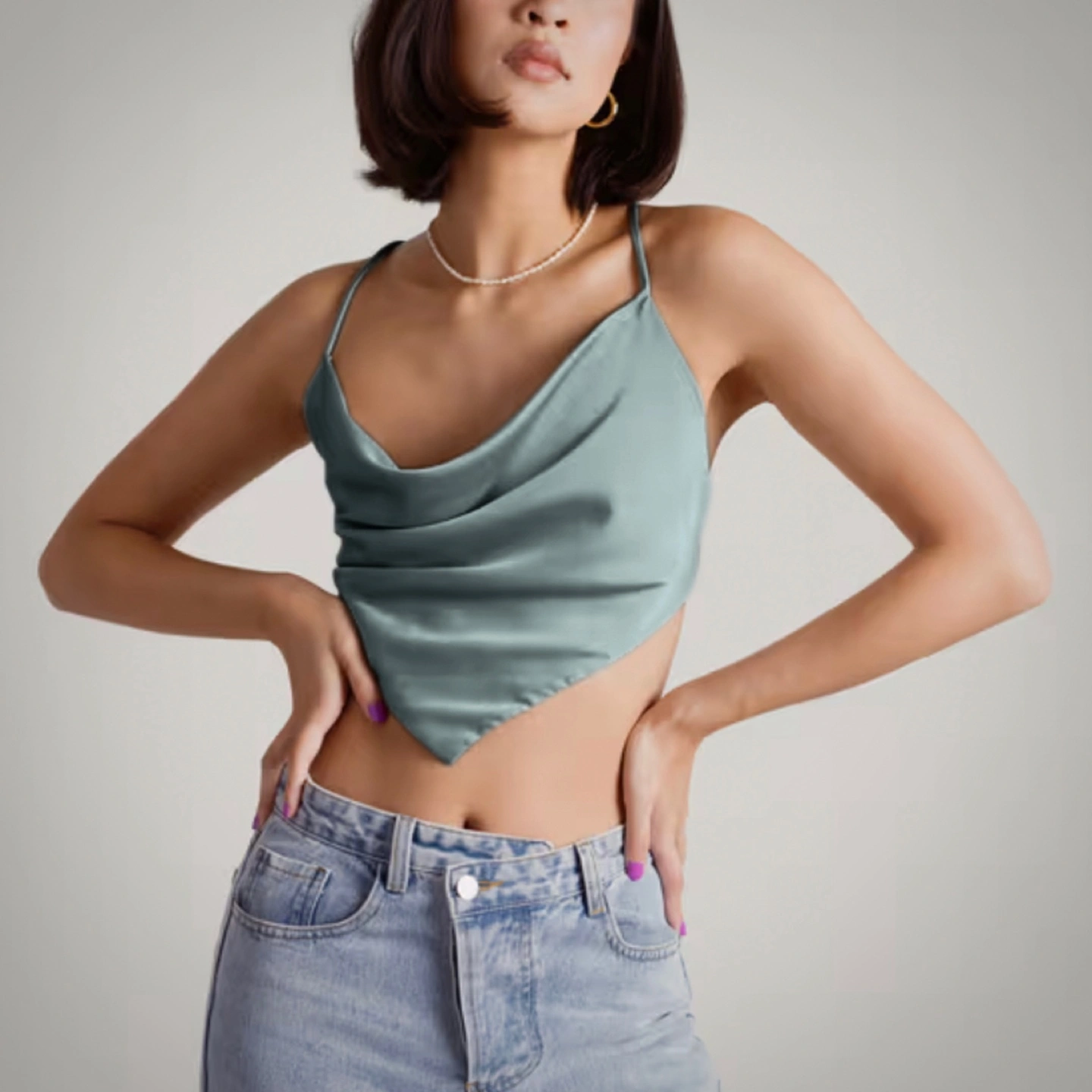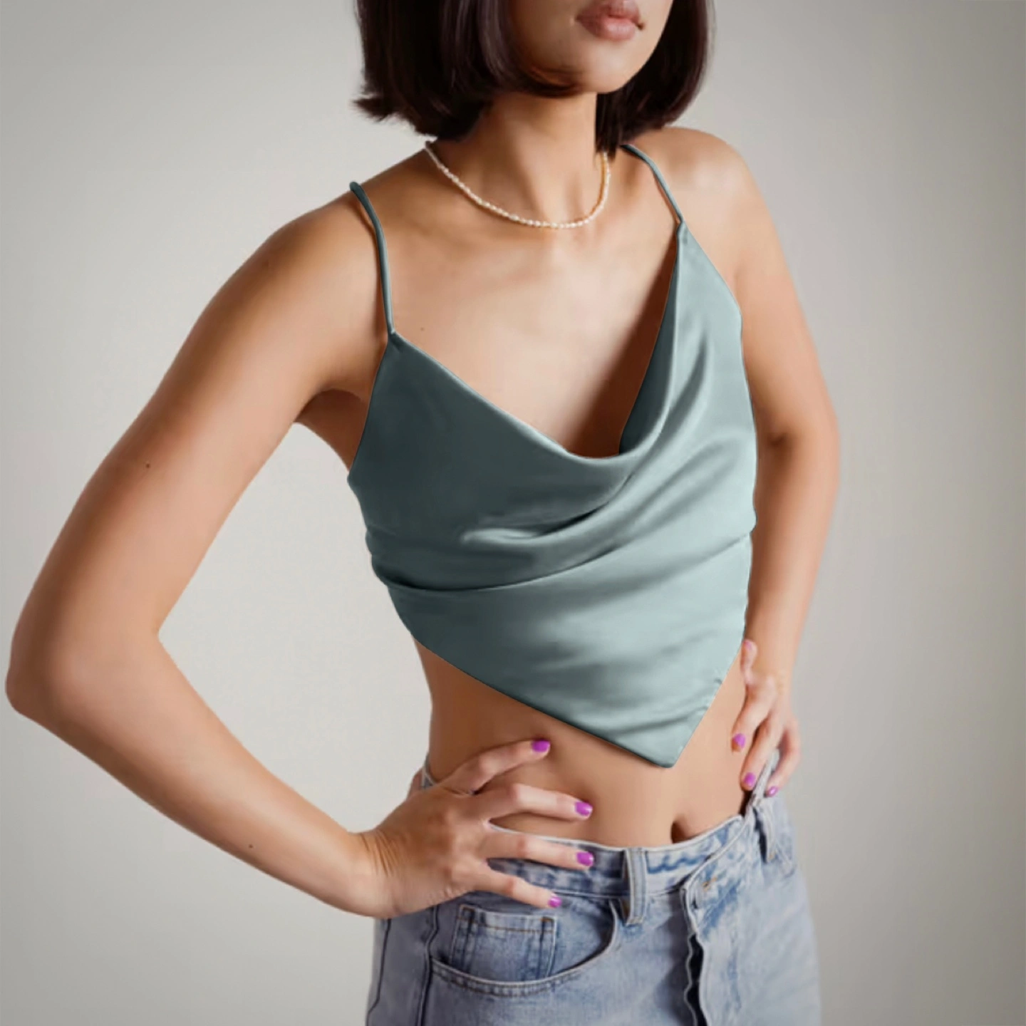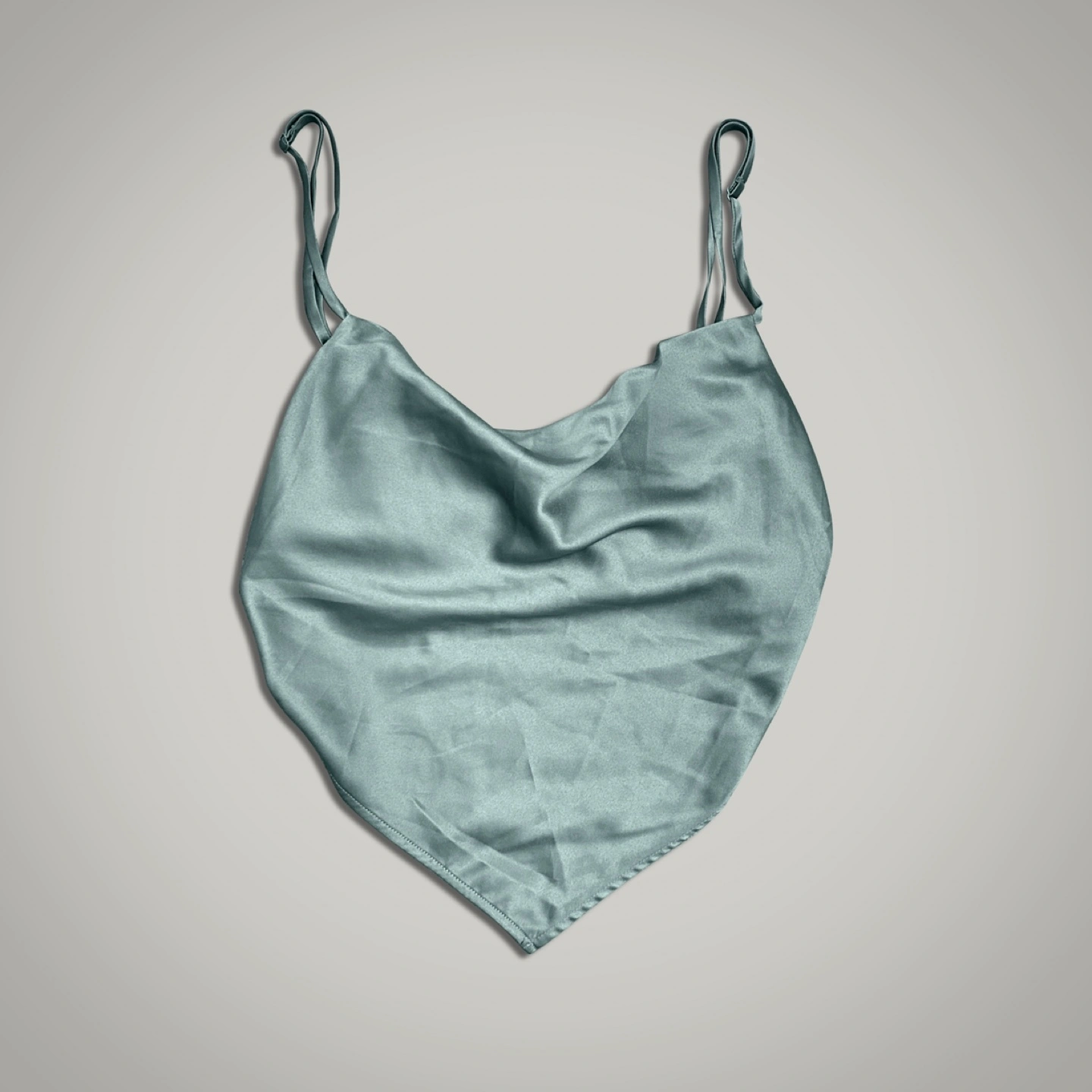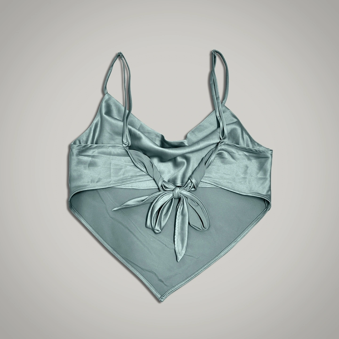 Beautiful sage green satin cami. Features a cowl neck and tie back detail. Lightweight and flowy. Perfect for layering or wearing on its own.