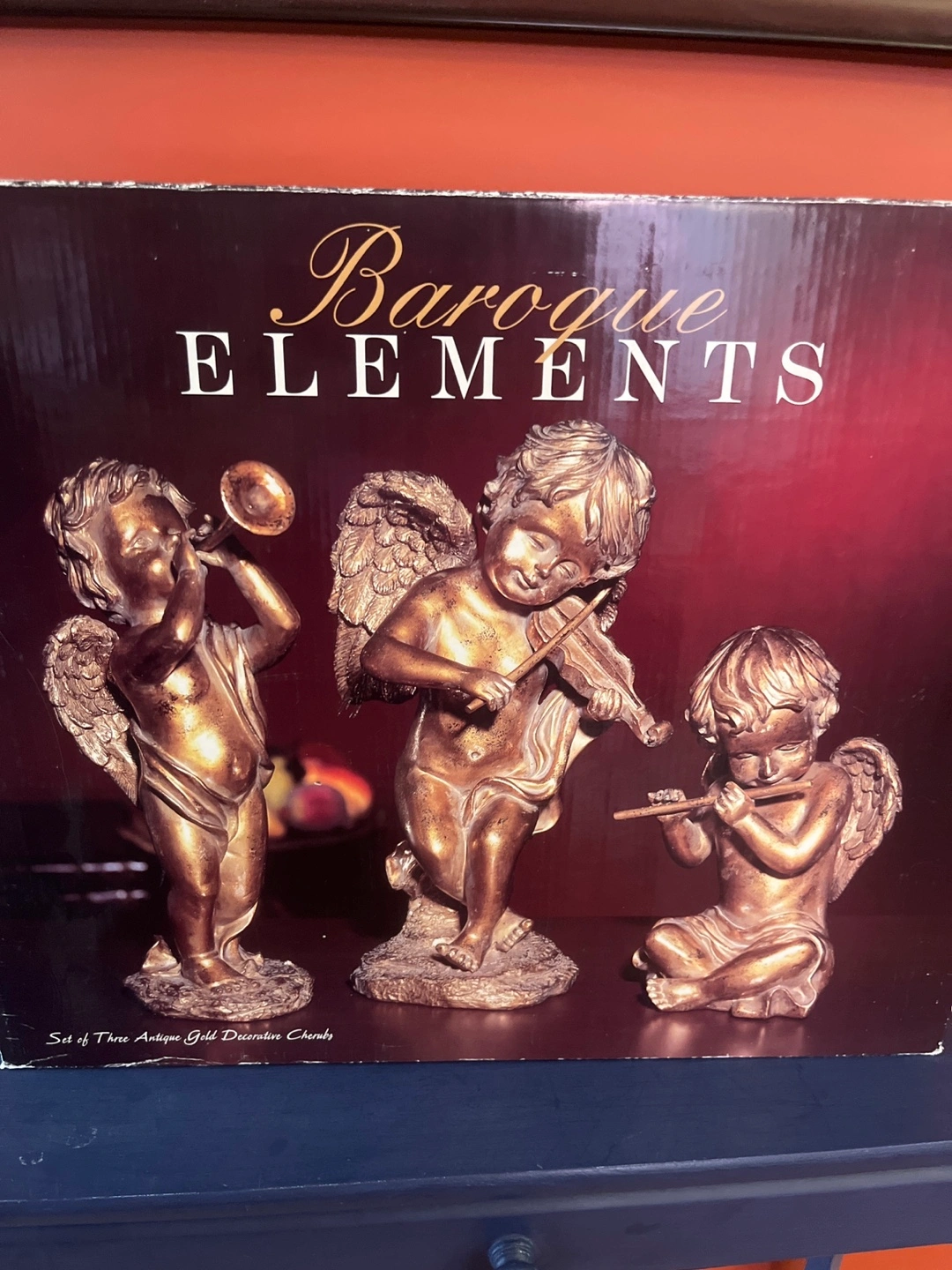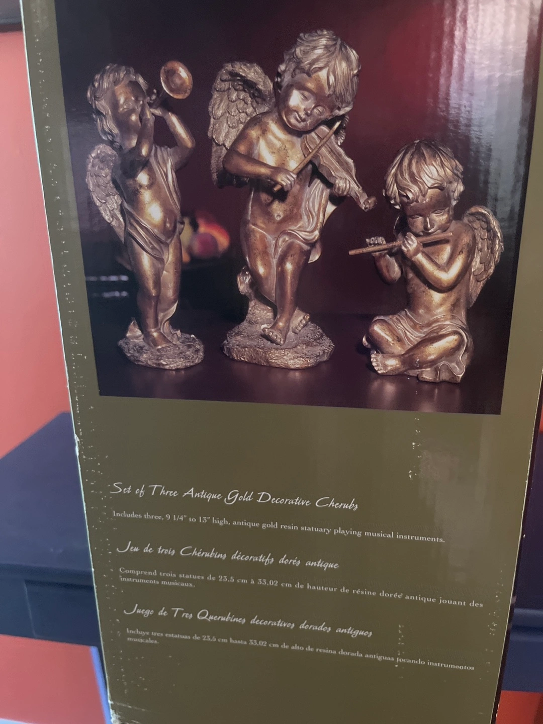 Set of three antique gold cherub figurines. Resin statuary. Playing musical instruments. Approximately 9 1/4" to 15" high.