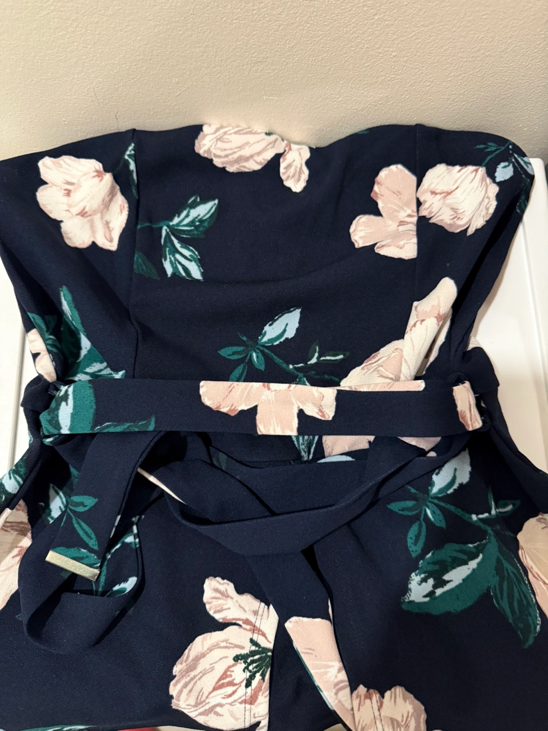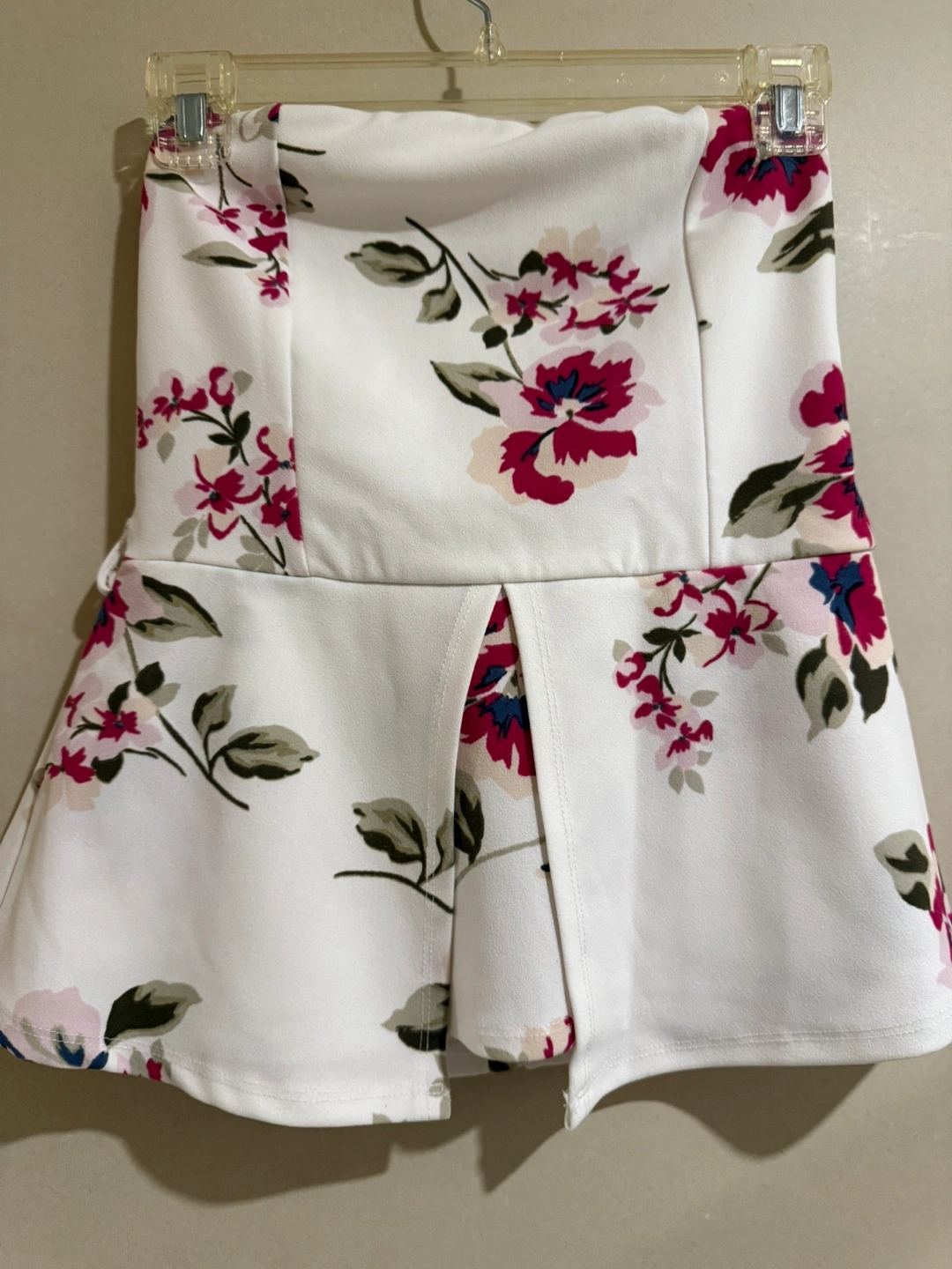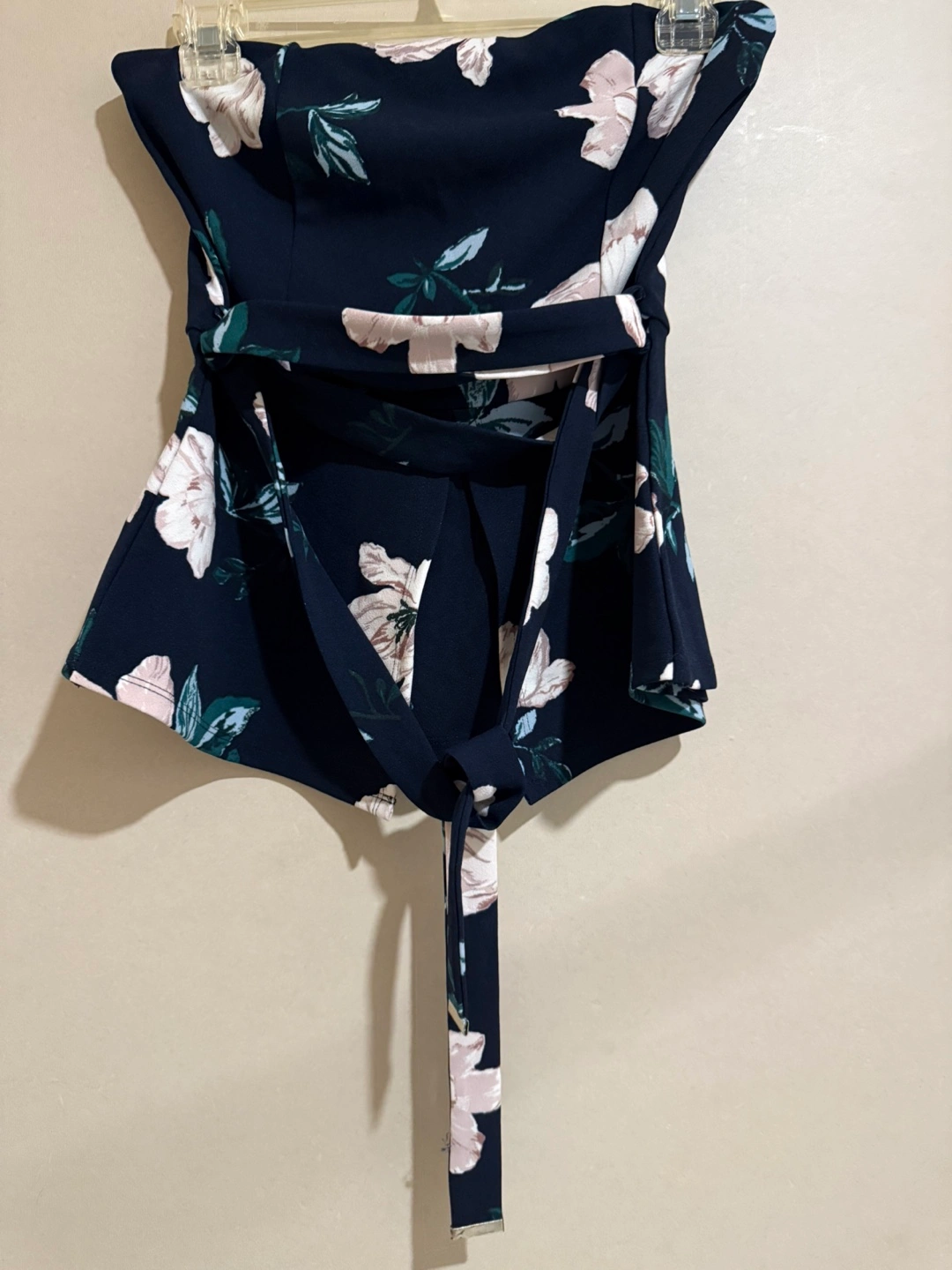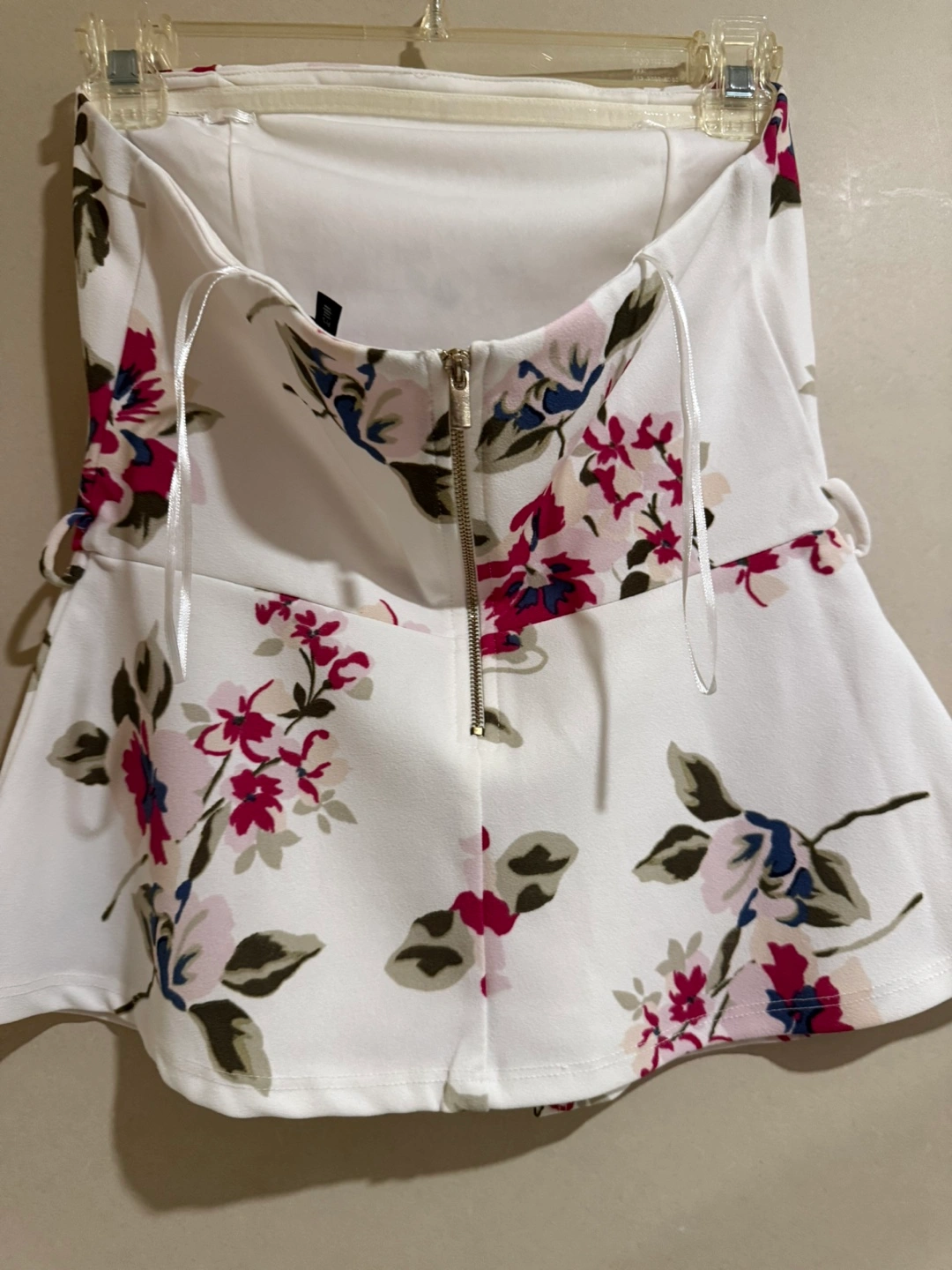 Adorable floral tube tops. Features a fitted bodice and a slightly flared peplum, zipper closure. Two colour options available: navy and white. White is missing belt. Barely used.