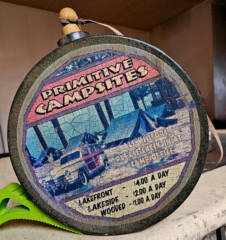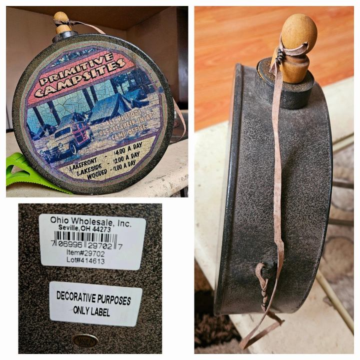 Unique vintage canteen. Features a distressed, rustic design. Depicts a primitive campsites scene. Decorative purposes only. From a smoke-free, pet-free home. Bundle discounts are available—feel free to browse my other listings. Thanks for looking! 😊🙏