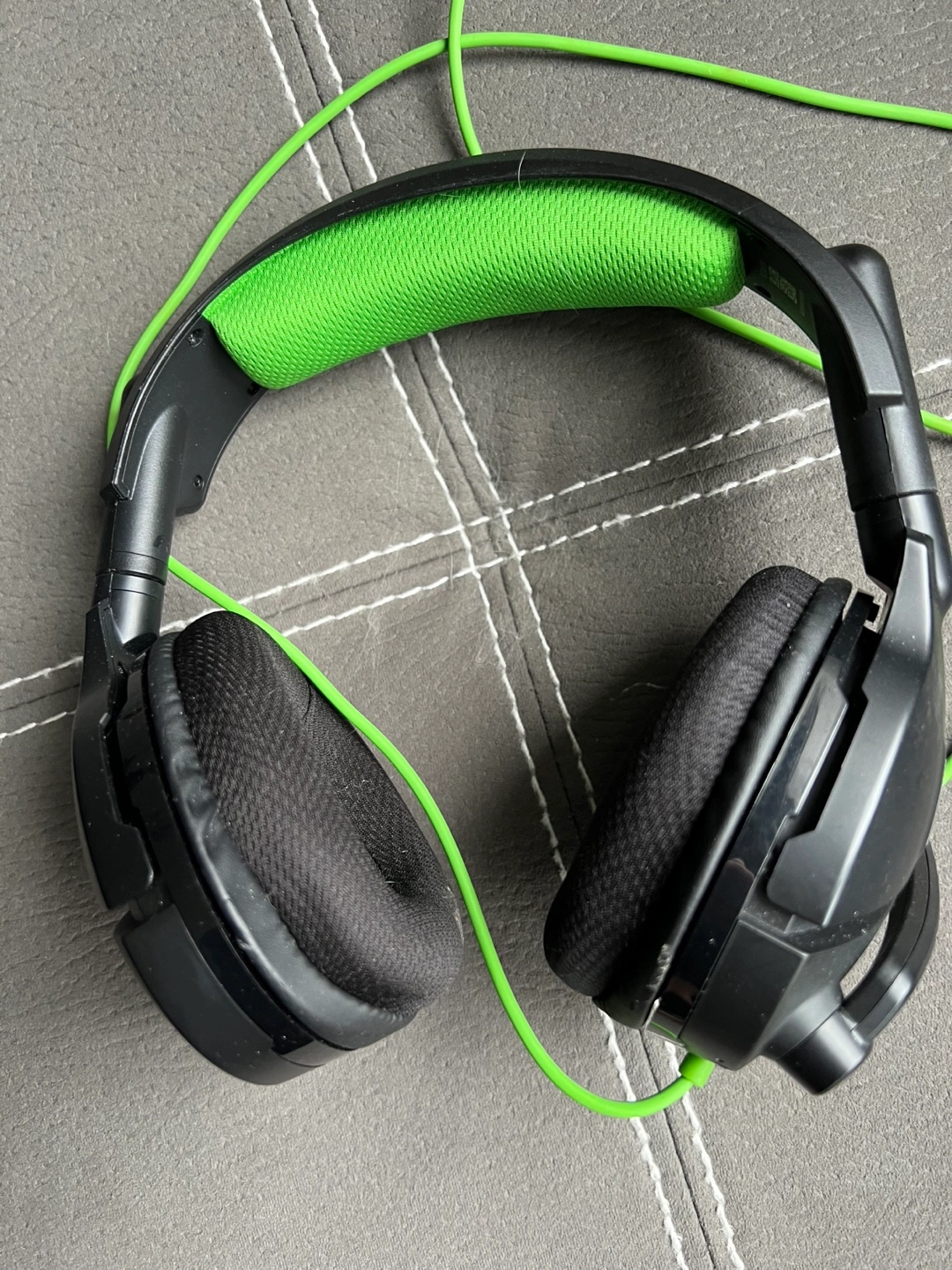 Gaming headset, black and green accents. Comfortable earcups, wired connection. Great sound quality. Used but well-maintained.