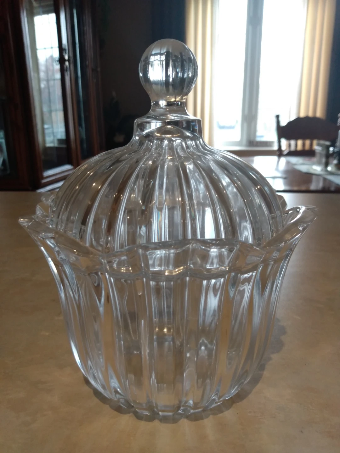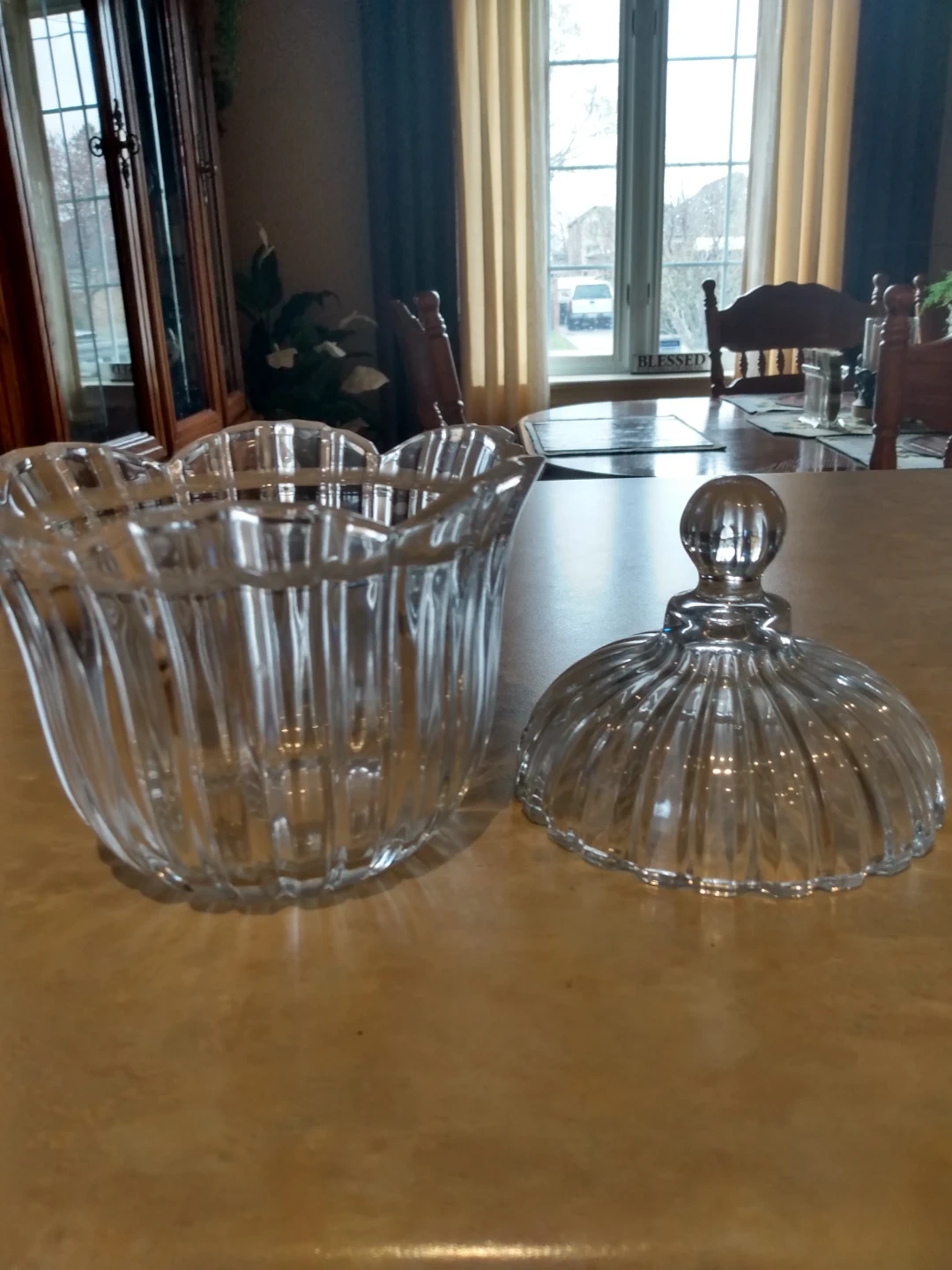 Elegant clear glass candy dish. Features a fluted design and a dome lid with a finial. Perfect for storing treats or as a decorative piece. ( Cash pick up)