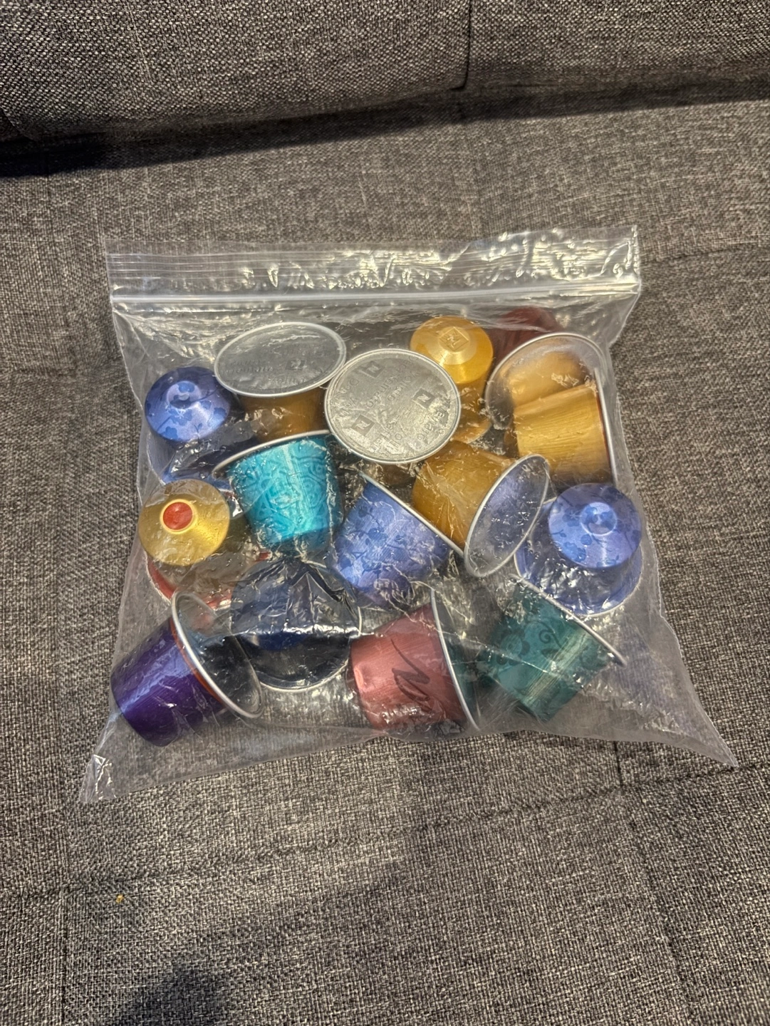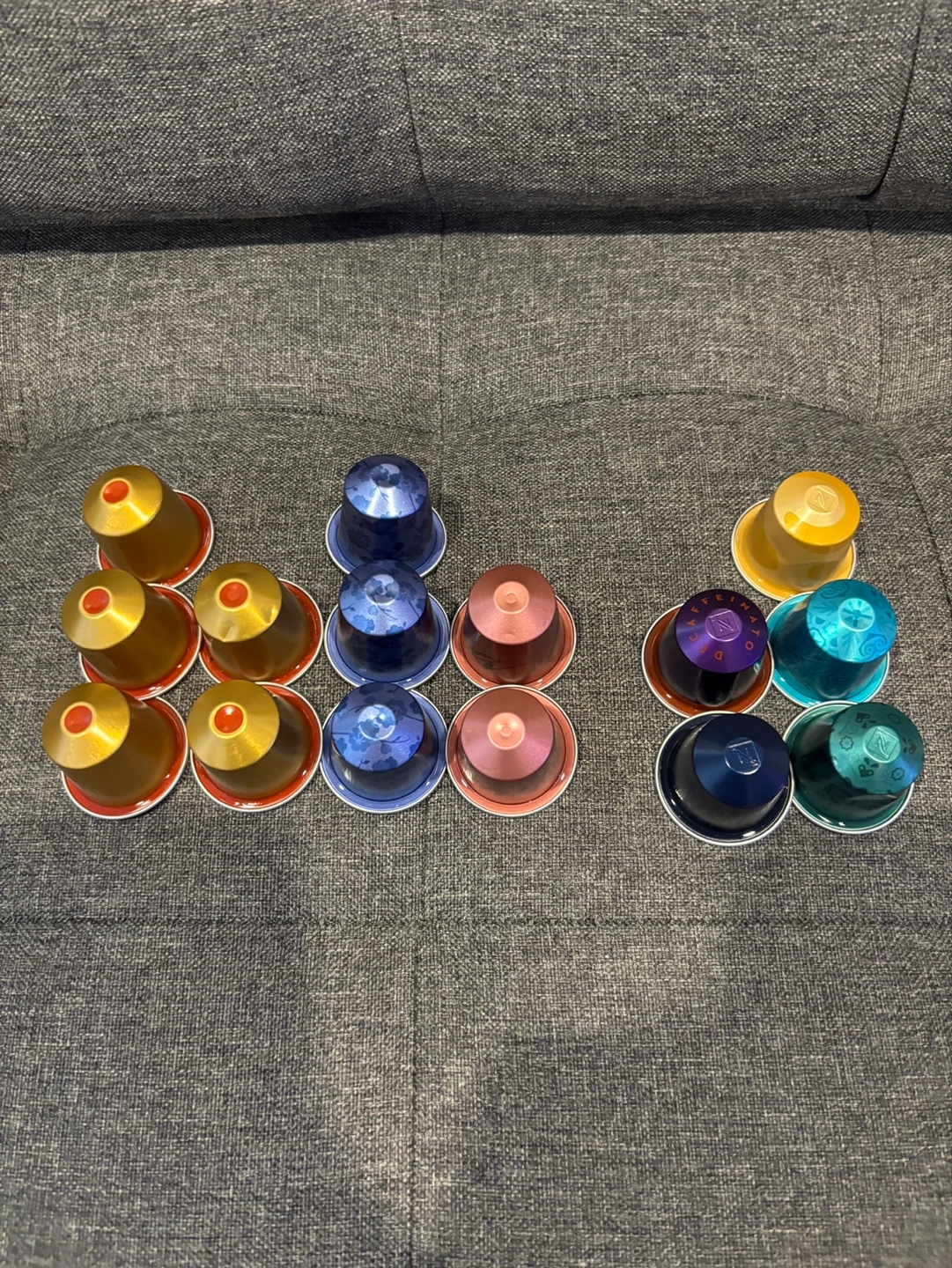 Assortment of Nespresso coffee capsules. Various flavours and colours. Our machine broke, leftover capsules