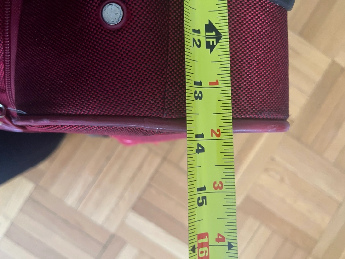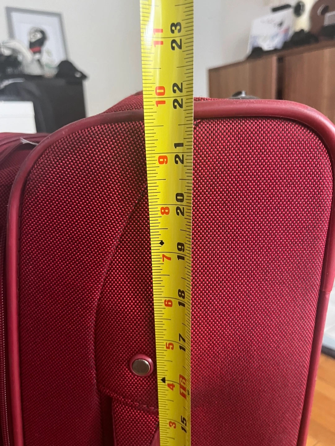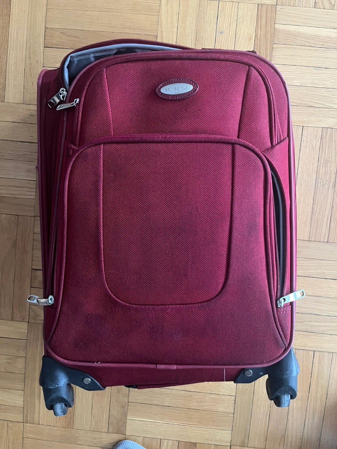 Used Serengeti carry-on suitcase. Burgundy colour. Four wheels. Multiple compartments. Shows some wear.