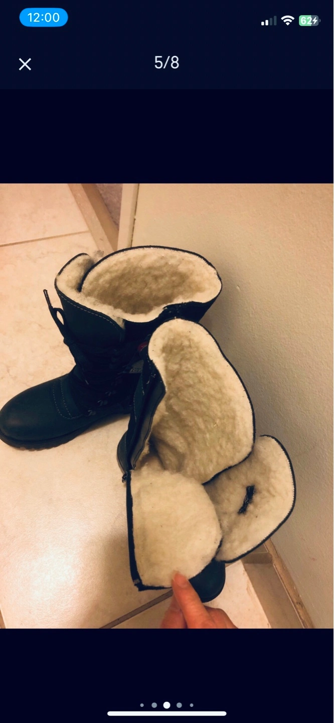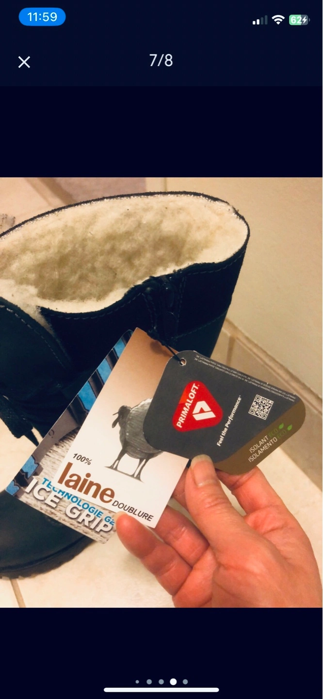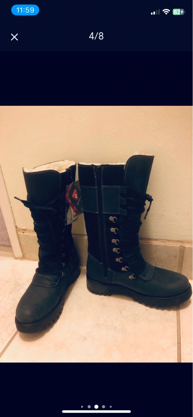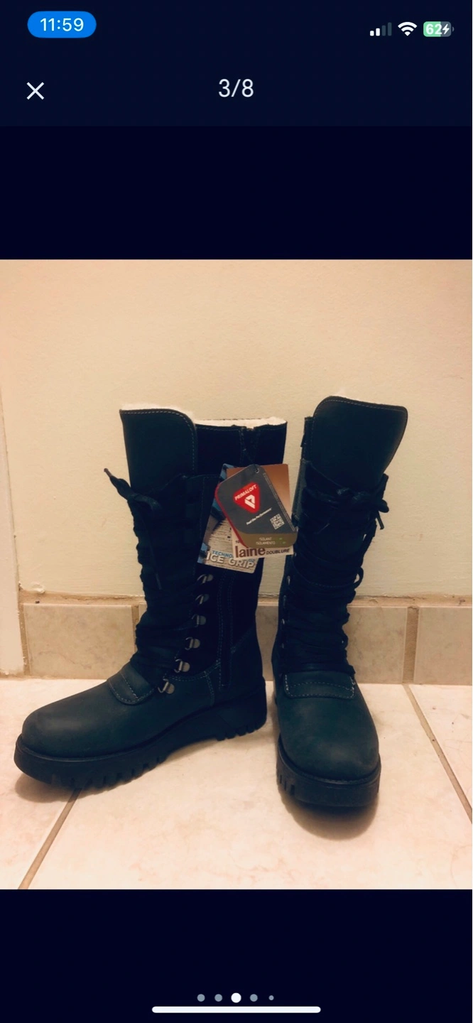 Primaloft insulation warm winter boots. Ice grip technology. 100% laine doublure. Lace-up style. Black leather-look. Size 6