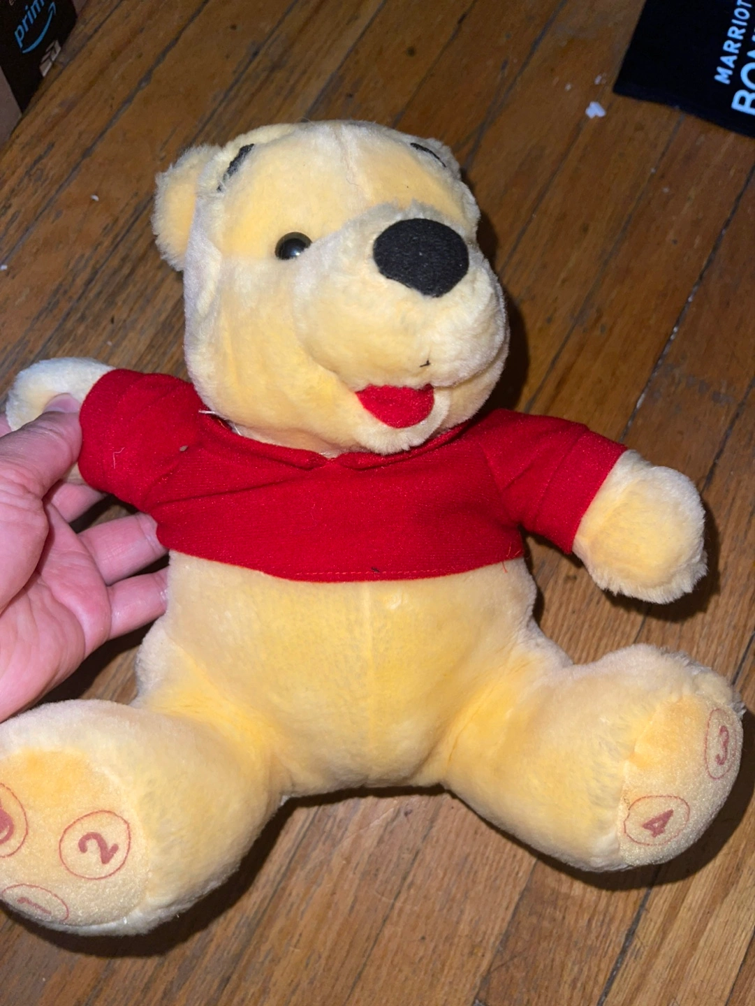 Adorable Winnie the Pooh plush toy. Features a red shirt. Numbers on paws. Required new batteries for buttons to work. Pick up Dundas and Spadina Intersection.