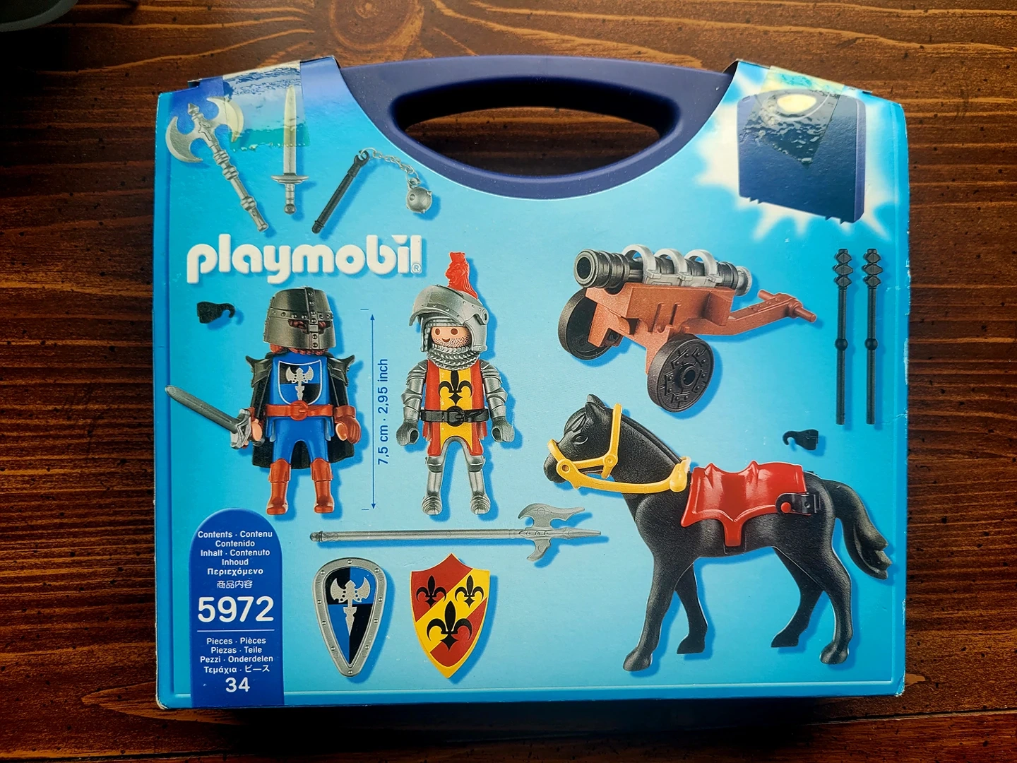 -Don't miss out on this deal!! Over $40.00 Value!!! -34 Piece Playmobil Take Along Kit (No. 5972) -Ages 4-10. -Includes 2 Playmobil Figures (7.5 cm) Toy Horse and Toy Cannon, plus accessories (please see pictures). -Can be a great addition to Playmobil Knignts Castle Collection. -Brand New, Never Opened! **BROWSE MY OTHER LISTINGS**