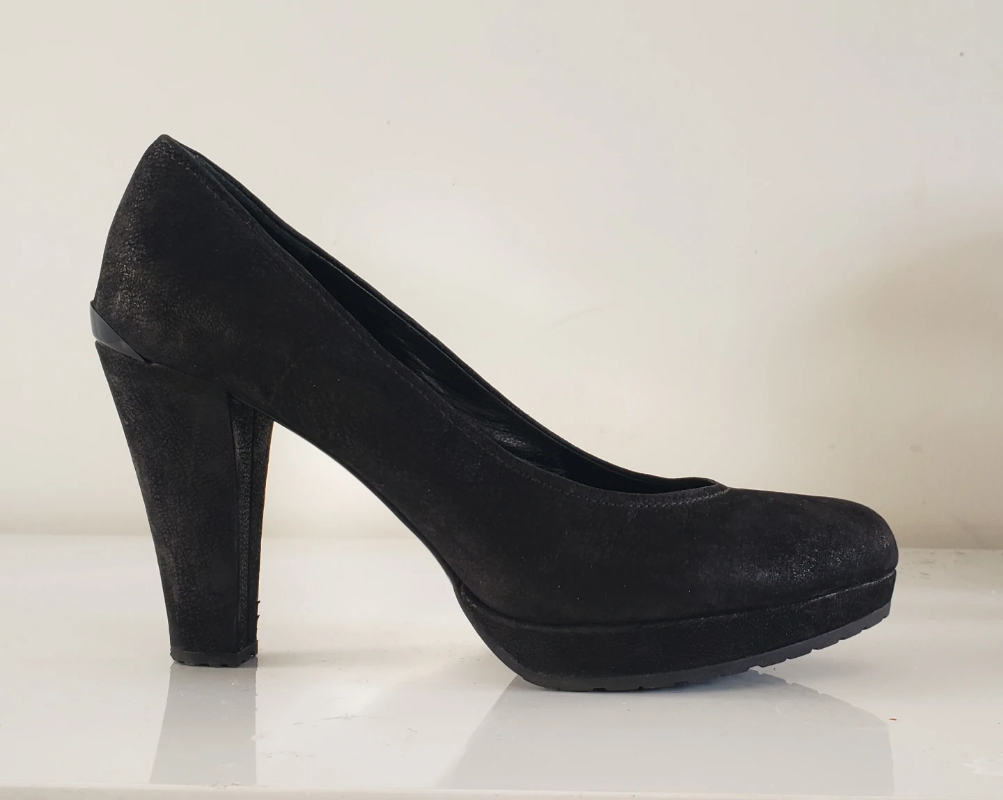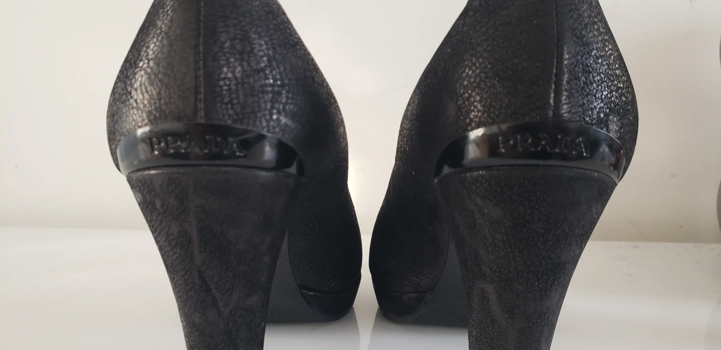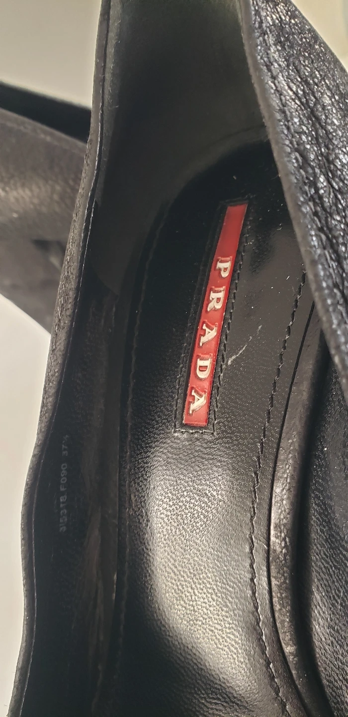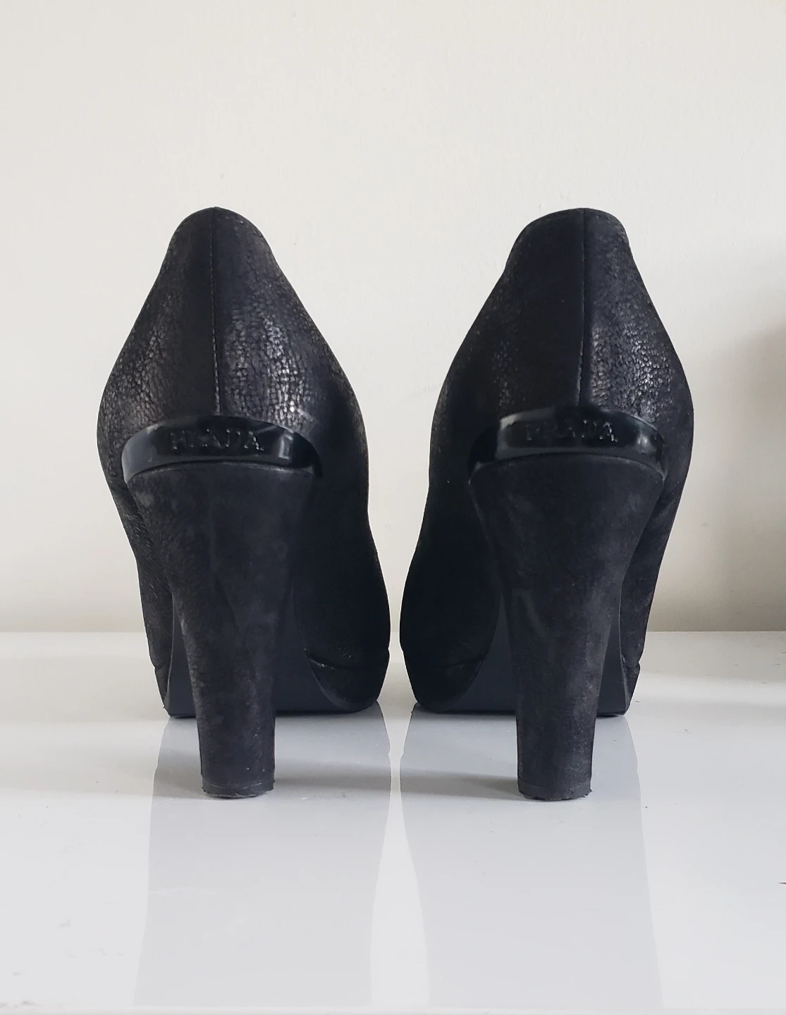 EUC size 37 suede black prada heels. Featuring black branded hardware plate at back. Heel approx 4.5". Comes w/ dustbag. Cash only, transact at TD Bank to be safe.