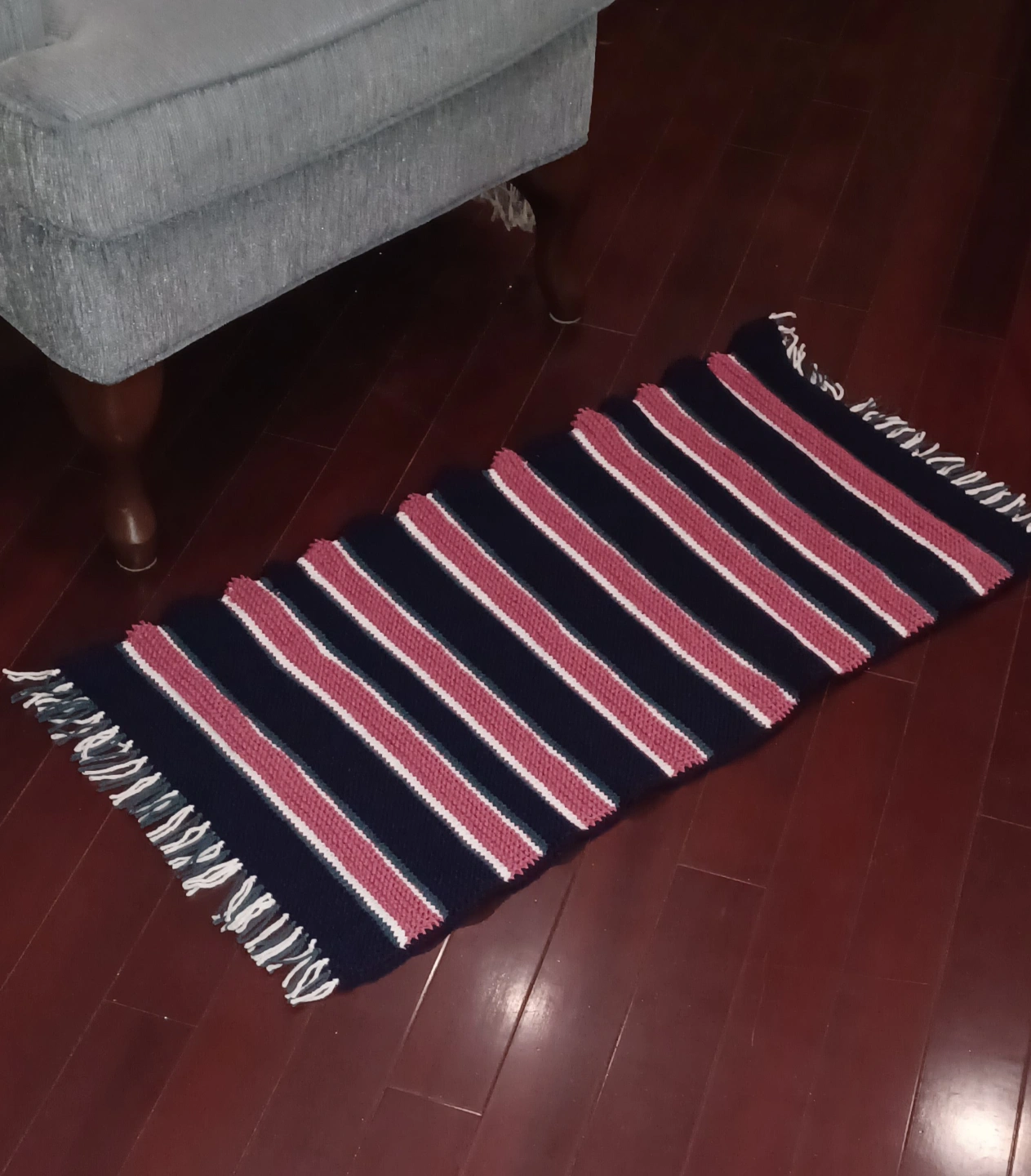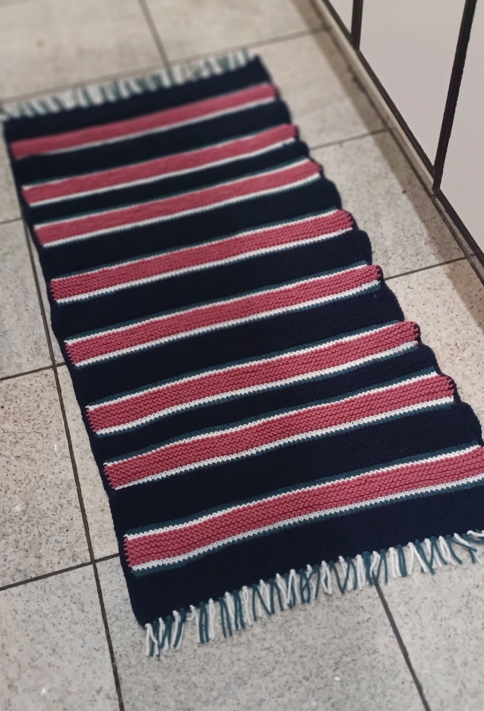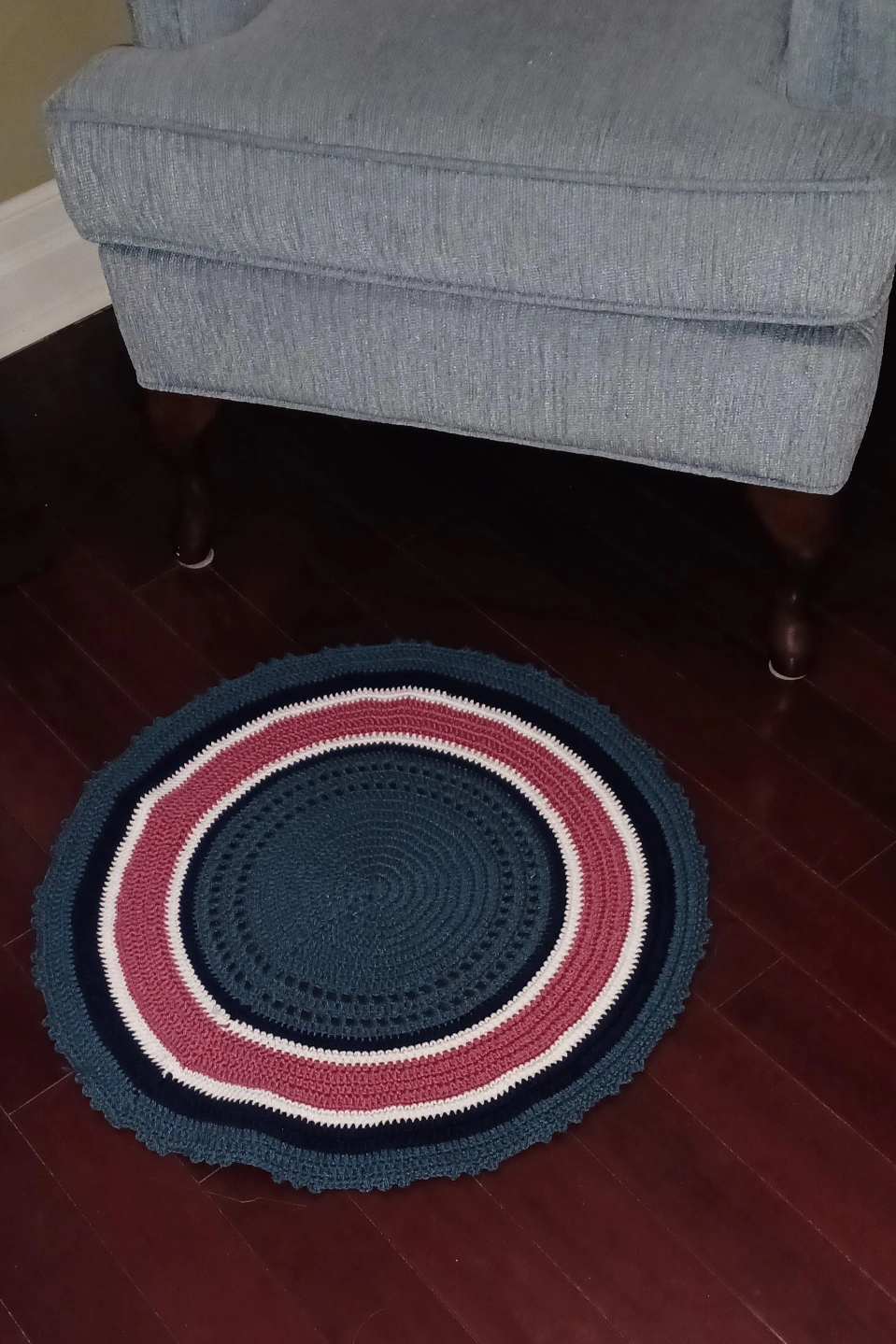 Beautiful handmade crocheted rug set. Features a striped runner and a circular mat. Navy, blush pink and off-white colours. Fringe detailing. Perfect for adding a touch of handmade charm to your home. You can decorate your bathroom, kitchen etc. I'm not using it display it for pictures. It's new just finished. dimension approximately runner 40"×18.5" Round mat 25"