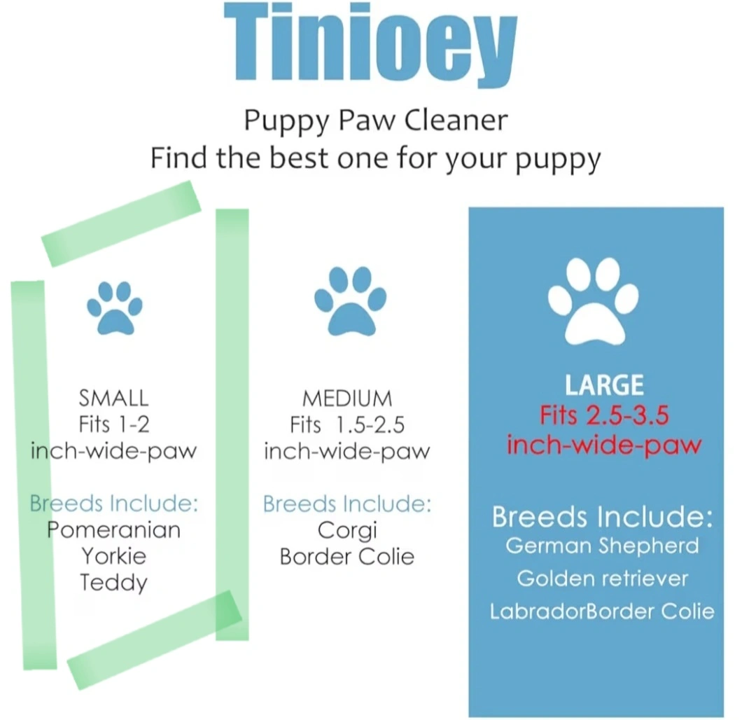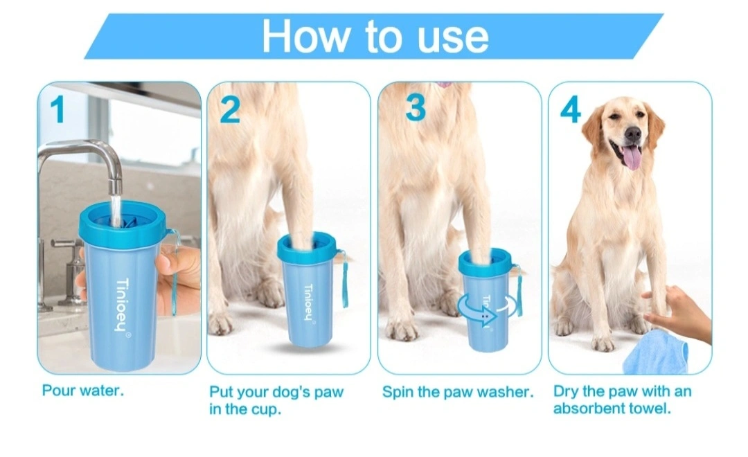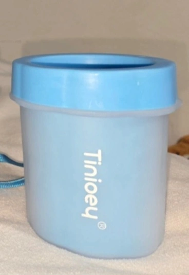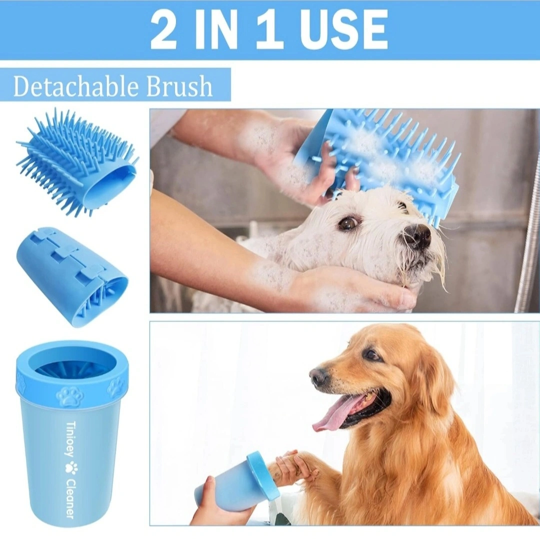 Portable dog paw cleaner. Easy to use. Includes a detachable brush. Clean muddy paws quickly.