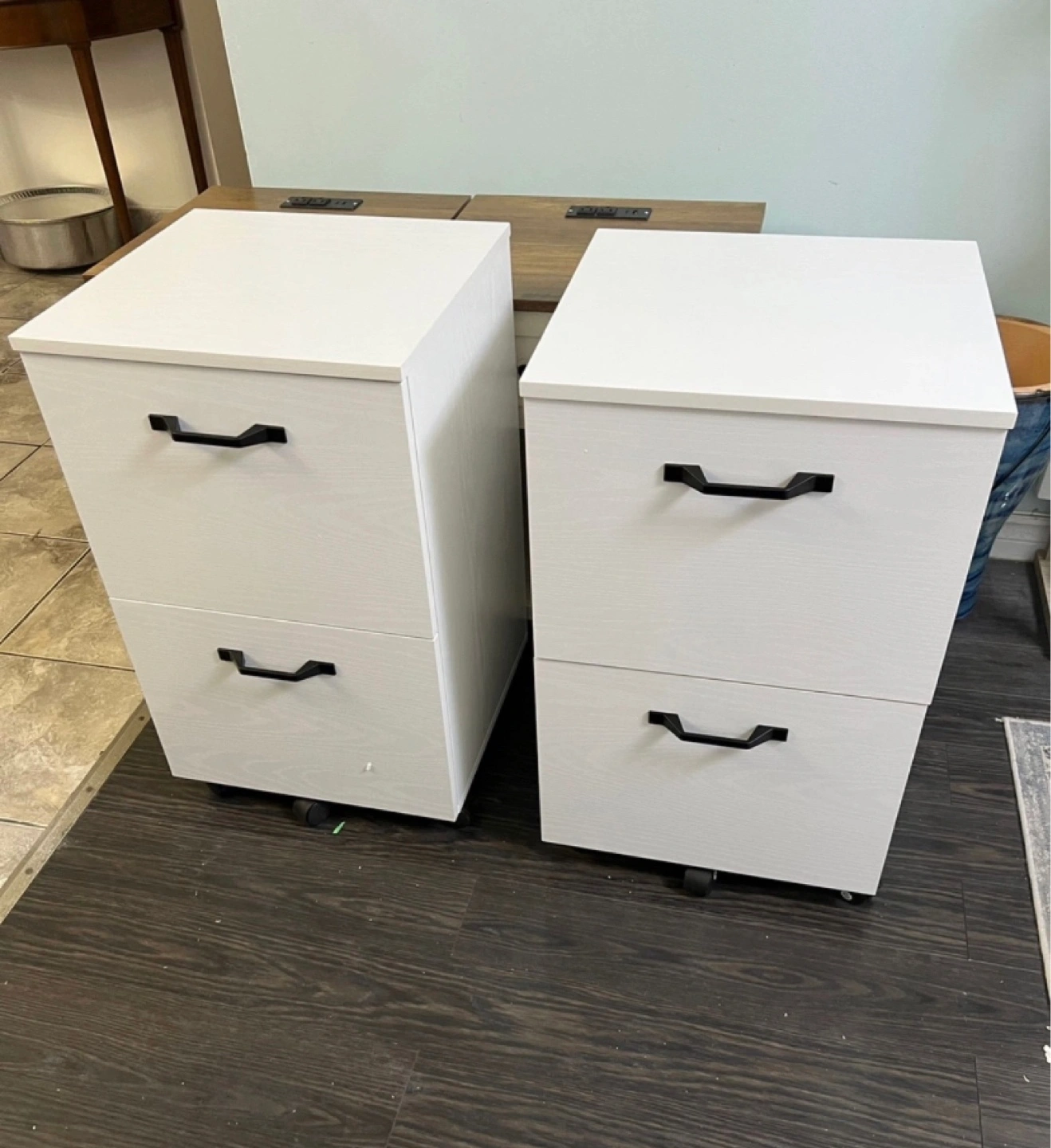 Two white file cabinets, each with two roomy drawers. Black handles. Mobile on casters. Great for office organization. Dimensions approximately 27.6"H x 16.5"W x 15.7"D.