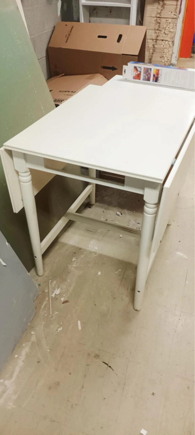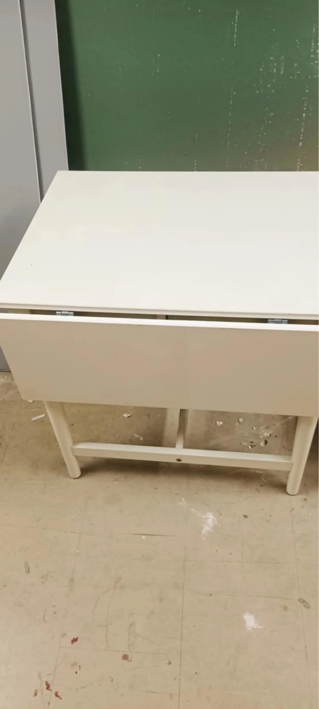 Small, white drop leaf table. Ideal for small spaces. Simple design. Good condition. Expanded size-117cm X 78cm Folded size-59cm X 58cm Pick up only Located near Eglinton Ave and Yonge