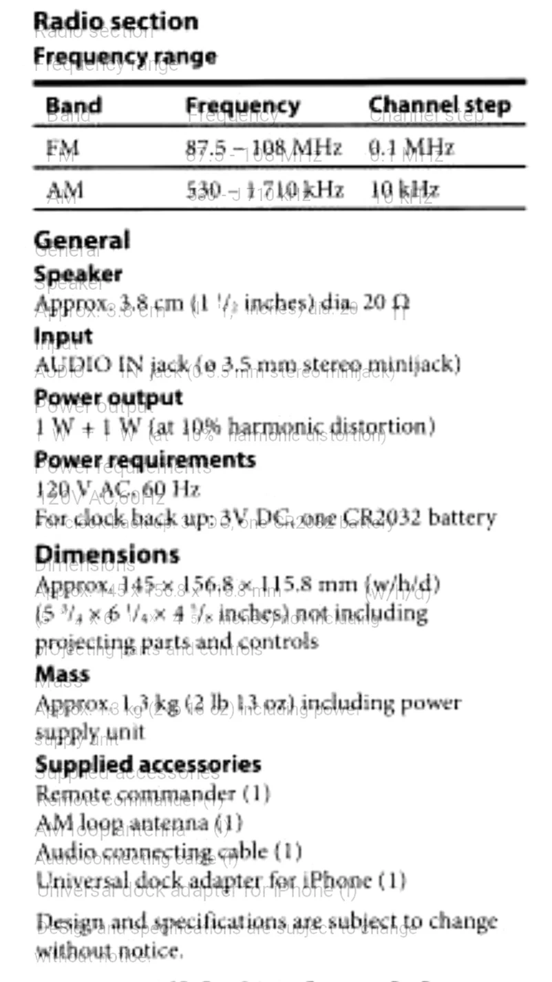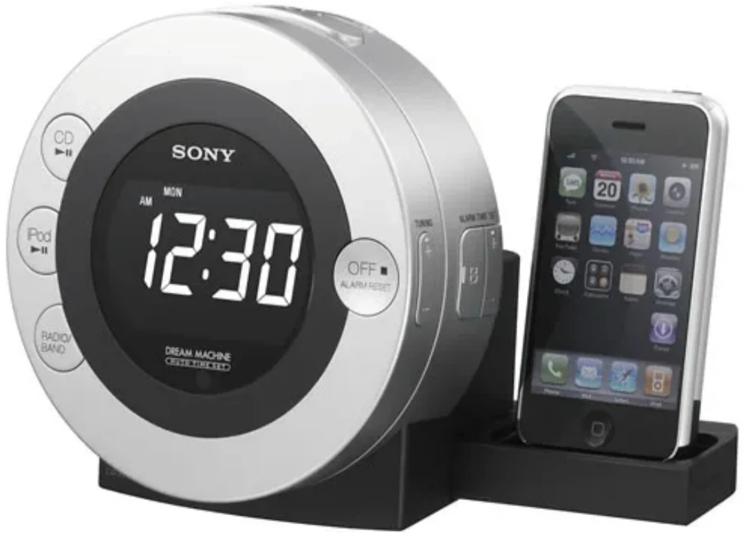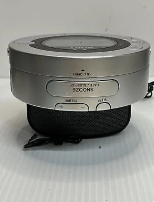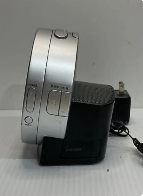 Sony Dream Machine Auto Time Set (model# ICF-CD3iP) is a dual alarm clock with snooze that contains a CD player, iPod/iPhone dock for playing your music and charging, AM/FM radio and his built in speakers (3.5 mm stereo with up to 1.641 output). Features include brightness control, 30 preset stations, automatic daylight savings, and extendable snooze. No power, no problem alarm that has a back up battery in case of power outages. Great used condition. The face measures 5.75" across and base is 4" deep. Made for iPod but works with iPhone. Compatible with iPod, iPod Classic, iPod (4th & 5th generation), iPod Mini, iPod Nano (1st, 2nd & 3rd generation), iPod Touch, and iPhone.