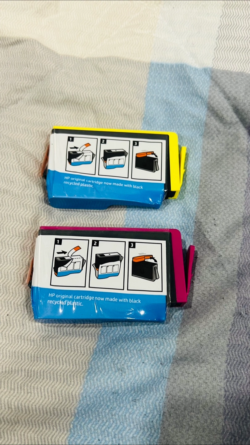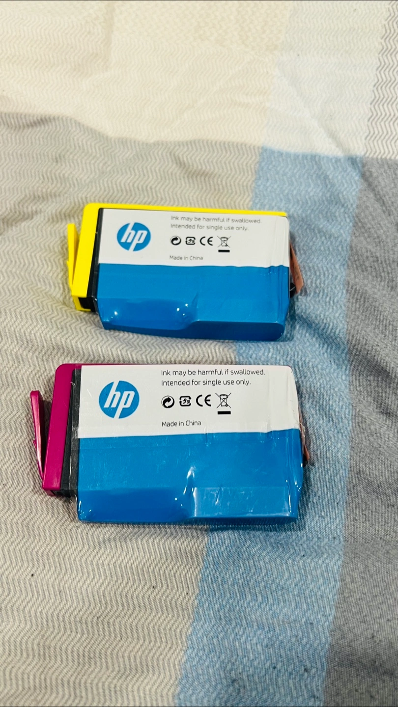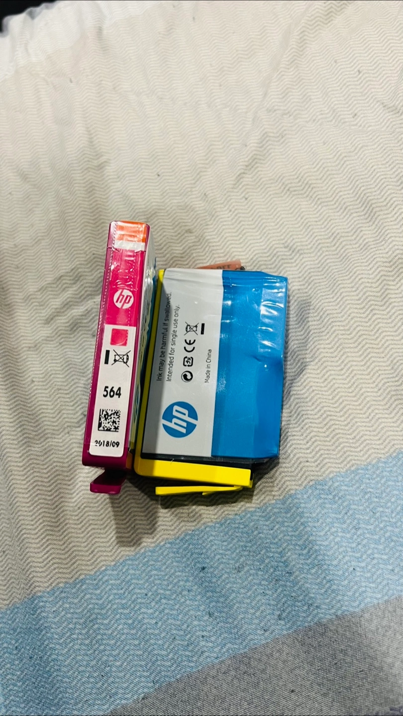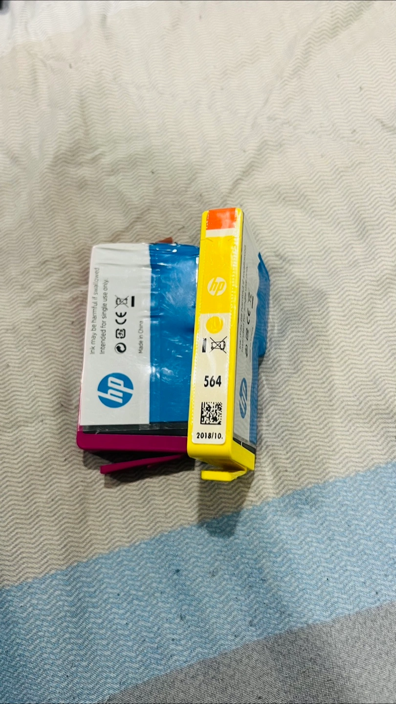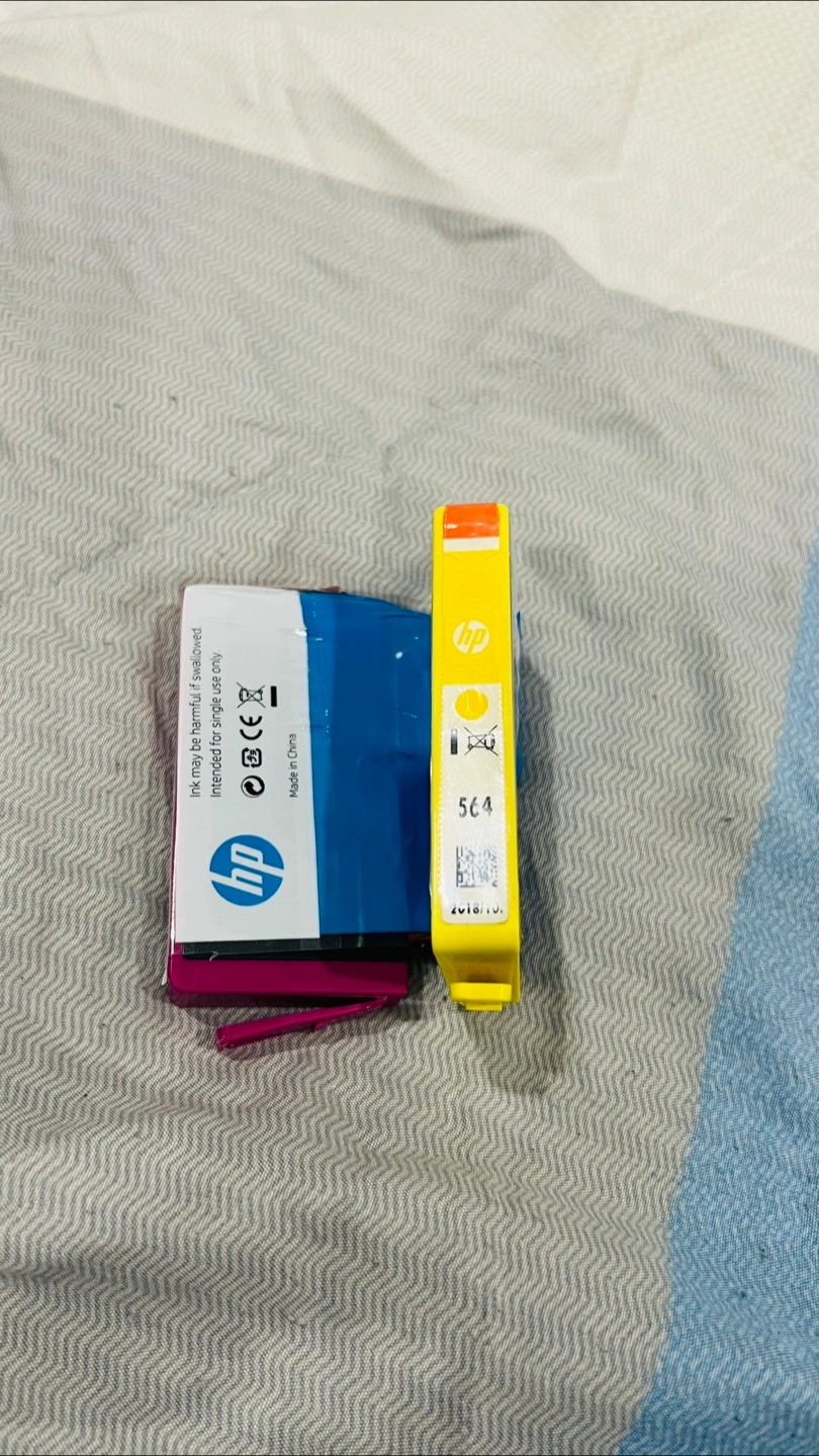 Two HP 564 ink cartridges. One yellow, one magenta. New, unopened. Intended for single use only.