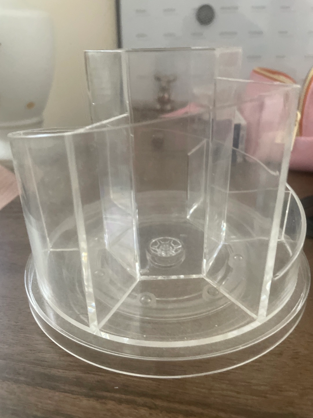Clear acrylic organiser. Rotating design. Multiple compartments. Perfect for makeup, jewellery or stationery.