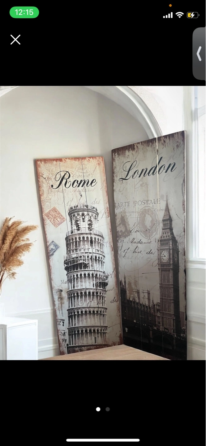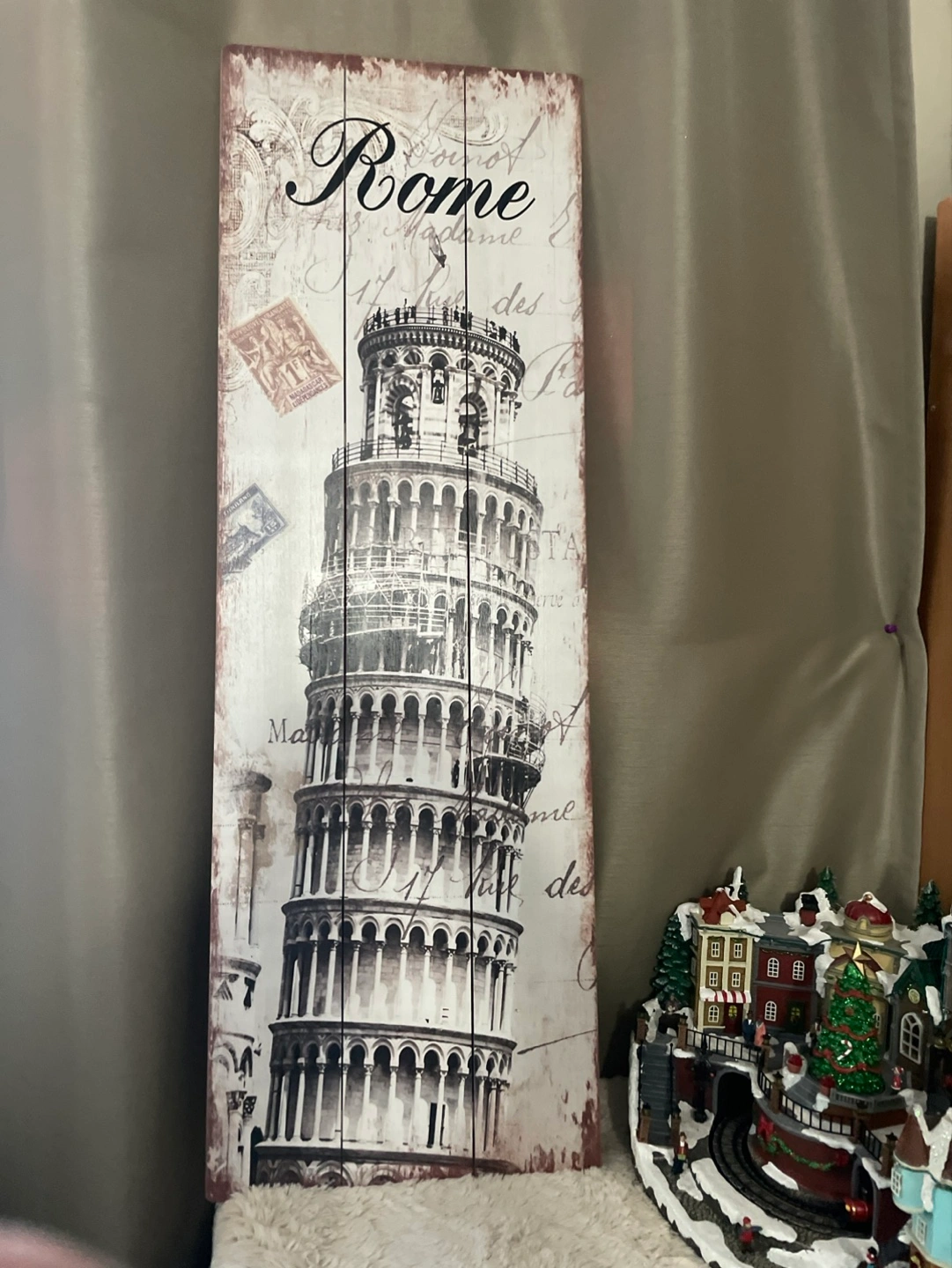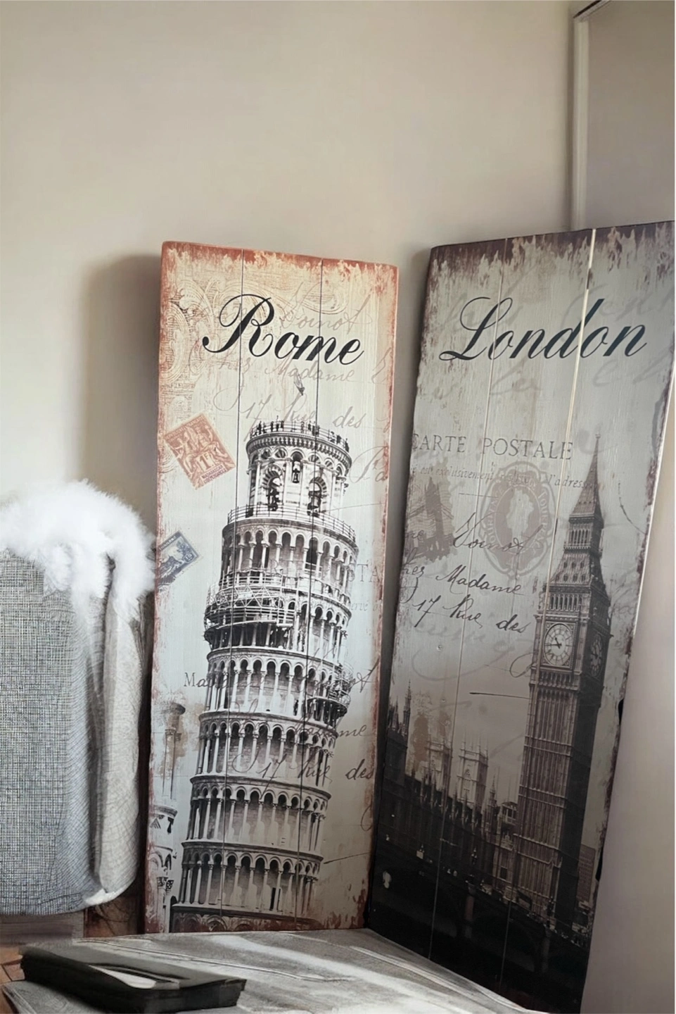 Set of two long, rectangular wall art panels. Features images of the Leaning Tower of Pisa and Big Ben. Vintage-style design. Wooden frame. Ready to hang or stand Pu Whitehorn
