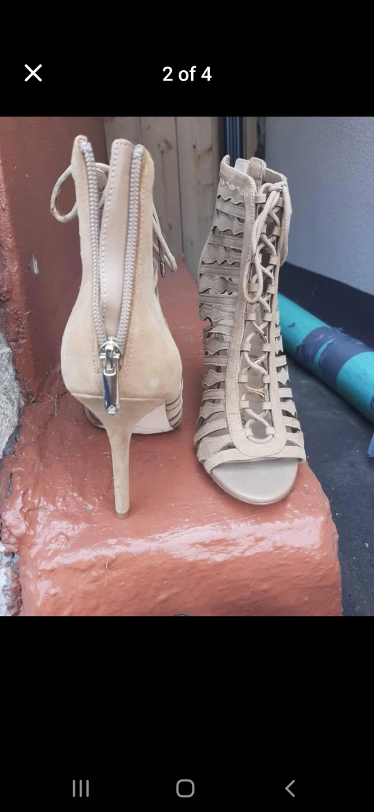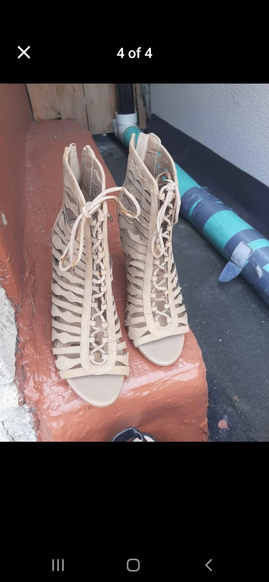 Stunning beige lace-up heels. Open toe and stiletto heel. Size 7. Back zipper.