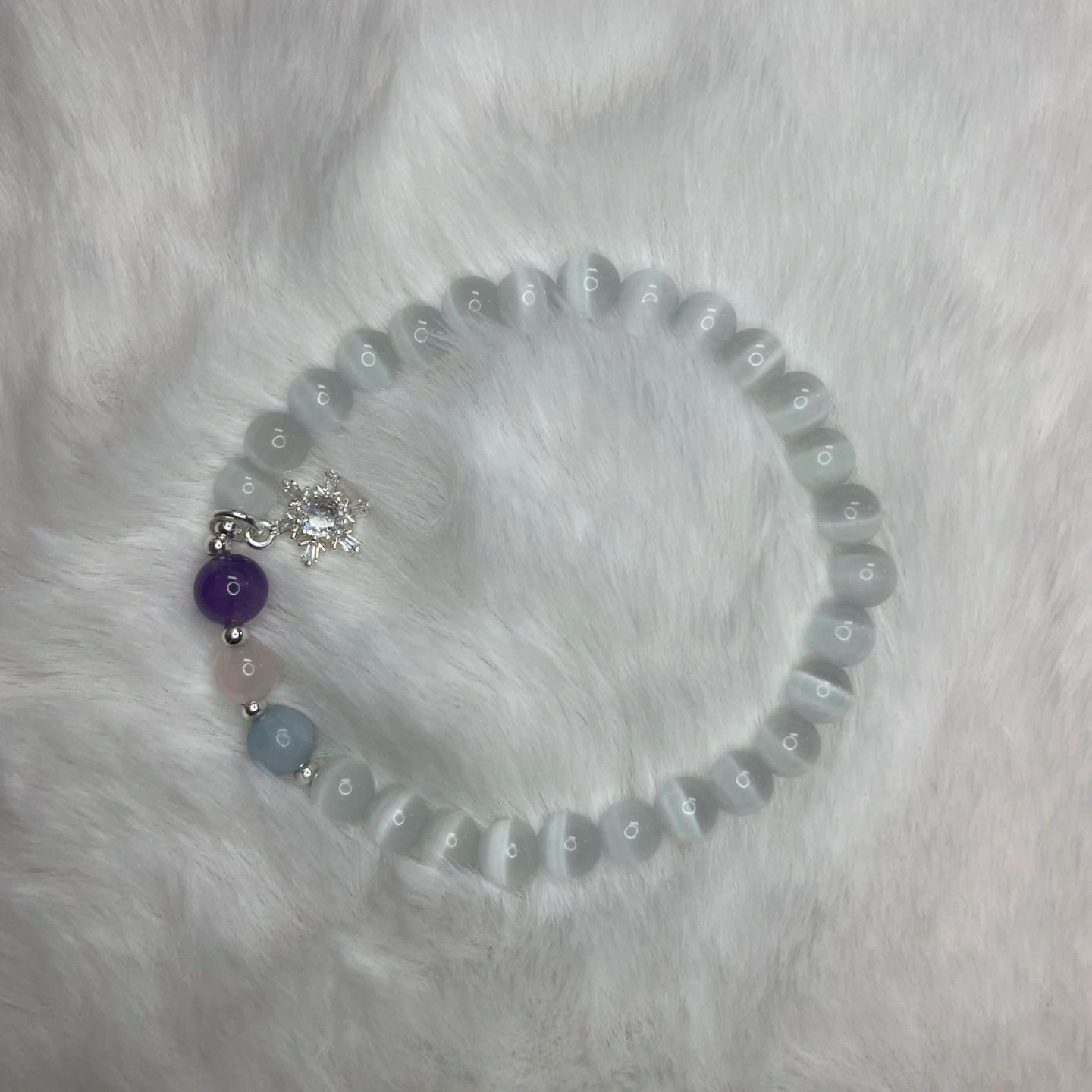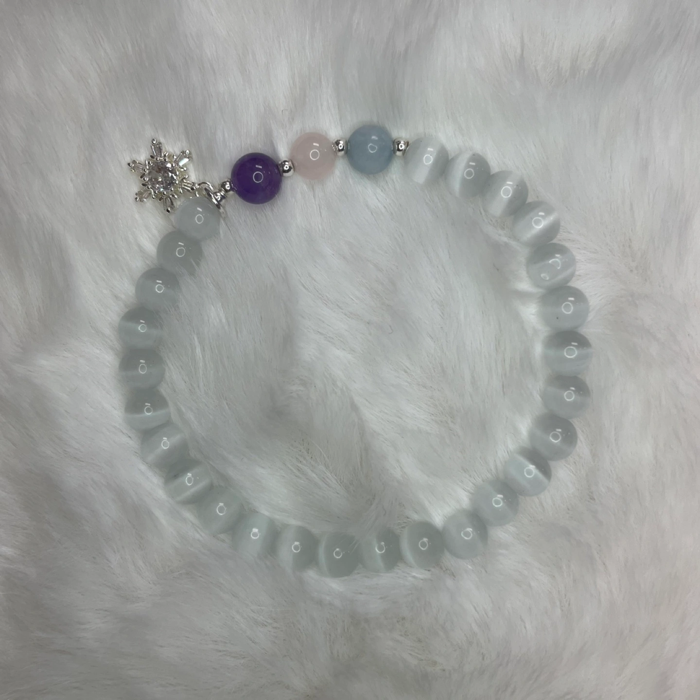 Beautiful bracelet featuring cat's eye beads, amethyst, rose quartz, and aquamarine accents. Silver snowflake charm. Stretch bracelet design for easy wear. Pickup locations are in Richmond Hill, Markham or DT Toronto. Delivery is also available