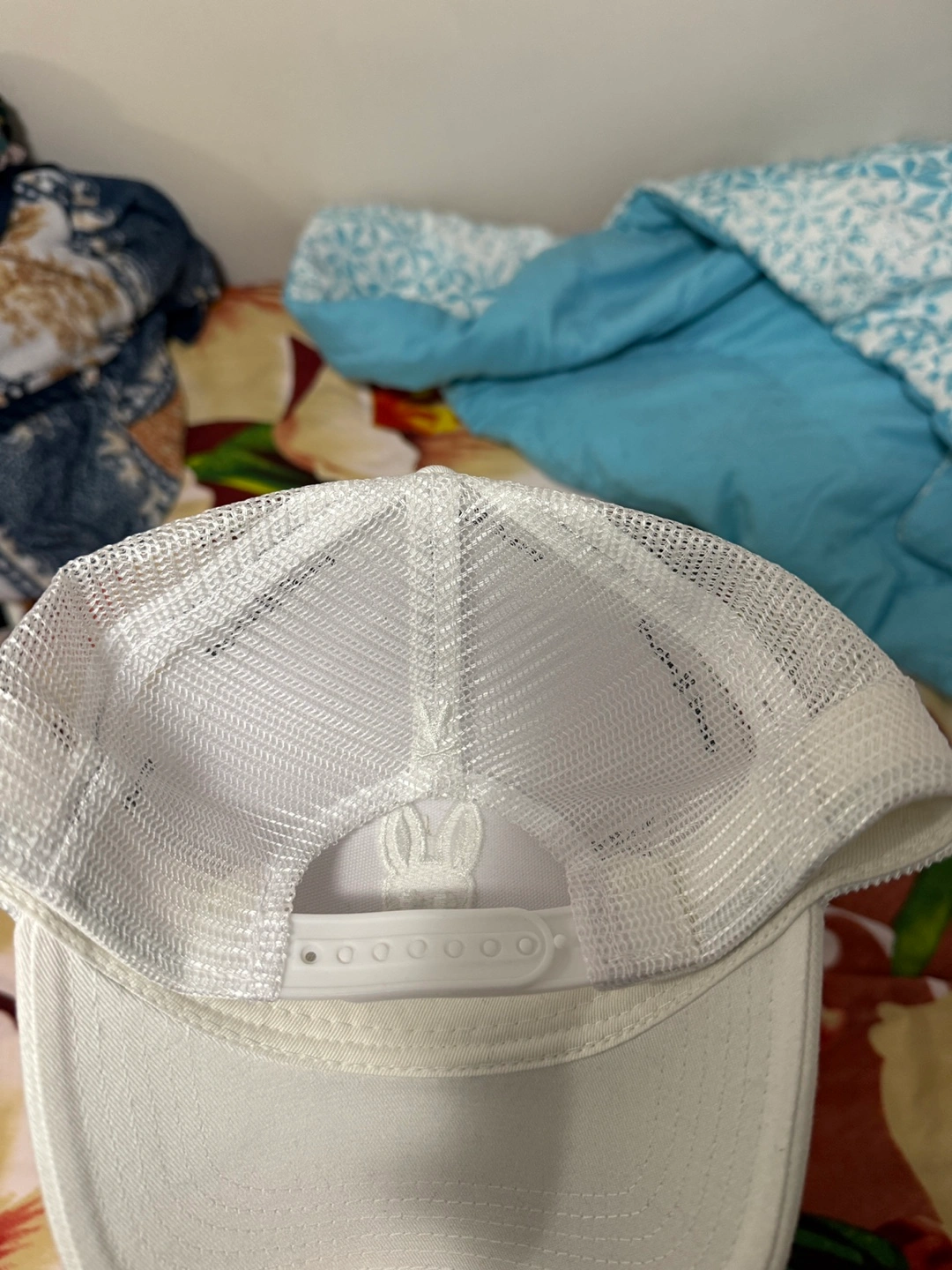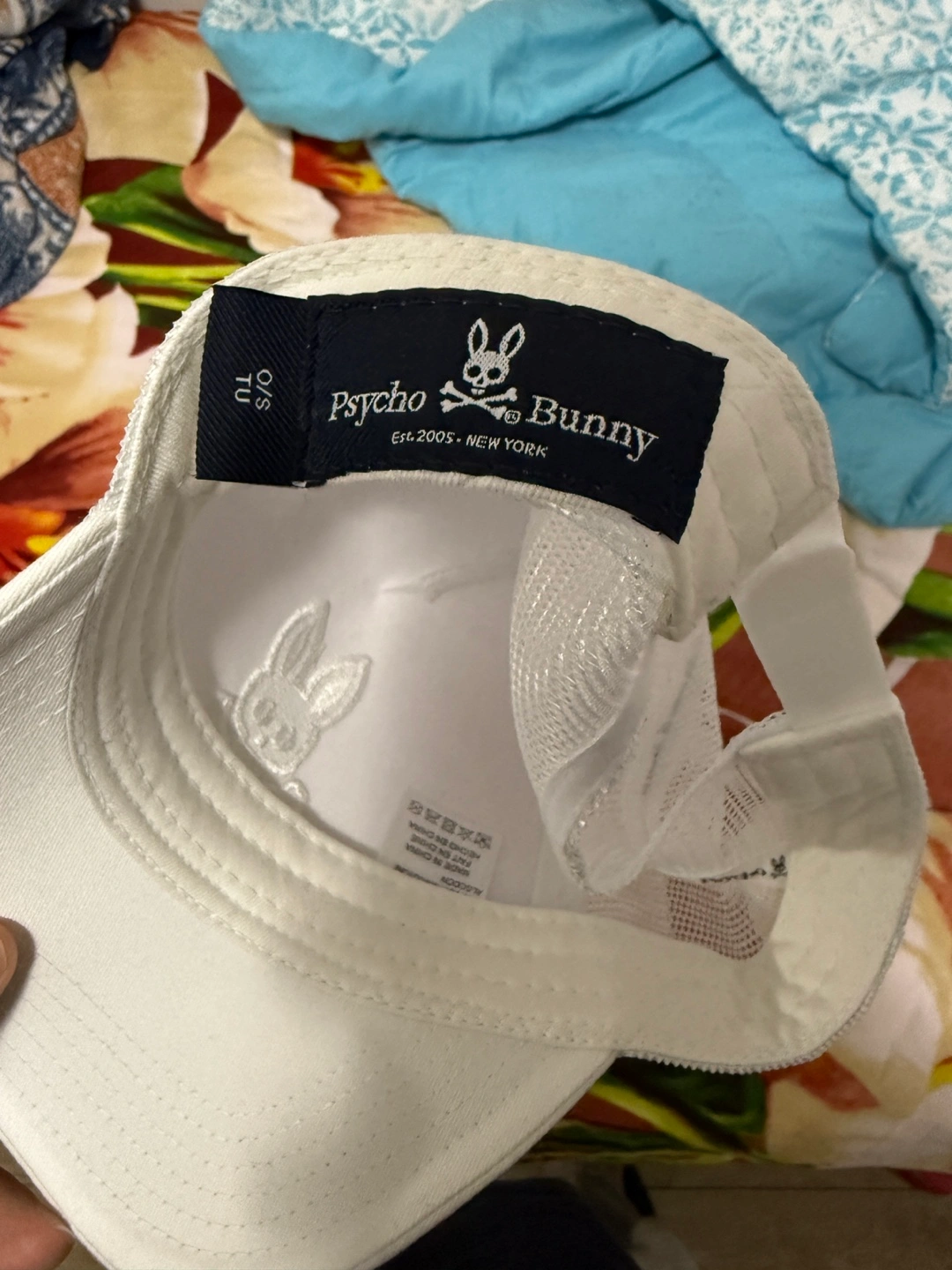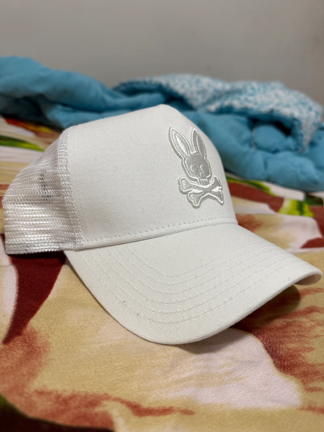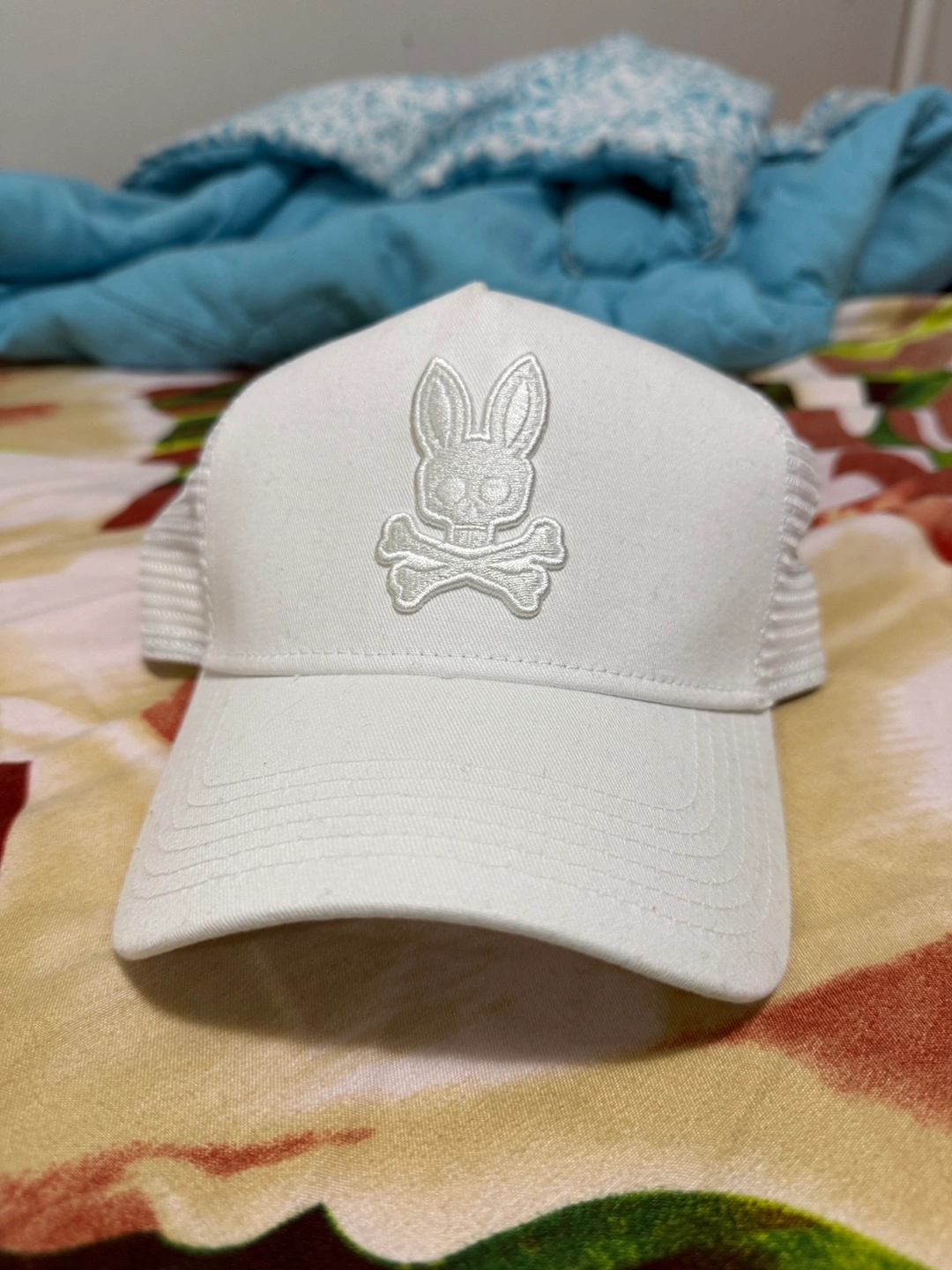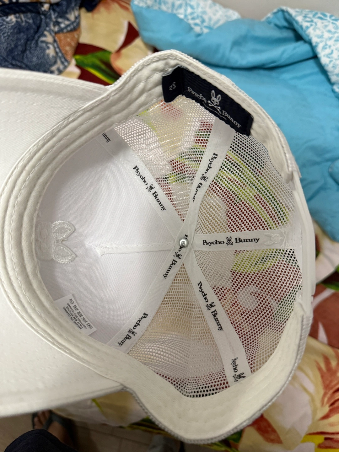 White Psycho Bunny trucker hat. Features a mesh back and embroidered logo. Adjustable sizing. Never used or worn. In great condition.