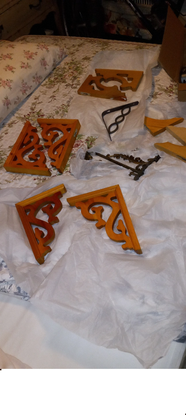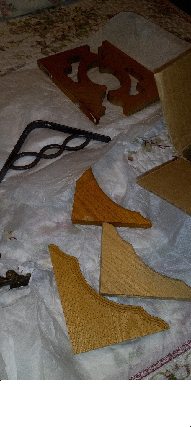 two Ikea unused white brackets, 6 hardware glass brackets, 2 nickel played 4×4 shelf brackets and 2 sets of oak brackets. plus 3 sets of hand finished clear pine brackets.