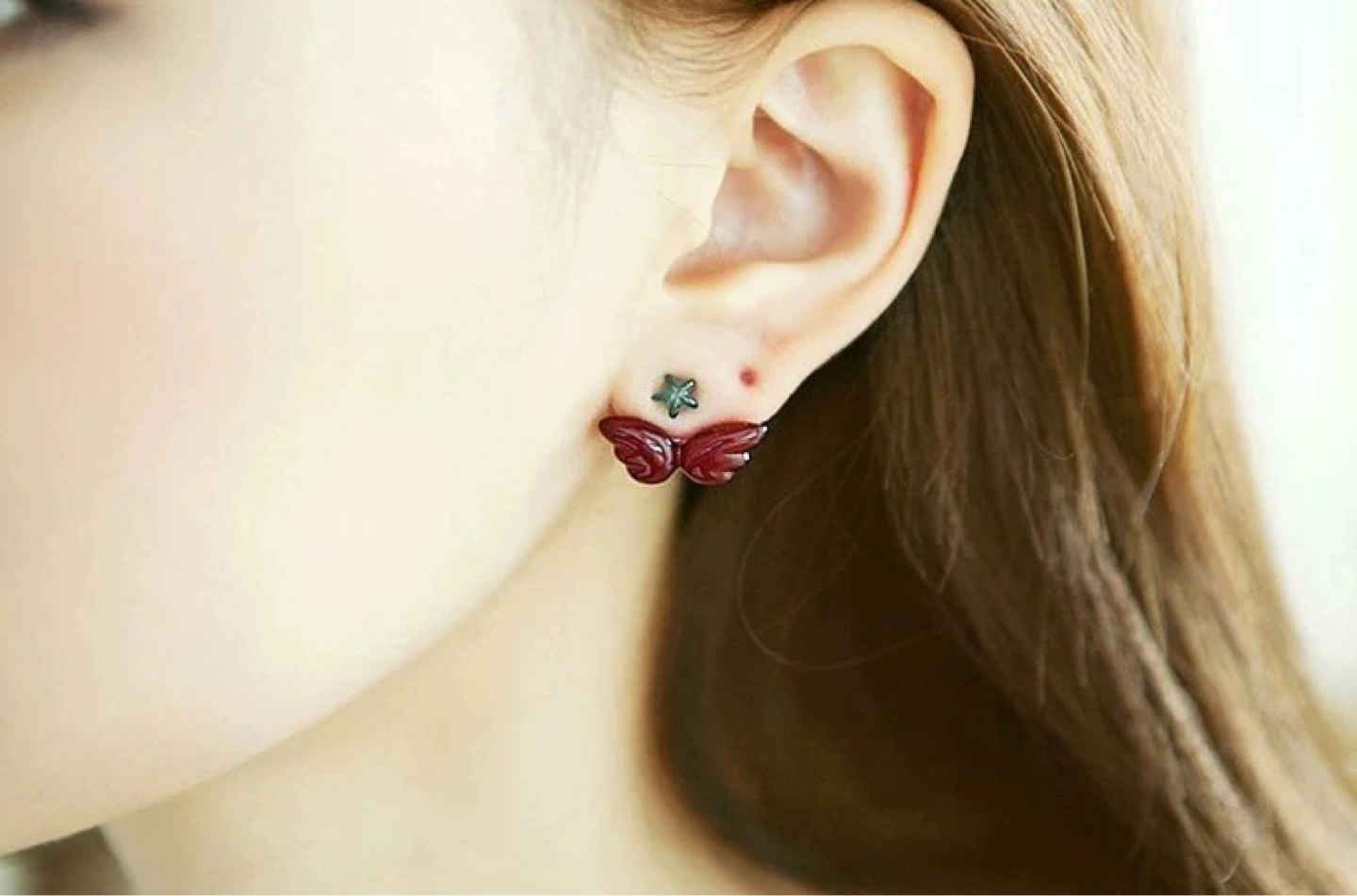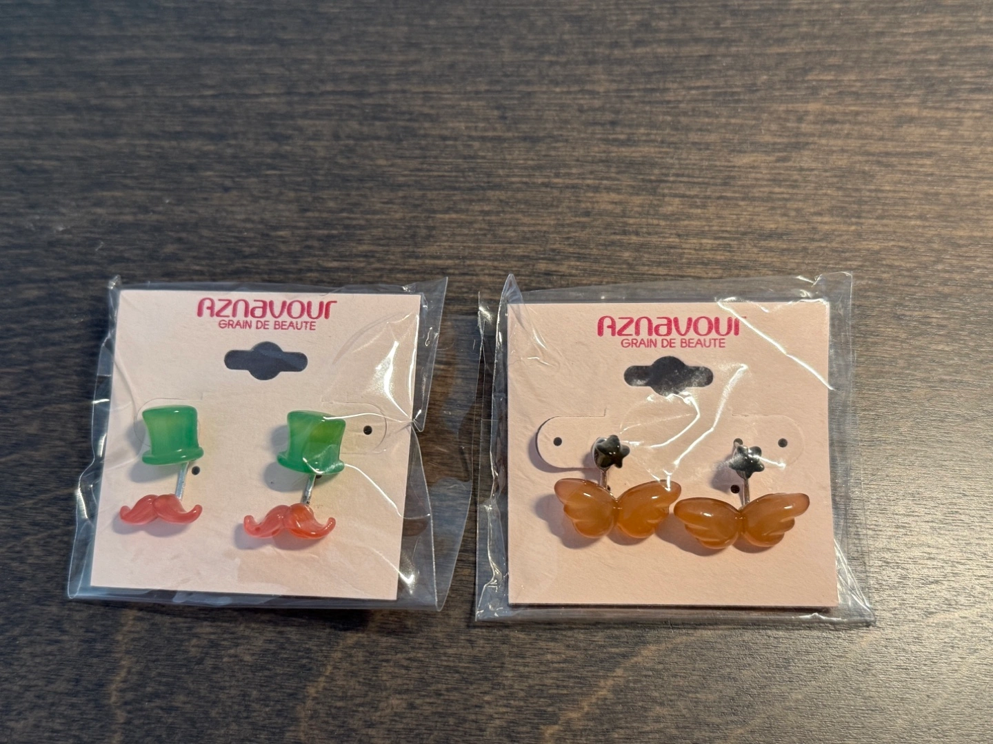 Aznavour Grain de Beauté earrings. One pair features green top hats and red mustaches. The other pair features orange butterflies. New, never worn. $15 each pair