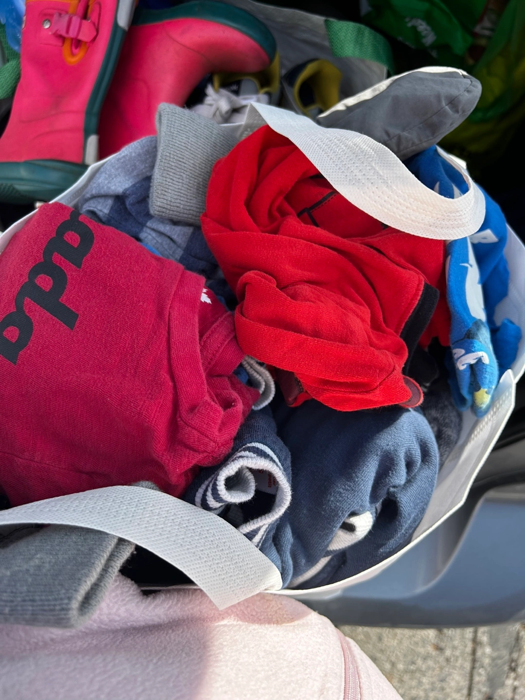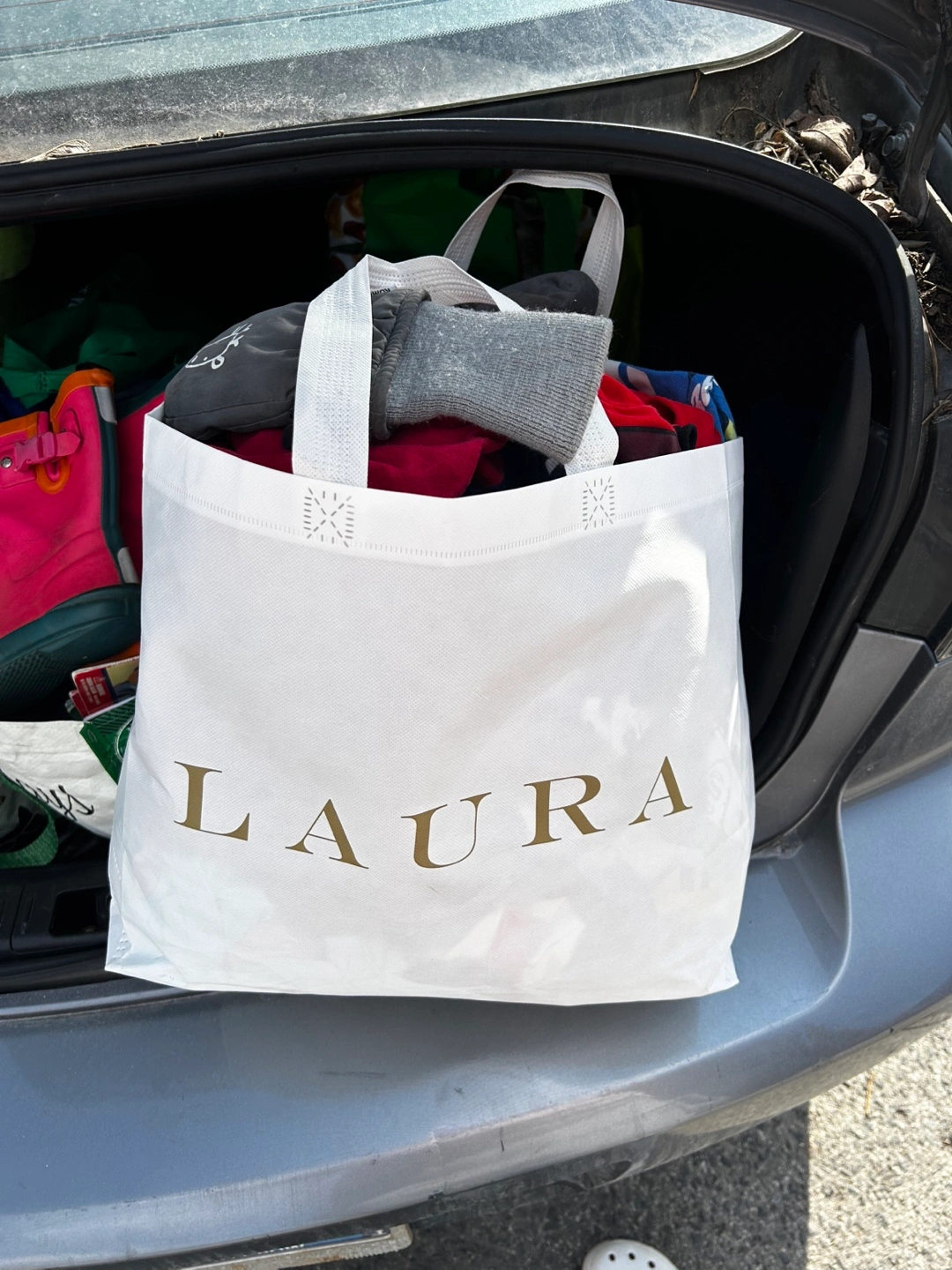 Large white Laura tote bag. Contains various kids clothes. Mostly red, navy, and grey. Great for organizing or carrying items. #freecycle 🎀Bundle items for discounts when purchasing more then one item🎀