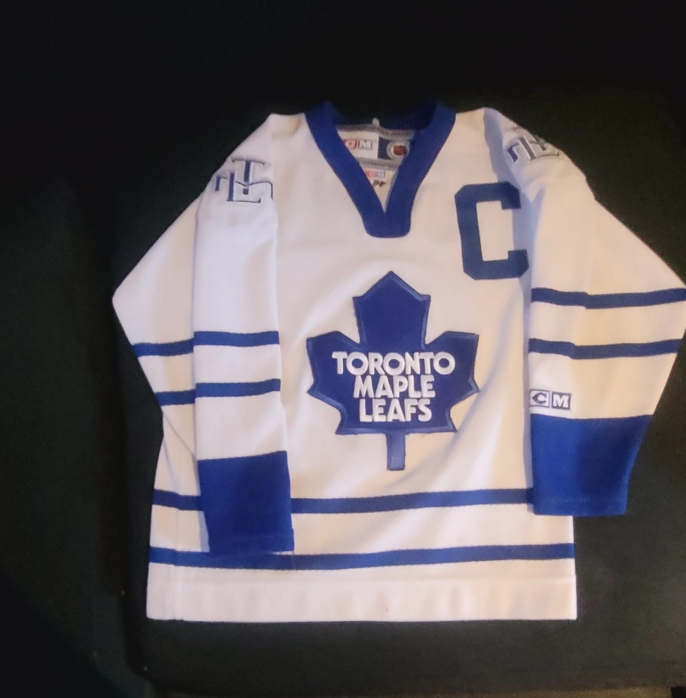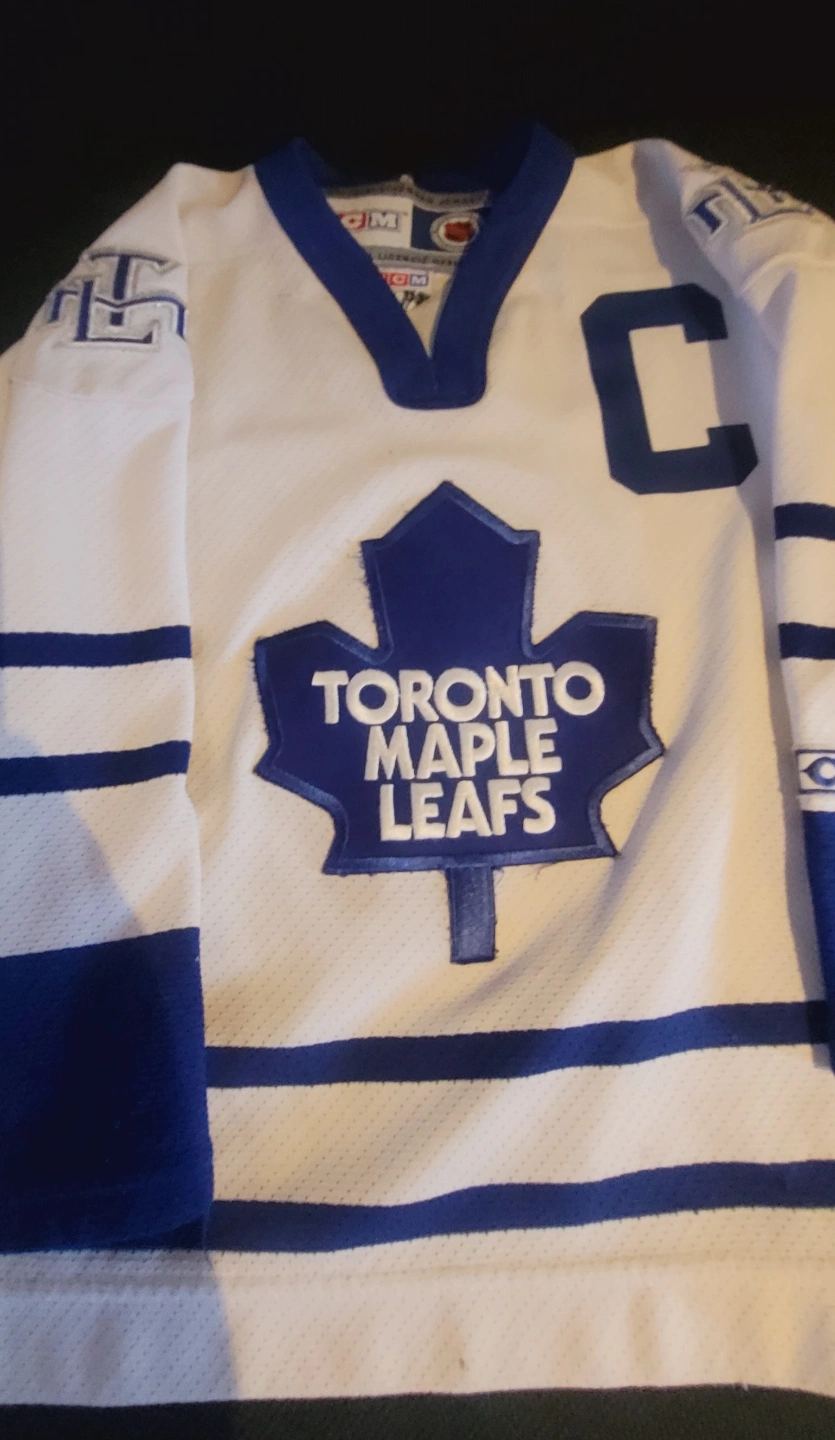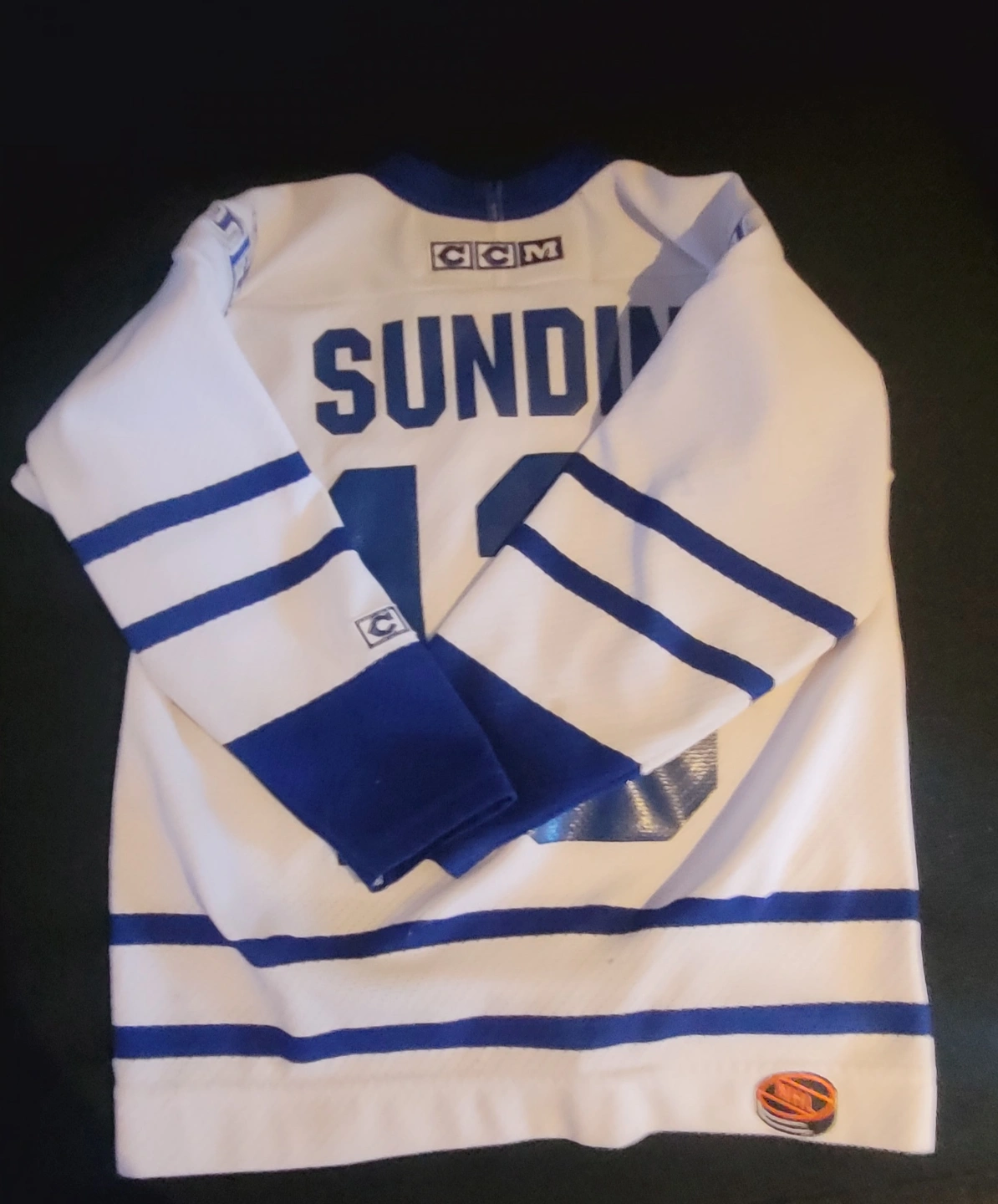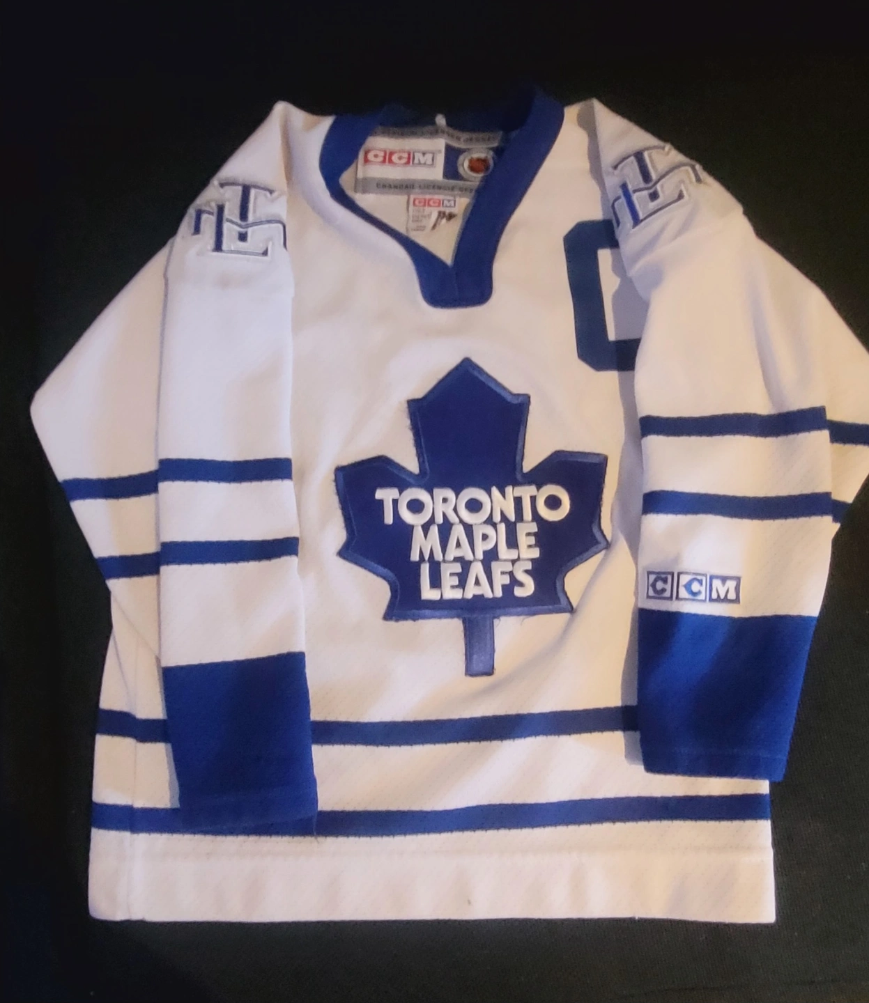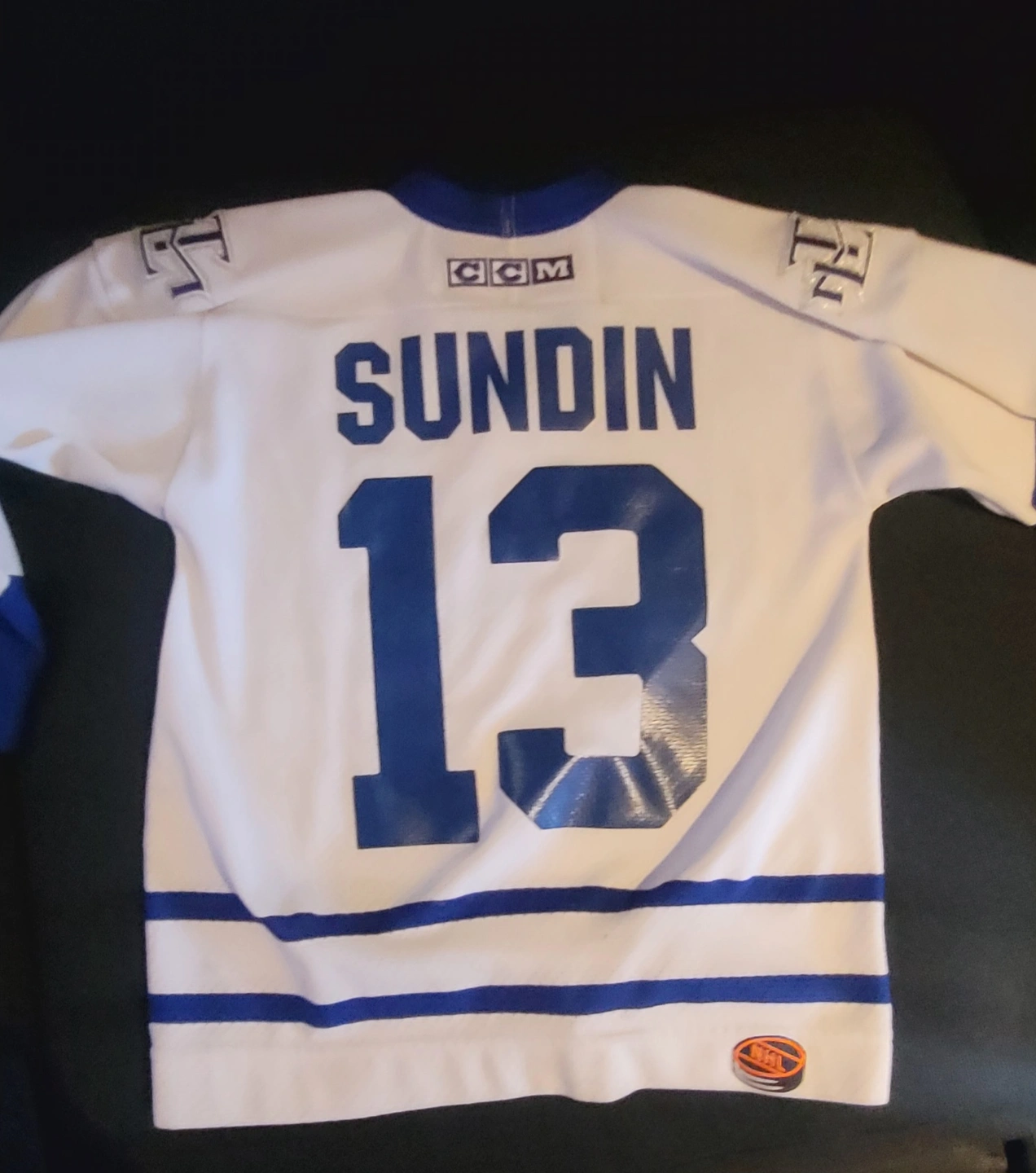 Vintage Toronto Maple Leafs hockey jersey. Features Mats Sundin #13 on the back. CCM brand. White with blue stripes and lettering.