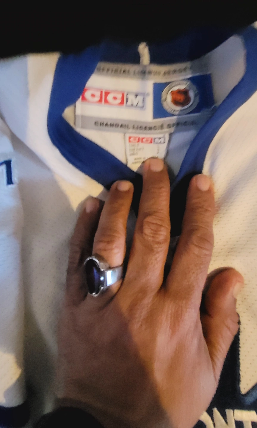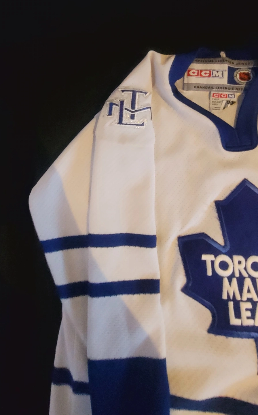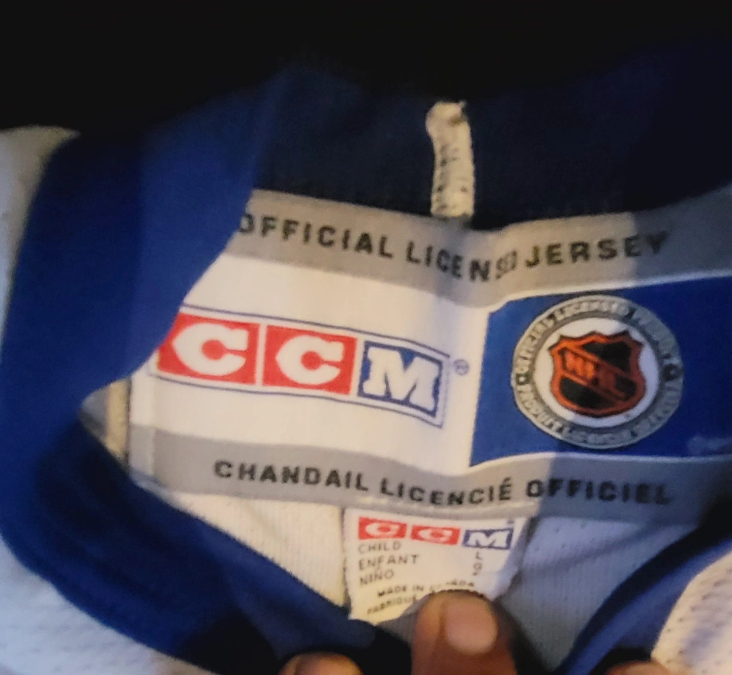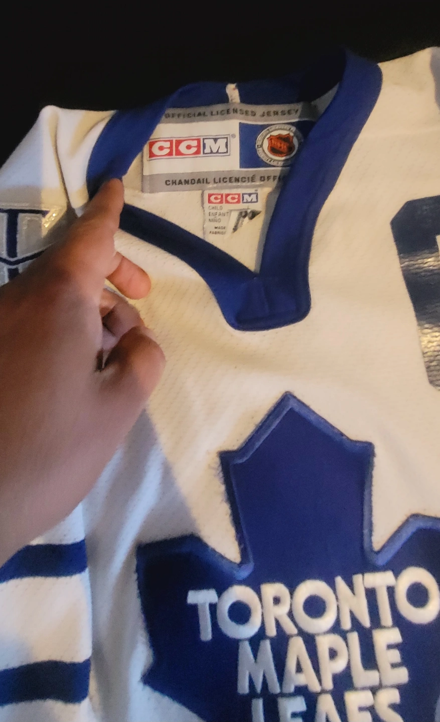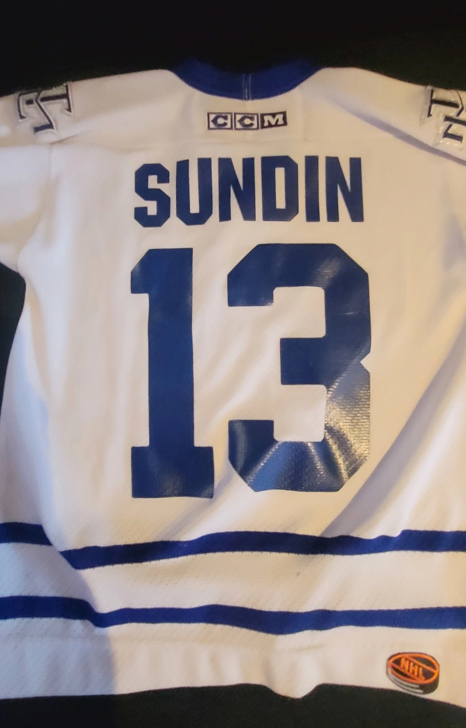 Vintage Toronto Maple Leafs hockey jersey. Features Mats Sundin #13 on the back. CCM brand. White with blue stripes and lettering.
