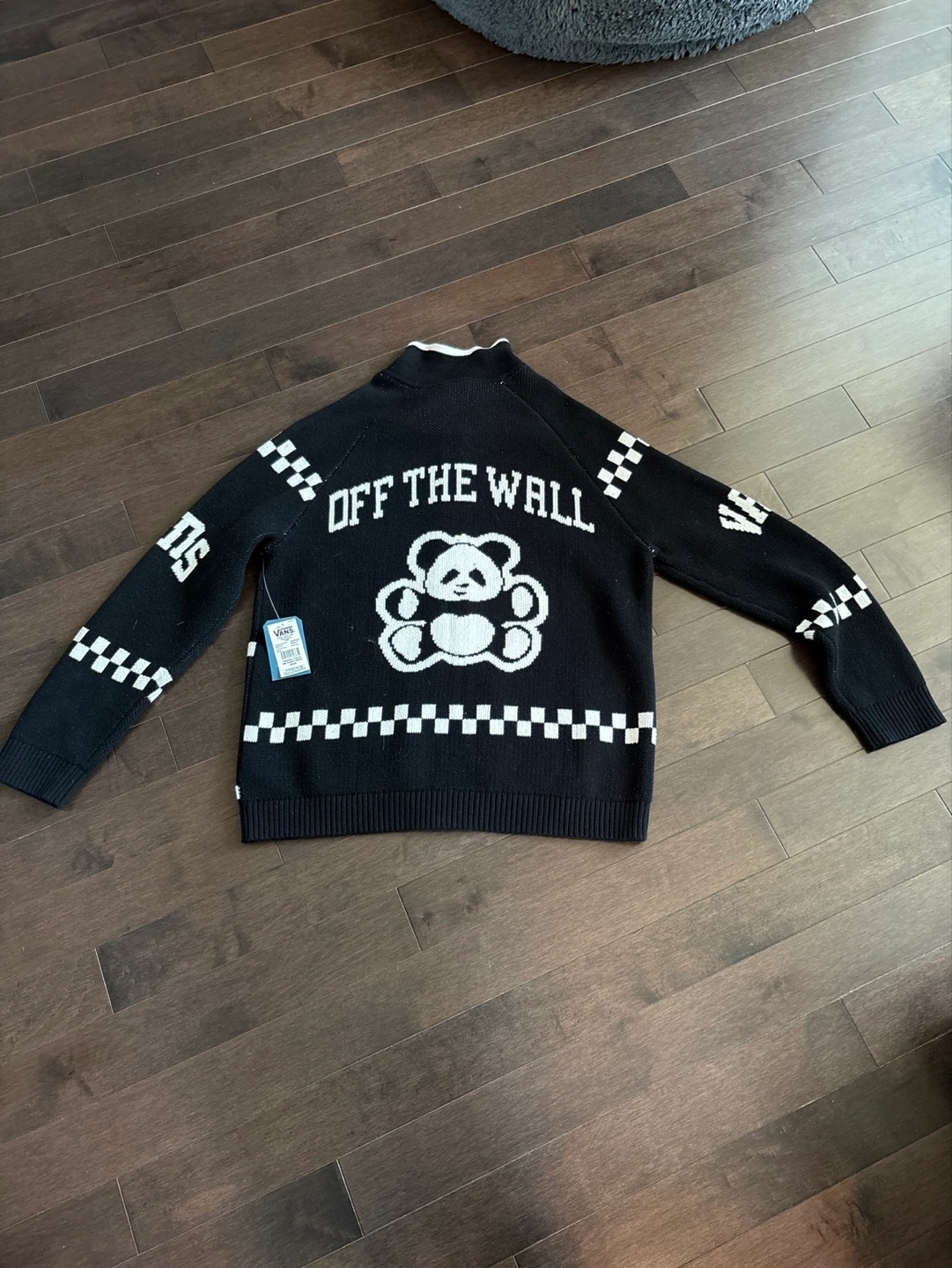 Black and white zip-up sweater. Features panda graphic and checkerboard pattern. Size XXS. New with tags. Never worn.