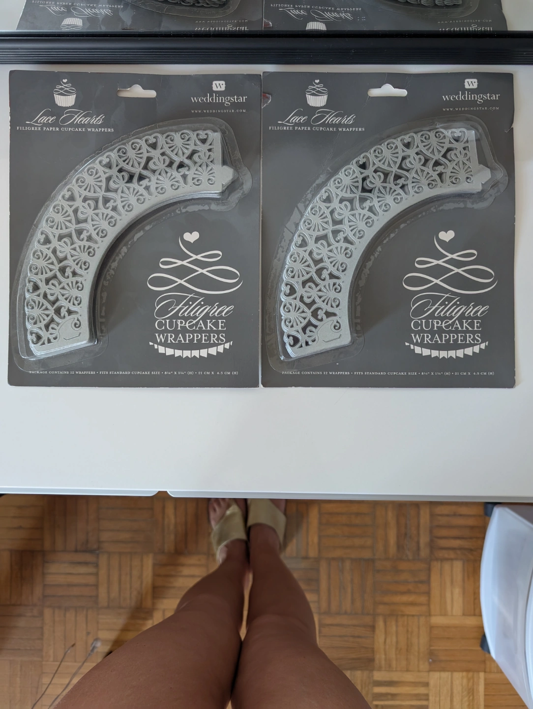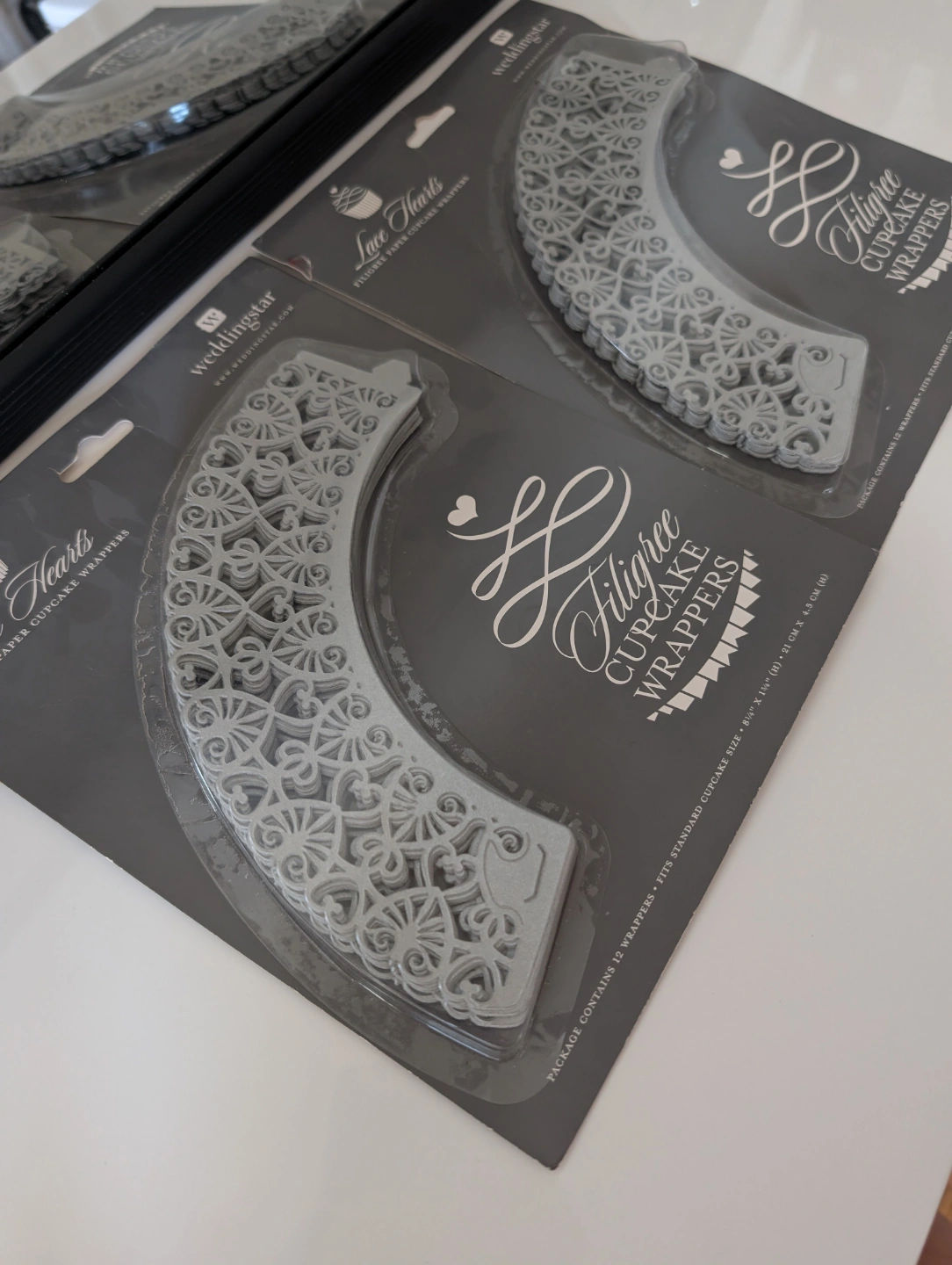 2 Packages of 12 silver filigree cupcake wrappers. Standard size fits cupcakes 8 1/4" x 13/4" (H). Adds elegance to any occasion🧁 $3 for 2 packages (24 wrappers) Pick up at the location on the map⬇️ Exact amount of cash only please 🌸